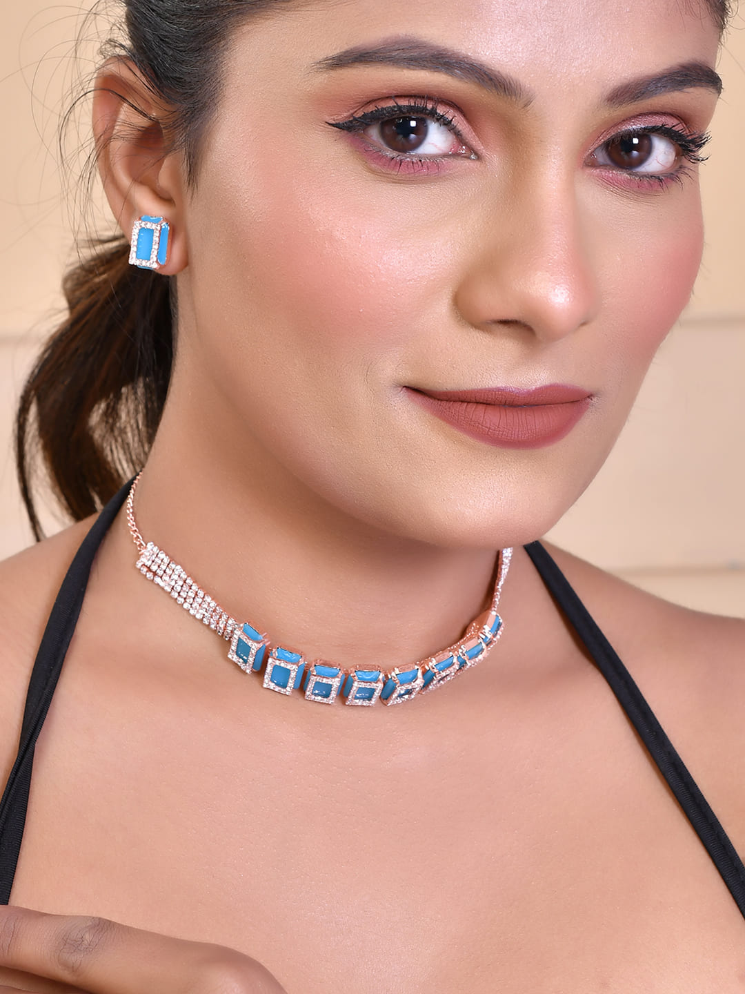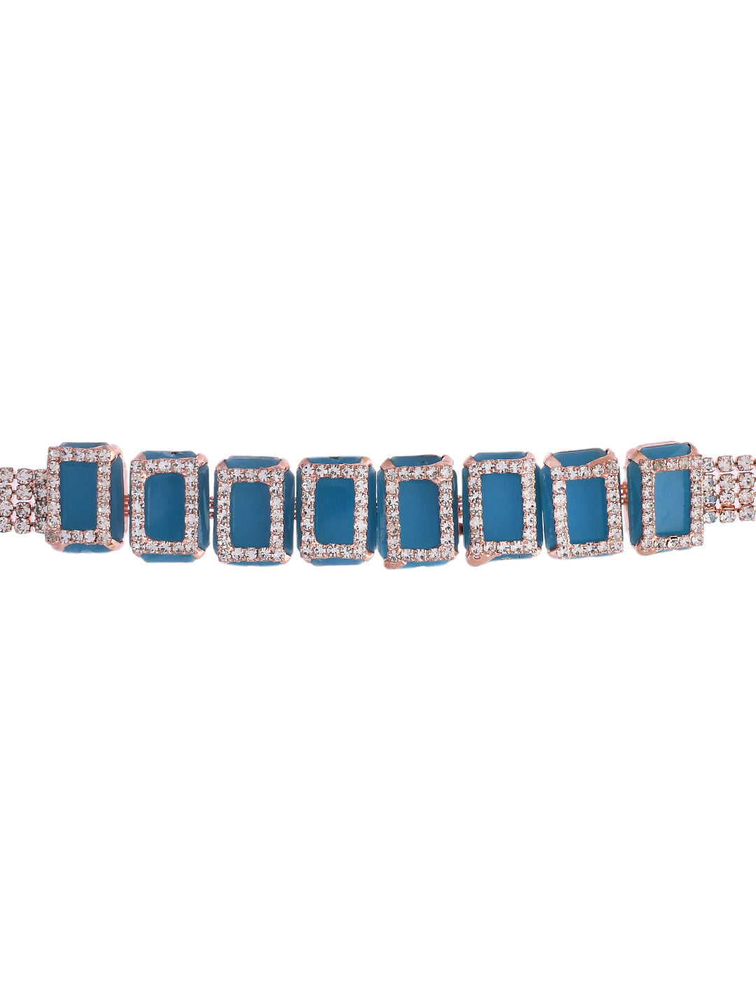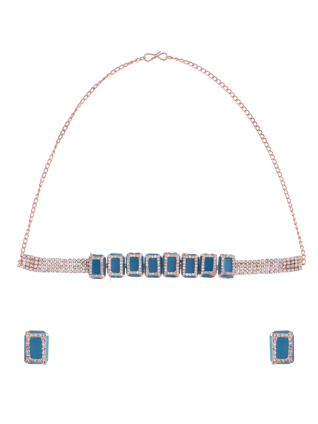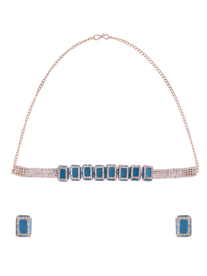 Elevate Your Elegance With Our Rose Gold Plated American Diamond Blue Cubic Studded Jewellery Set. Crafted To Perfection, This Set Exudes Timeless Sophistication. Each Piece Features Exquisite Blue Cubic Zirconia Stones Intricately Set In Rose Gold-Plated Settings, Exuding Luxury And Charm. Perfect For Adding A Touch Of Glamour To Any Ensemble, This Set Is A Must-Have Addition To Your Jewelry Collection.
