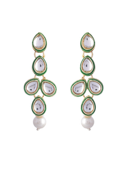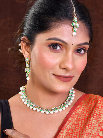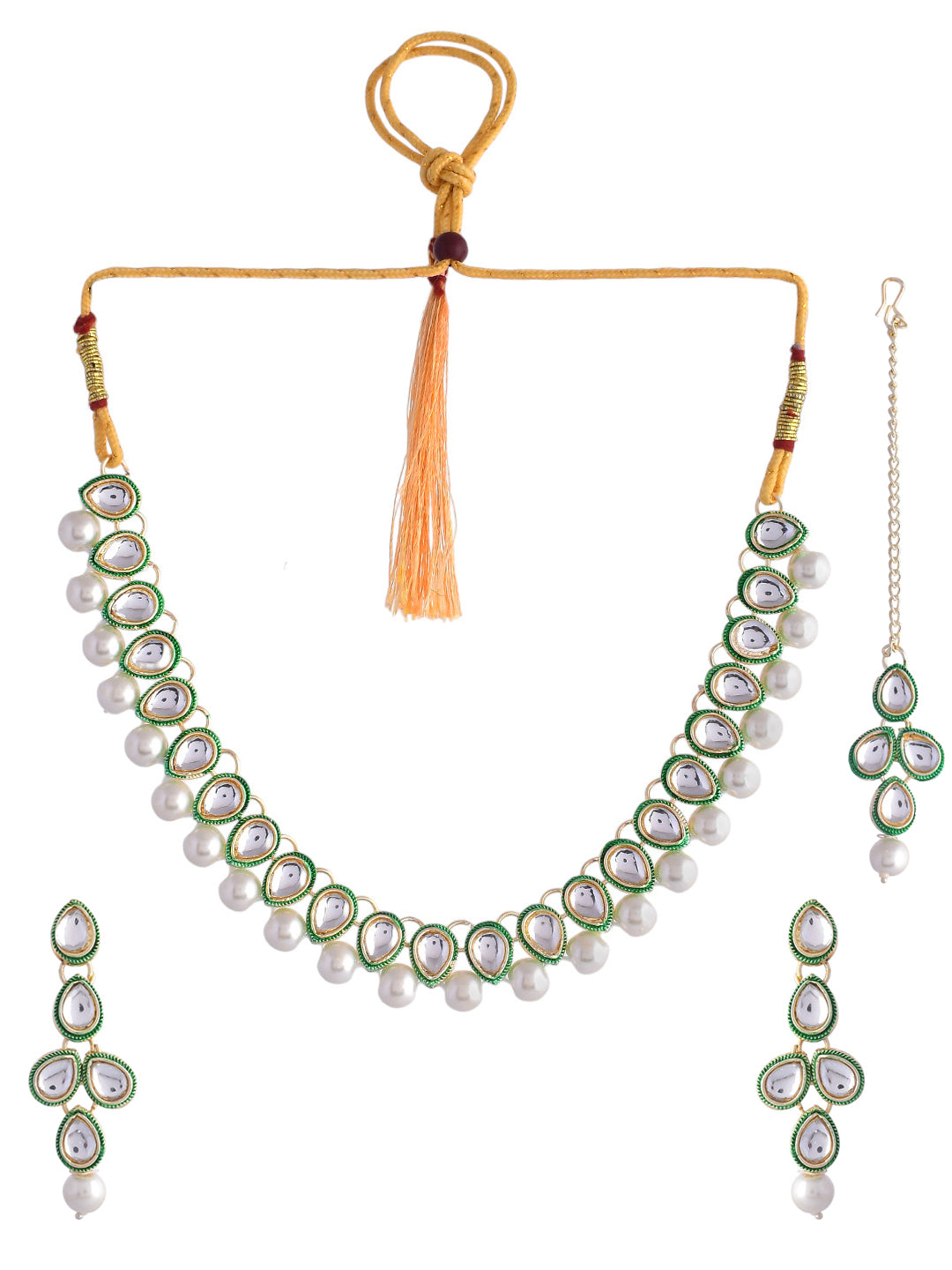 Experience The Epitome Of Sophistication With Our White Pearl Kundan Necklace And Earring Set, Complete With A Mang Tikka. Impeccably Crafted, This Set Showcases Lustrous White Pearls And Intricate Kundan Work, Exuding Timeless Elegance. The Matching Mang Tikka Adds A Touch Of Regal Charm. Elevate Your Ensemble With This Exquisite Jewelry Set, Perfect For Weddings, Parties, And Special Occasions.
