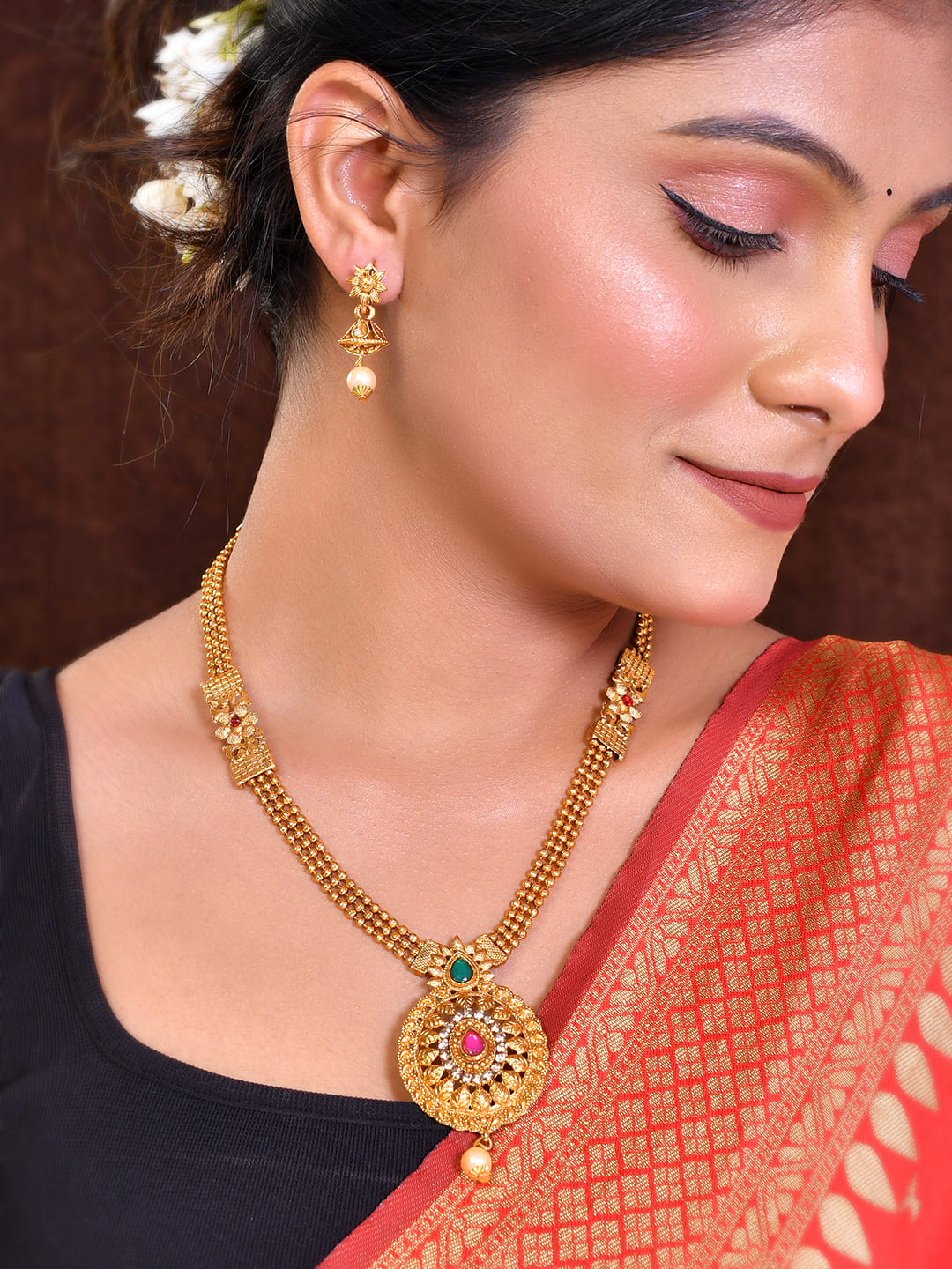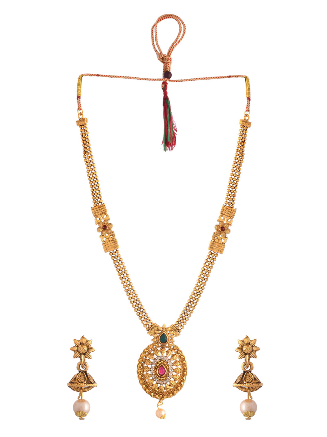 Introducing Our Gold-Plated Long Necklace With Earrings Jewellery Set, A Timeless Addition To Your Collection. Crafted With Precision, This Set Features A Stunning Long Necklace Adorned With Intricate Detailing, Complemented By Matching Earrings. The Gold-Plated Finish Adds A Touch Of Elegance, Making This Set Perfect For Both Casual And Formal Occasions. Elevate Your Style With This Versatile And Chic Jewellery Set.