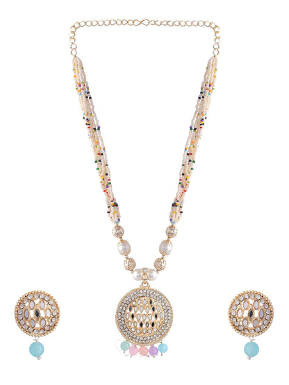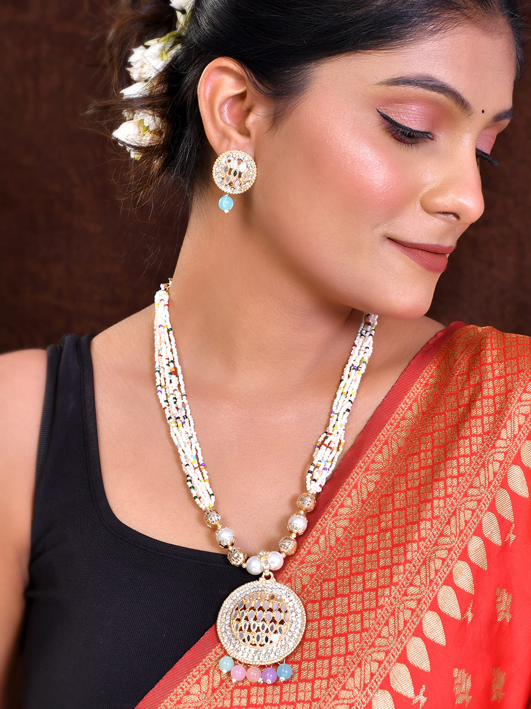 Introducing Our Enchanting Gold-Plated And White Pearl Kundan Multi-Color Beaded Jewellery Set, A Blend Of Opulence And Charm. This Set Features Intricately Designed Pieces With A Combination Of White Pearls, Kundan Accents, And Multi-Color Beads, Creating A Mesmerizing And Vibrant Look. The Gold-Plated Finish Adds A Touch Of Luxury, While The Matching Earrings Complete The Ensemble With Elegance. Elevate Your Style With This Versatile And Eye-Catching Jewellery Set, Perfect For Adding A Statement To Any Outfit.
