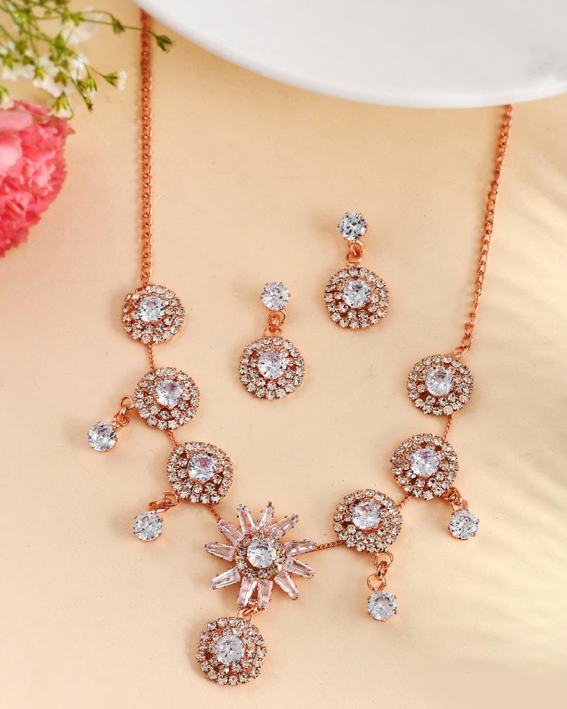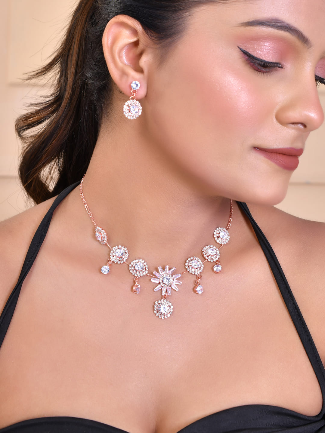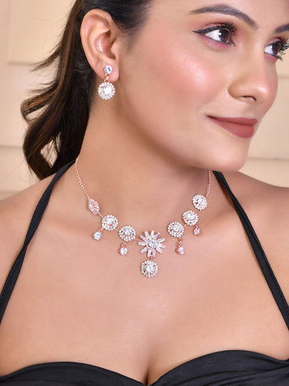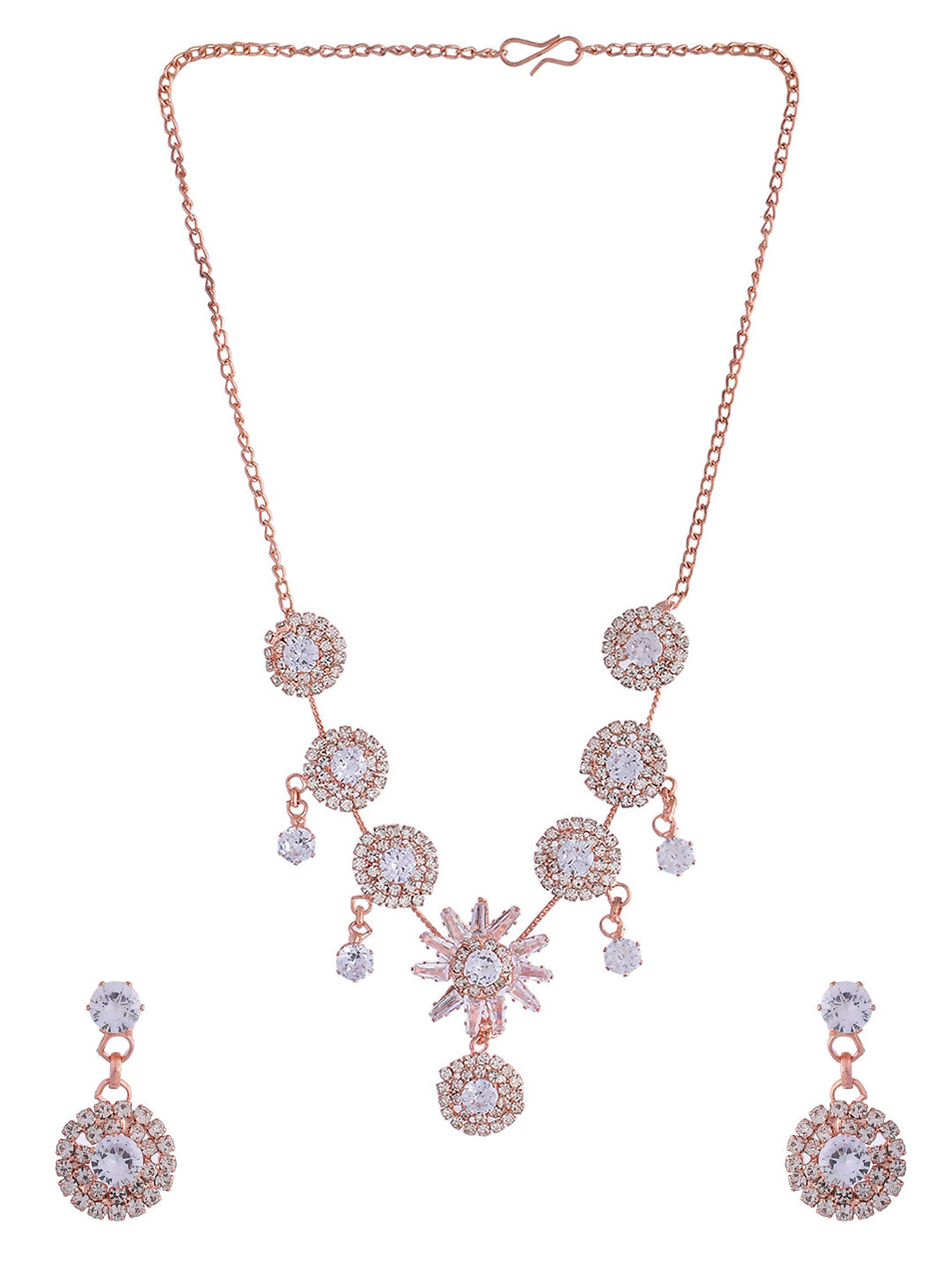 Introducing Our Captivating Rose Gold Plated White American Diamond Jewellery Set, A Symbol Of Understated Luxury. Crafted With Precision, Each Piece Features Brilliant White American Diamonds Intricately Set In A Rose Gold-Plated Base, Exuding Elegance And Sophistication. The Set Includes A Necklace And Matching Earrings, Perfect For Adding A Touch Of Glamour To Any Ensemble. Elevate Your Style With This Timeless Jewellery Set, Suitable For Both Formal Events And Everyday Wear.
