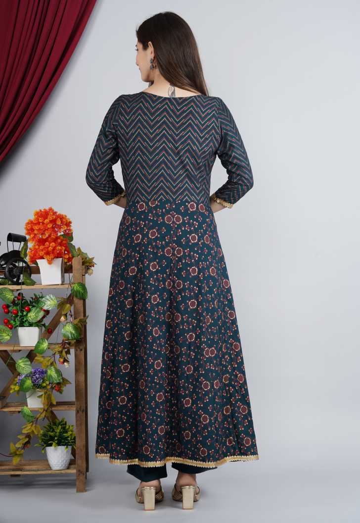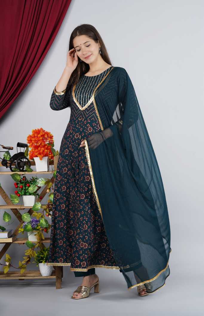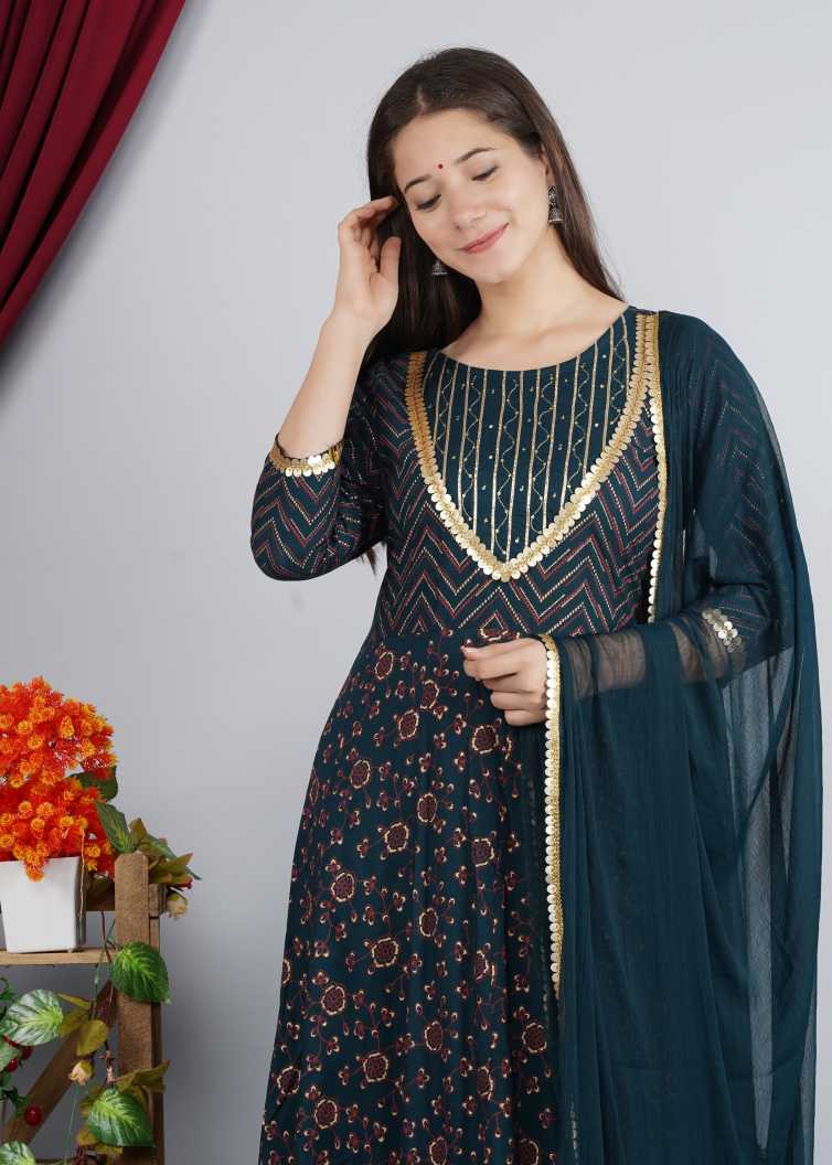 Trendia Brings You Thisâ Women Kurta And Palazzo Set Rayon From Noz2Toz. Made Of Rayon, This Set Includes A Kurta, A Palazzo, And A Dupatta. The Kurta Has A Round Neck And Is Ankle Length With 3/4Th Sleeves. It Has Golden Embellishments Which Pair Beautifully With The Dark Blue Fabric.