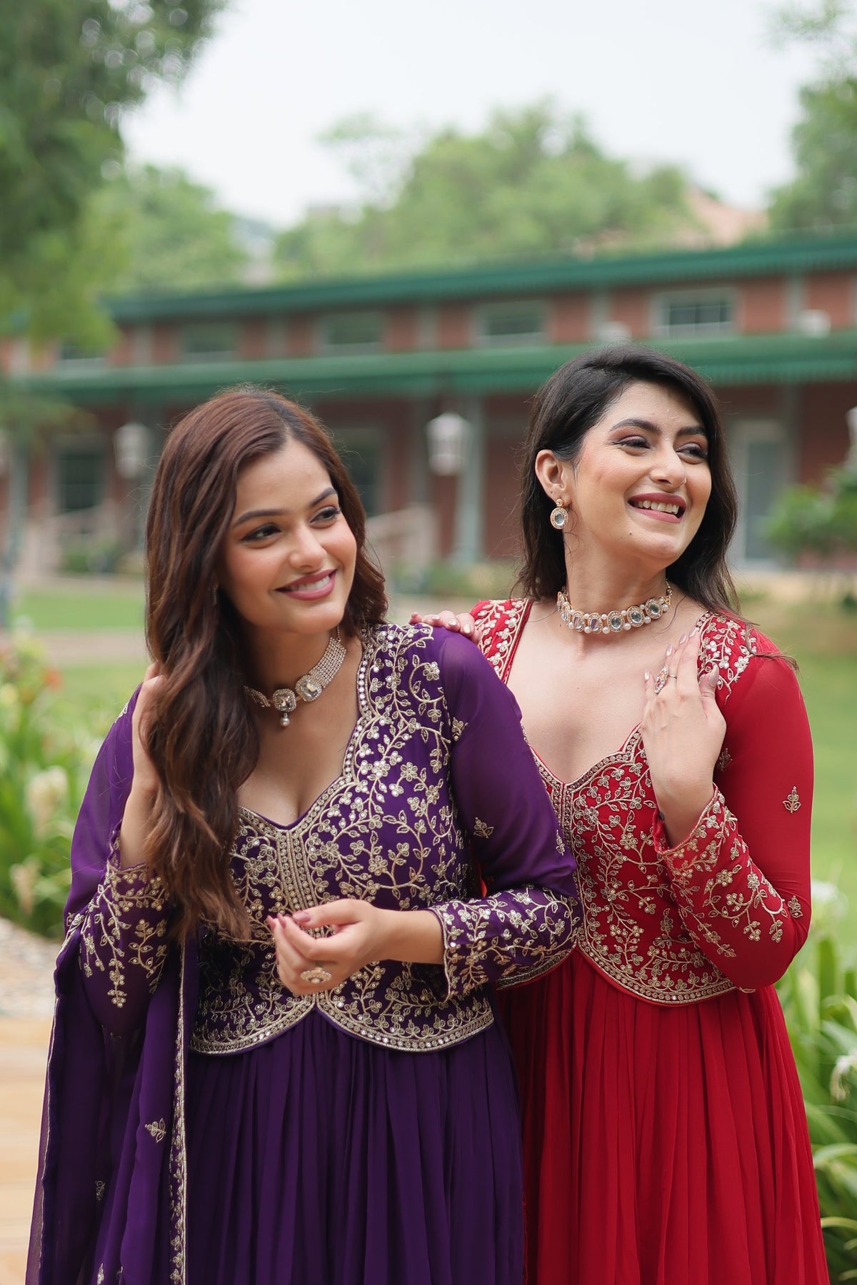 Women's Purple & Red Faux Blooming Sequins Zari Embroidered Long Anarkali Combo Sets