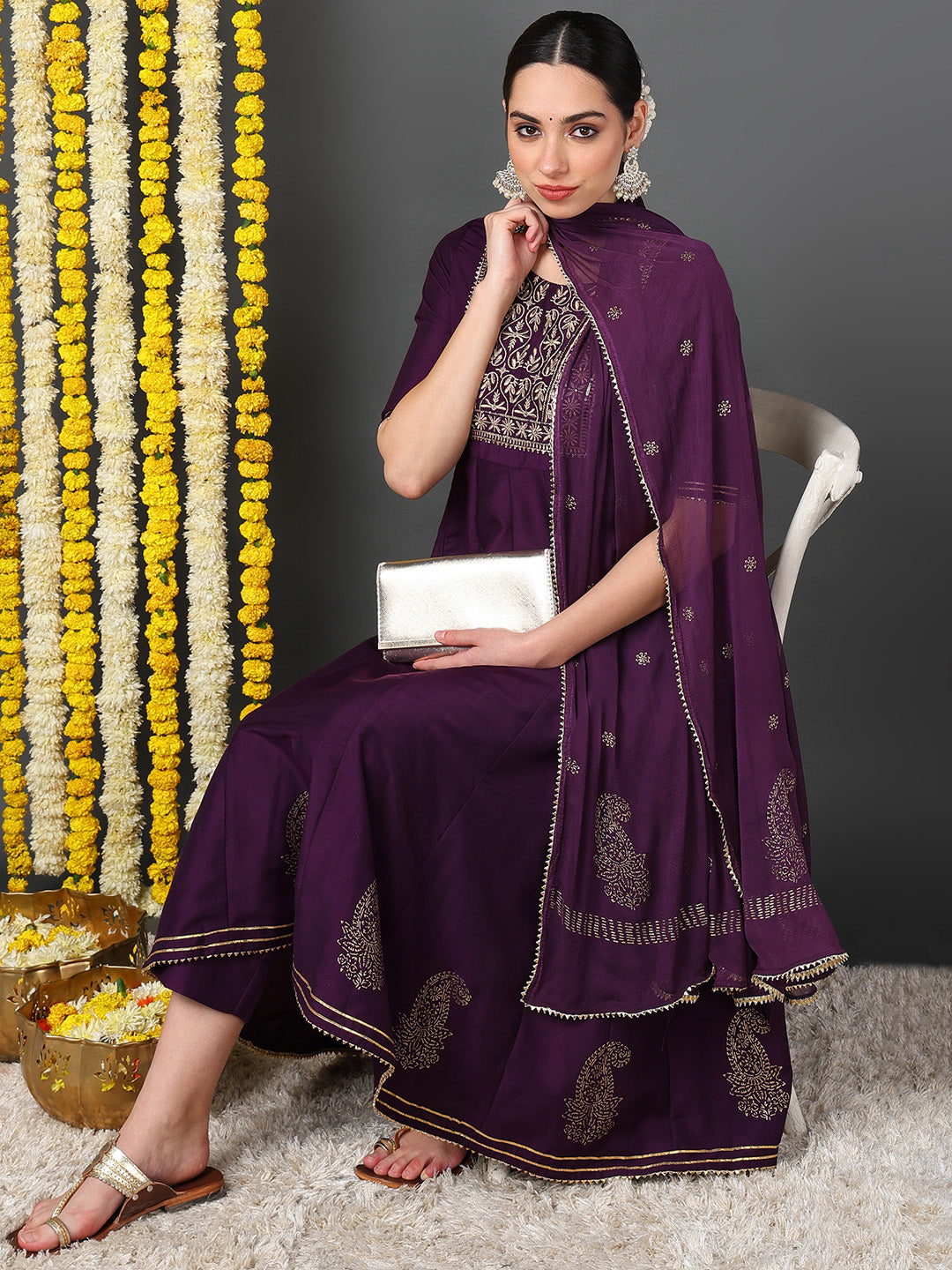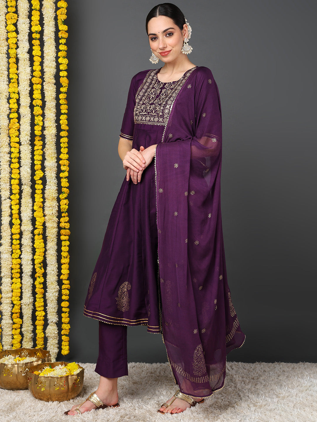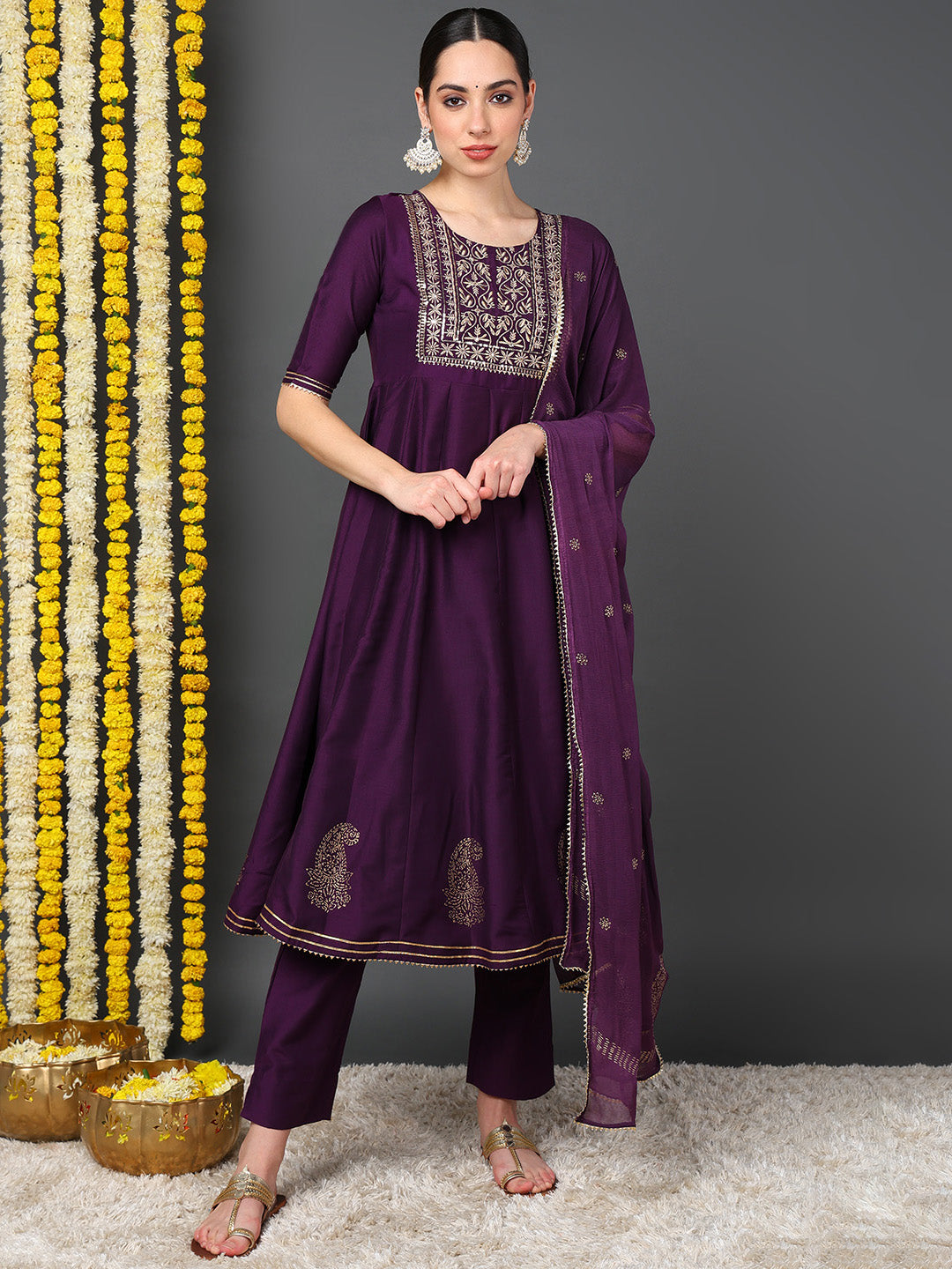 Women's Purple Silk Blend Embroidered Anarkali Kurta Pant Set With Dupatta