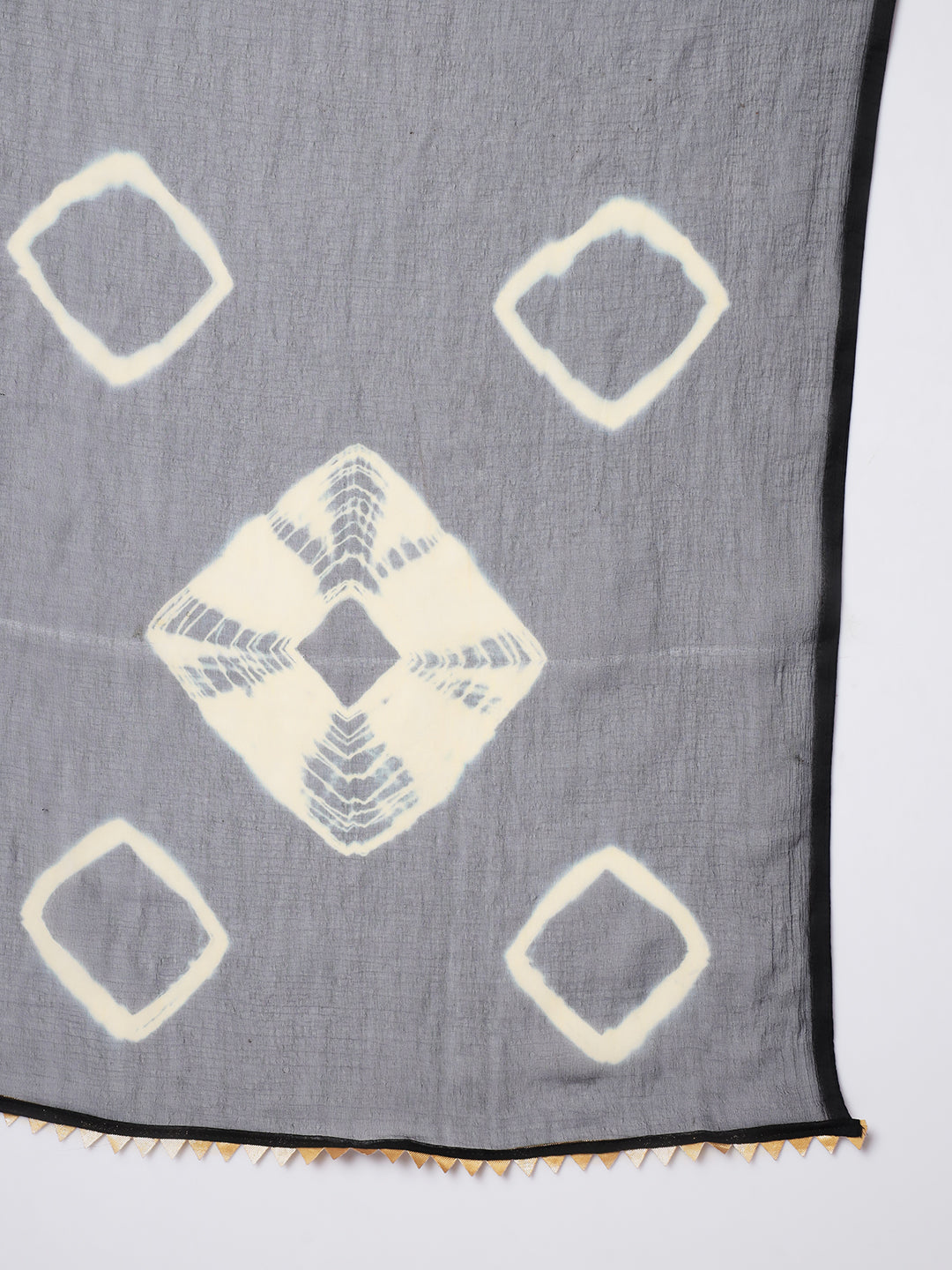 Women Black & Gold Ethnic Motifs Maxi Dress Has a Round neck Yoke beautiful Zari Work And Three-quarter, regular sleeves Maxi length in flared hem Viscose rayon knitted and woven fabric With Dyed Dupatta