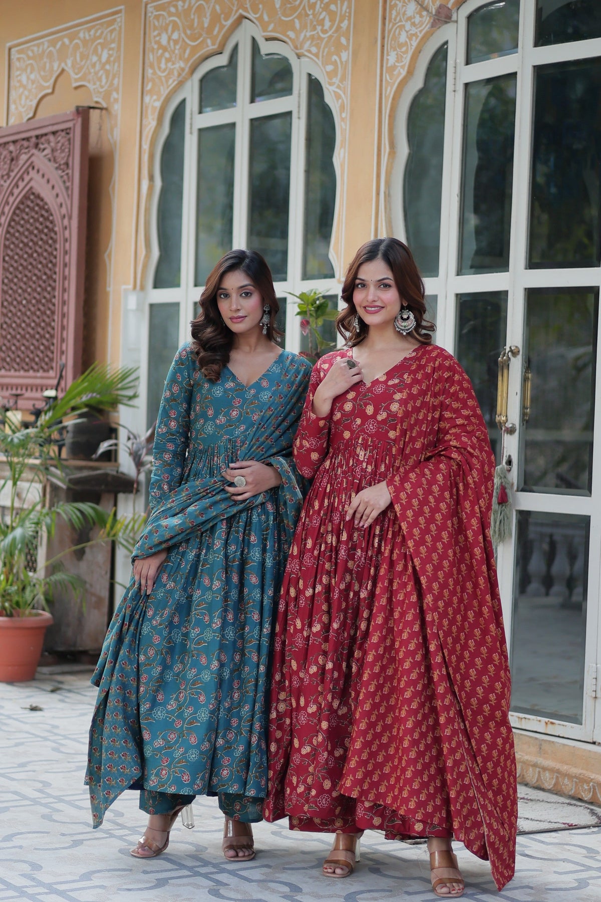Women's Rama & Maroon Cotton Printed Designer Combo Anarkali Set With Dupatta