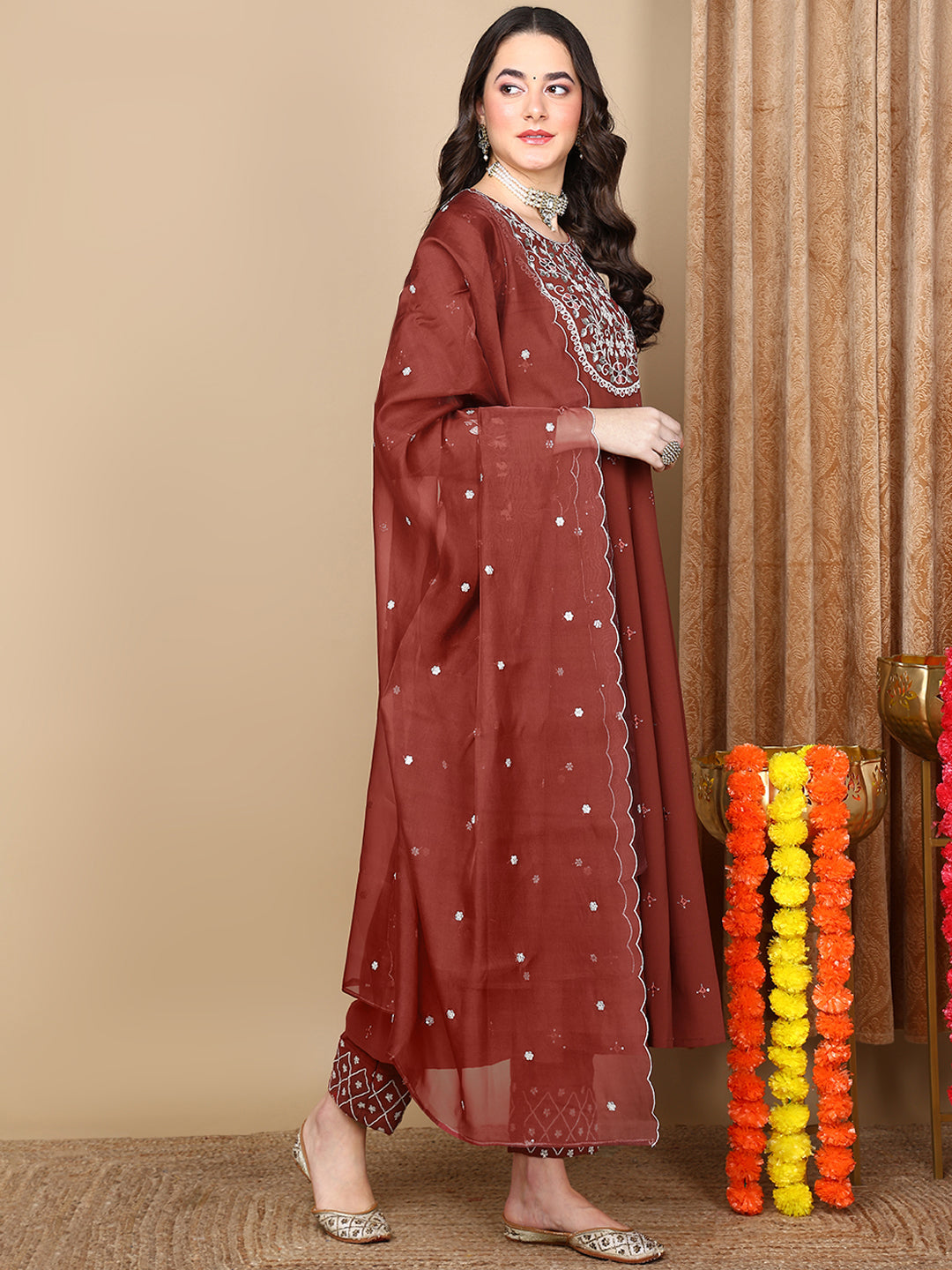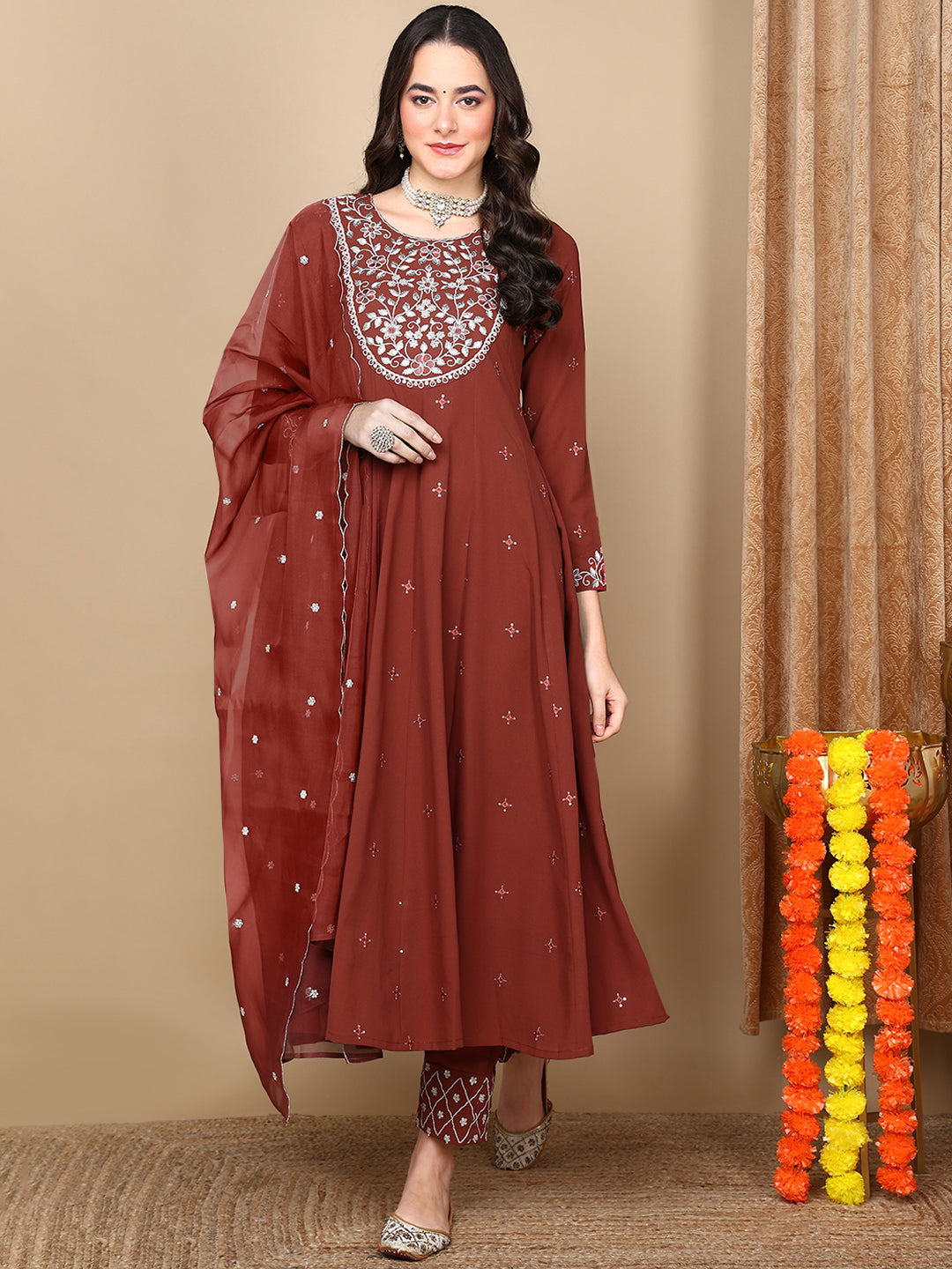 Women's Rust Georgette Yoke Design Anarkali Kurta Pant Set With Dupatta