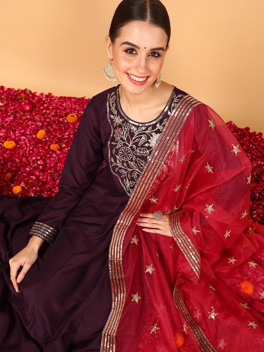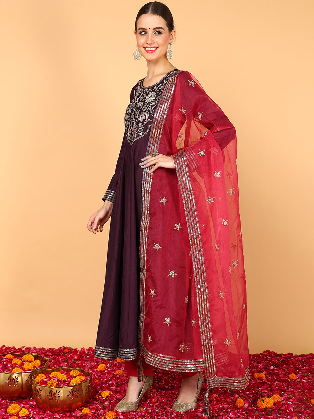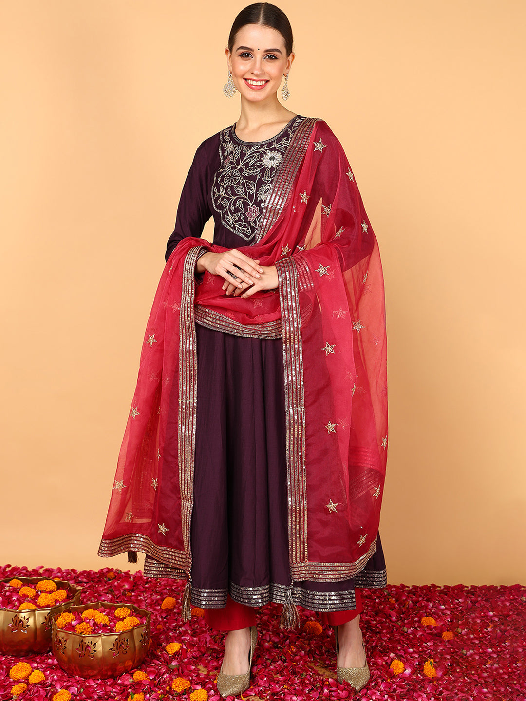 Women's Purple Silk Blend Embroidered Anarkali Kurta Pant Set With Dupatta