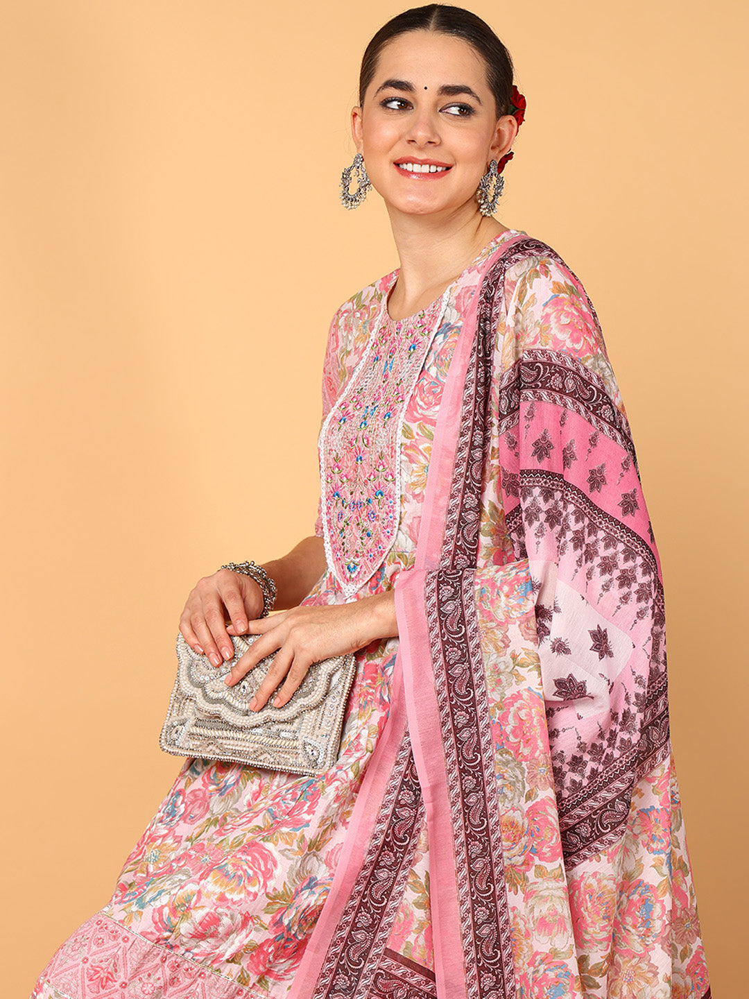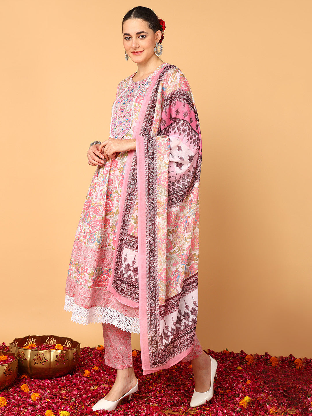 Women's Pink Cotton Embroidered Anarkali Kurta Pant Set With Dupatta