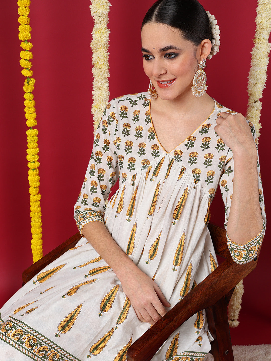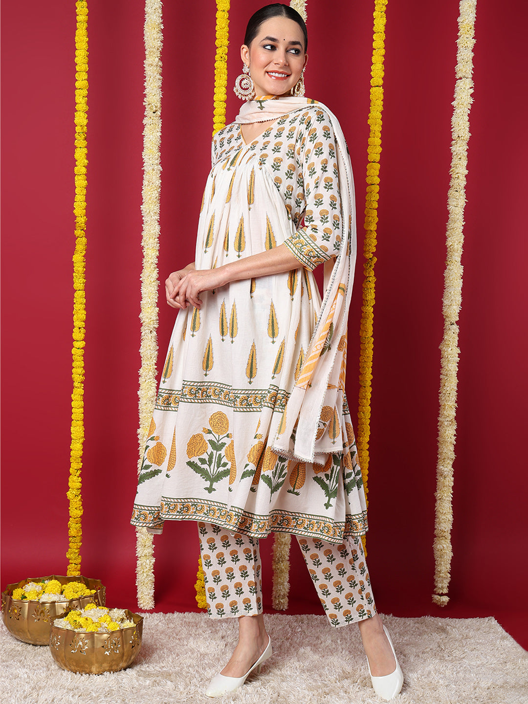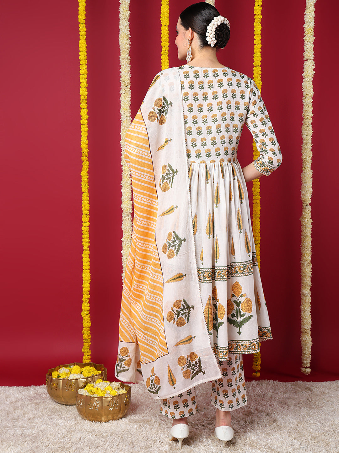 Women's White Cotton Embroidered Anarkali Kurta Pant Set With Dupatta