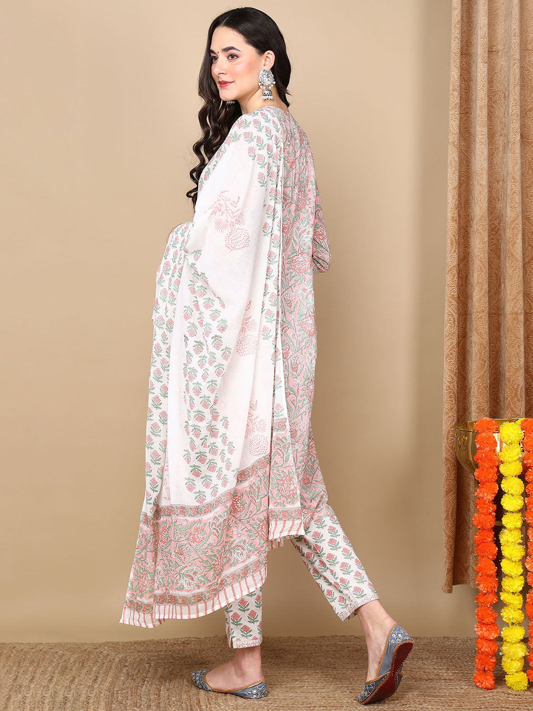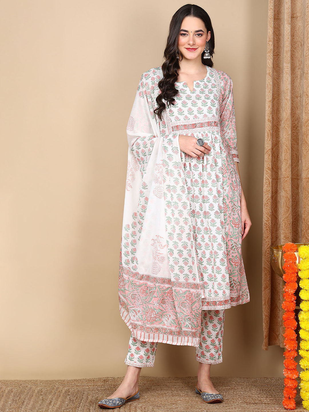 Women's White Cotton Printed Anarkali Kurta Pant Set With Dupatta