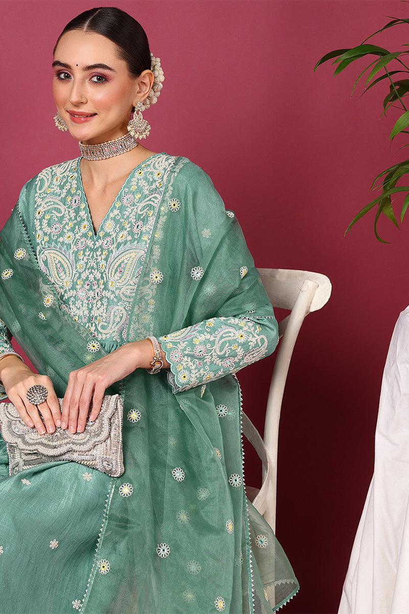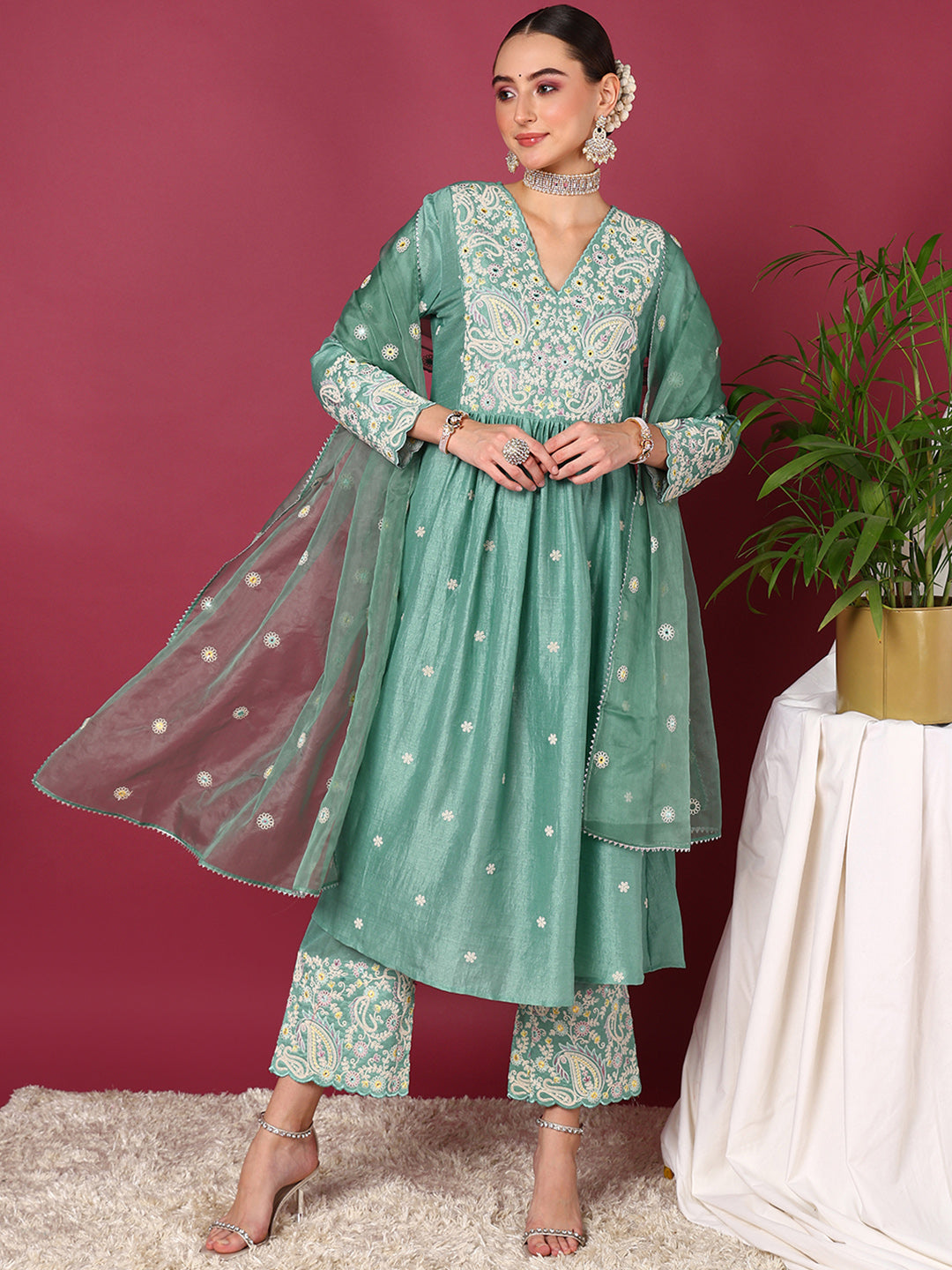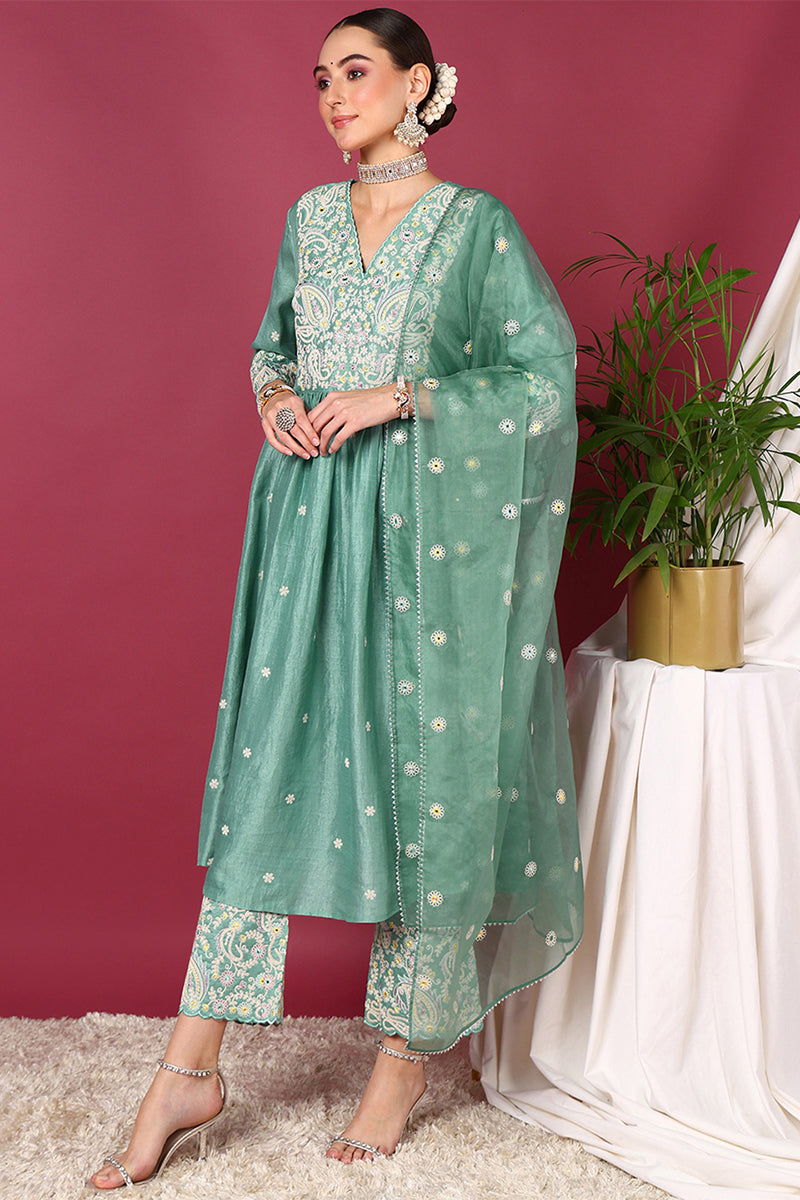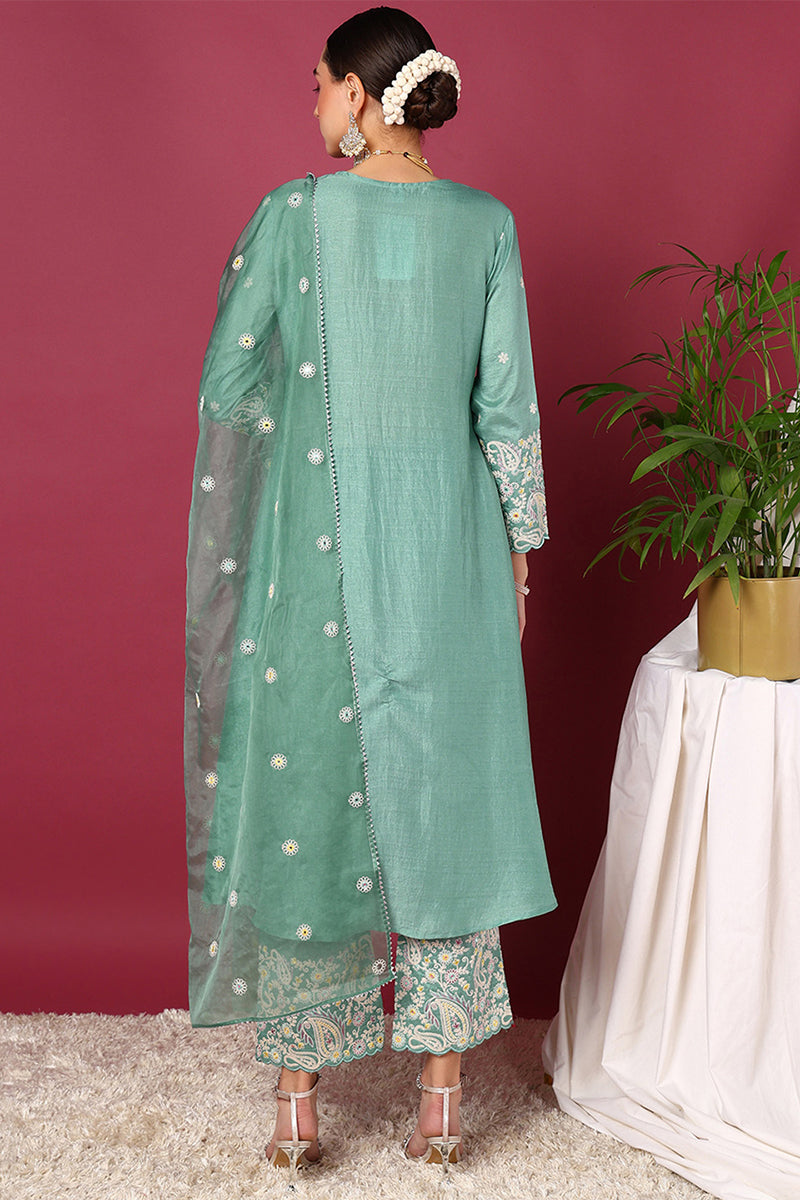 Women's Sea Green Silk Blend Solid Yoke Design Anarkali Kurta Palazzos With Dupatta
