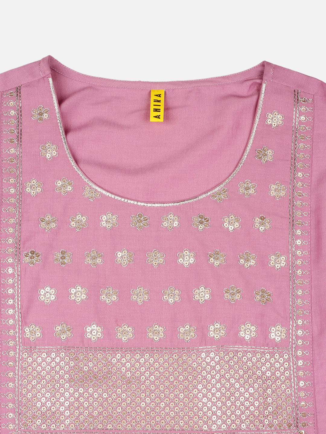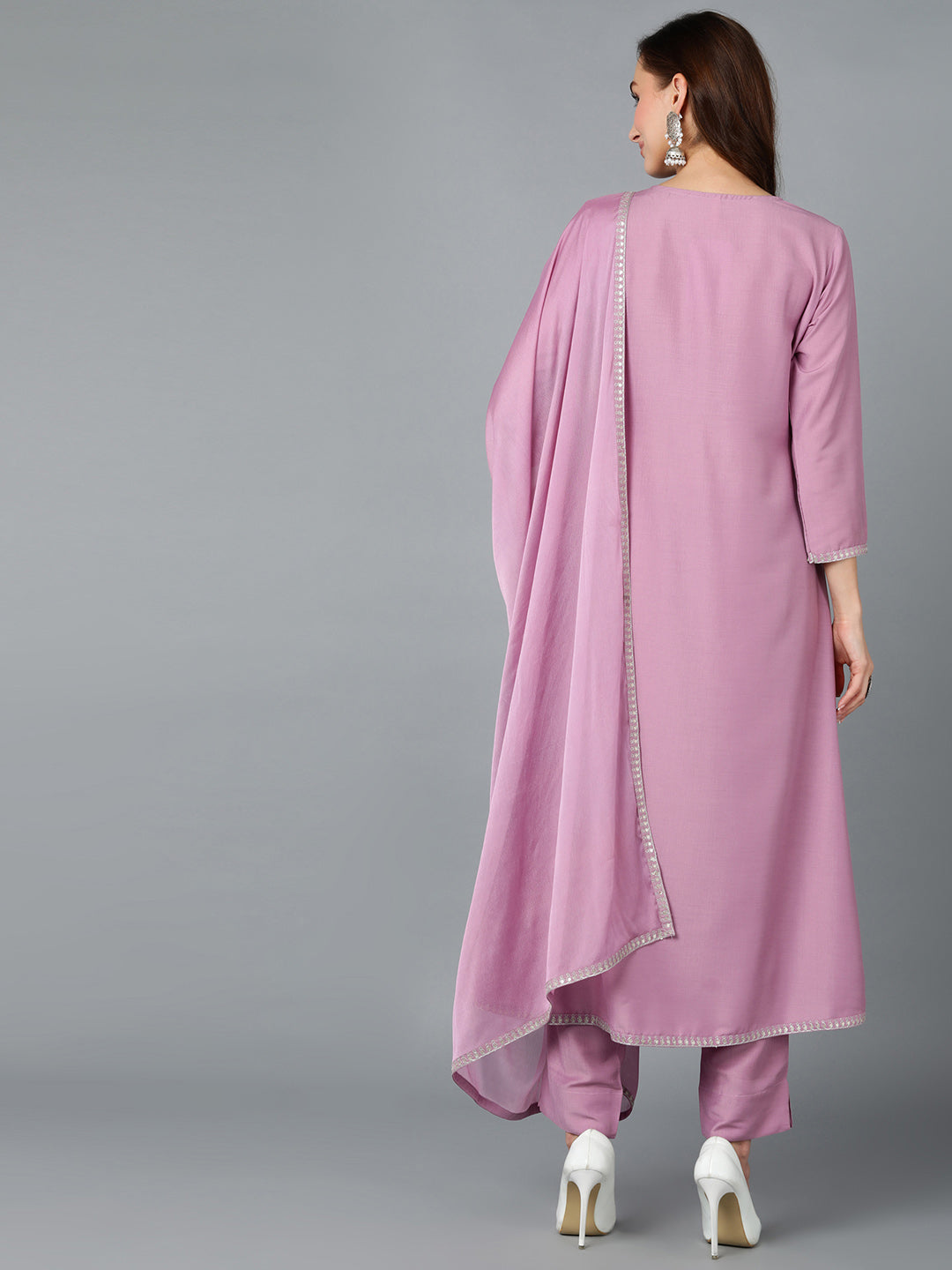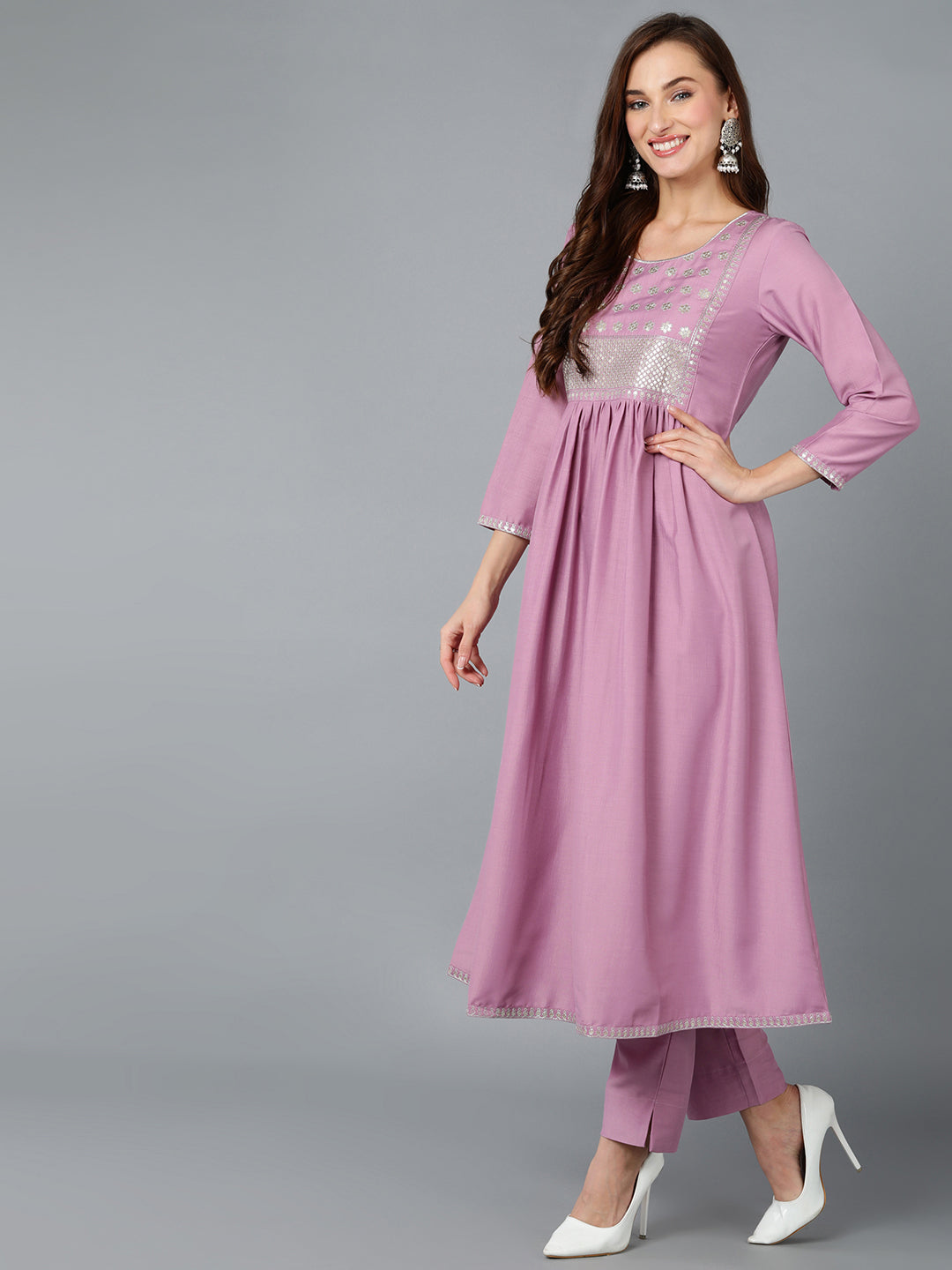 Dress Up In This Lovely Anarkali Suit Set And Mesmerize Everyone. This Lavender-Colored Anarkali Kurta Features A Round Embroidered Neckline And Frontal Pleats. It Also Has Three-Quarter Sleeves And A Flared Hemline. The Dress Gets Its Rich Look From The Pleats And Flared Hemline. It Is Paired With A Straight Bottom That Has Pocket And Side Slits. The Chinon Chiffon Dupatta Has Delicately Designed With Border Lace Giving It A Unique Touch.
