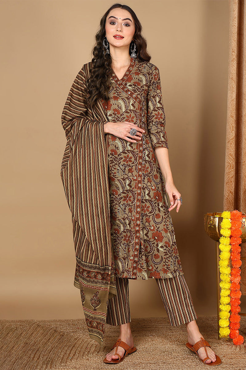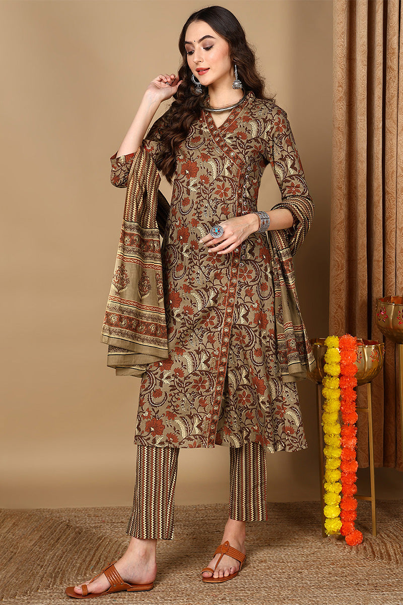 Women's Taupe Cotton Floral Printed Anarkali Kurta Pant With Dupatta