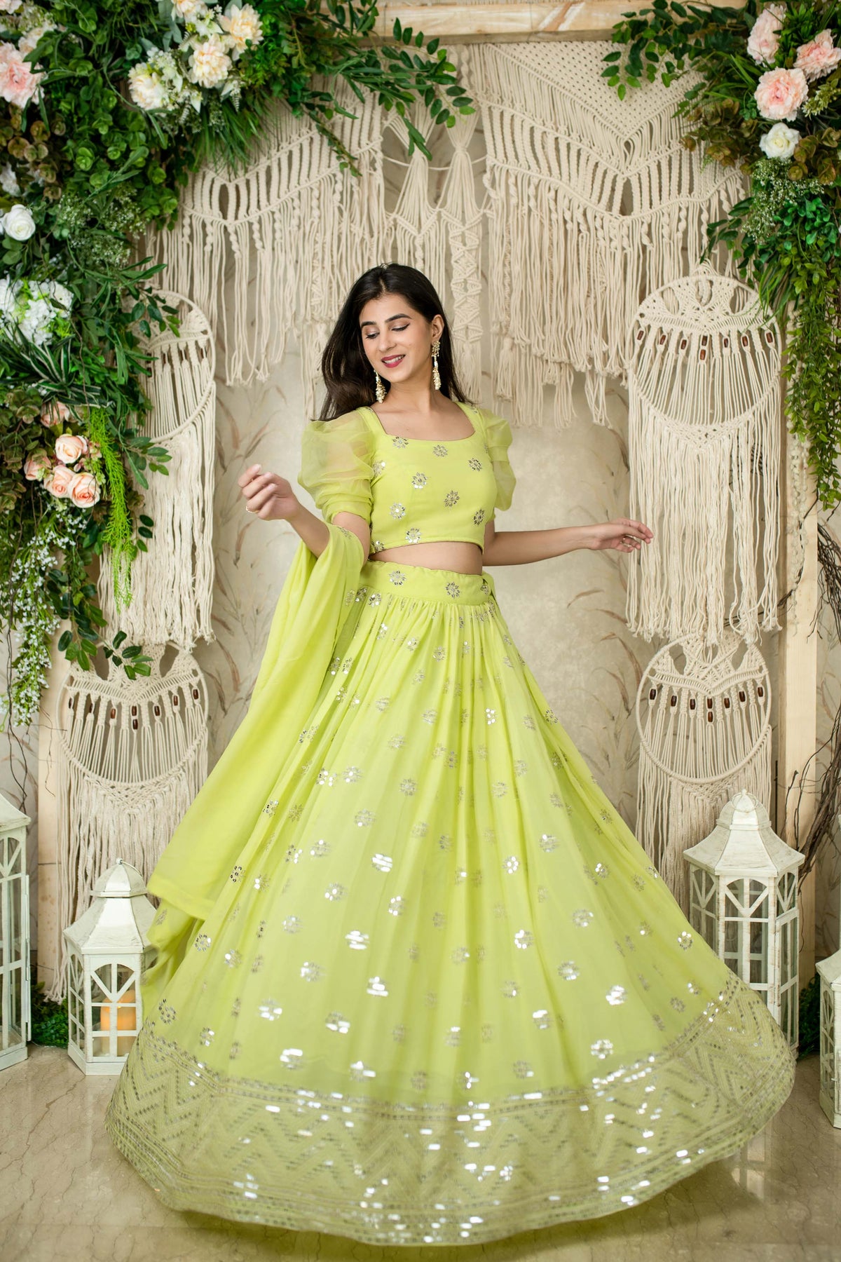 Trendia brings you this Women's Monochrome Pastel Green Lehenga by Label Shaurya Sanadhya. Made of Georgette This green Lehenga Set includes a Sequined Lehenga and Choli and a Green net Dupatta