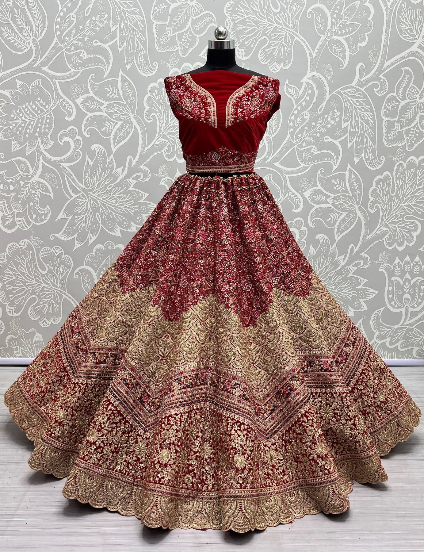 This beautiful velvet lehenga choli is the epitome of elegance, perfect for festivals and special occasions. Get this beautiful velvet fancy dori & sequins multy thread embroidered with diamond work lehenga choli online at trendia.co - The best online store for women's lehenga choli.