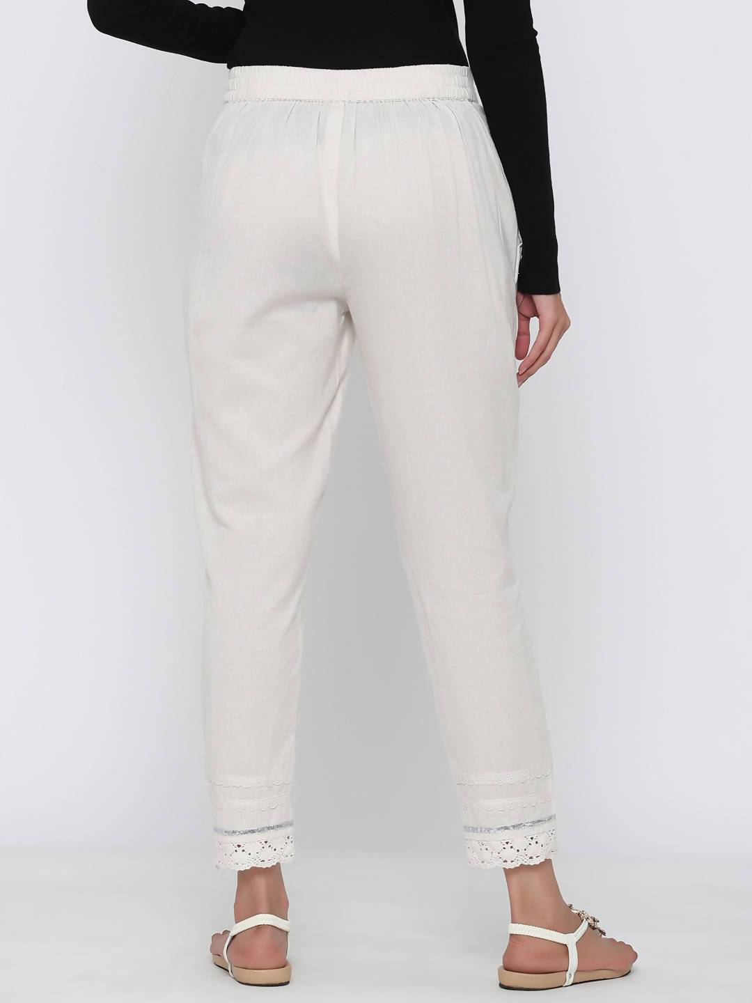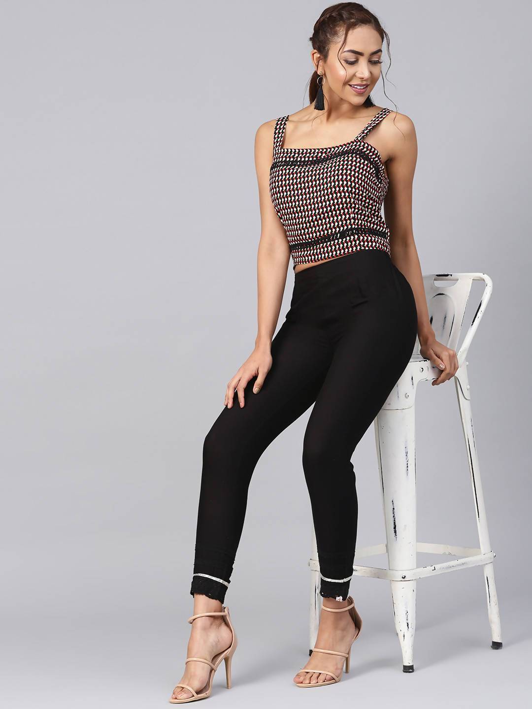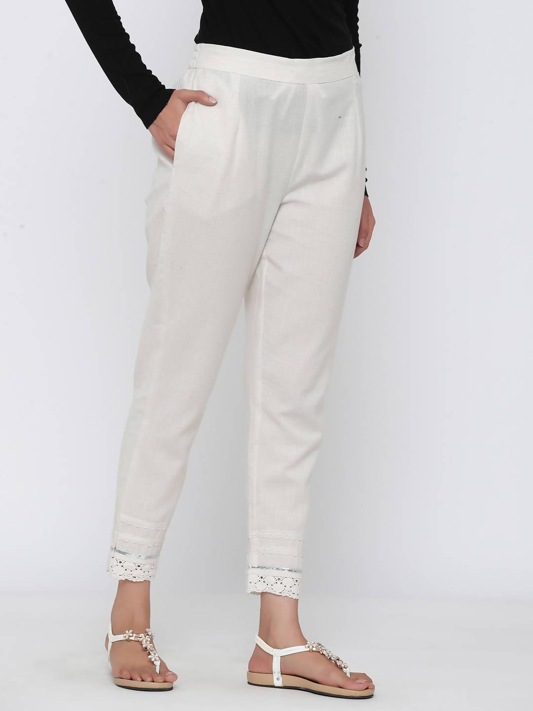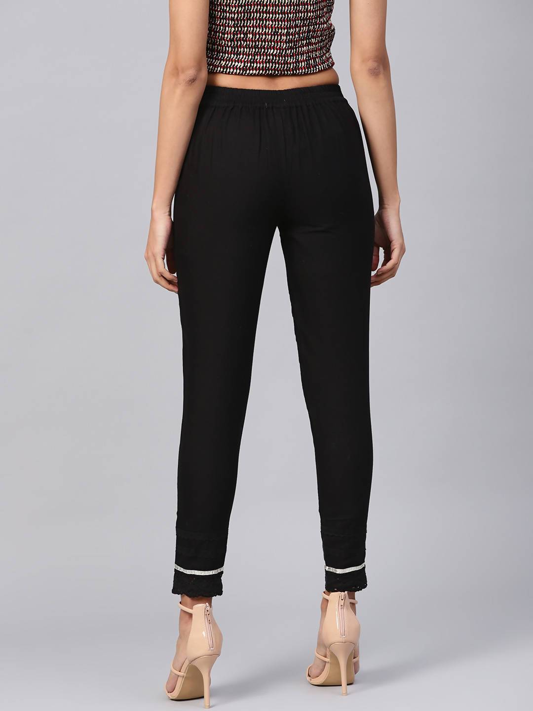 Description :Juniper Black Cotton Slub Solid Straight Pants with Lace Embellished Hem & Side Pocket Color :BLACKFabric :Cotton FlexPrint :SolidPrint & Pattern :SolidHemline :Slim FitHemline :36Shape :Slim FitClosure :ElasticMaterial Transperency :OpaqueOccasion :DailyWash care :Machine Wash