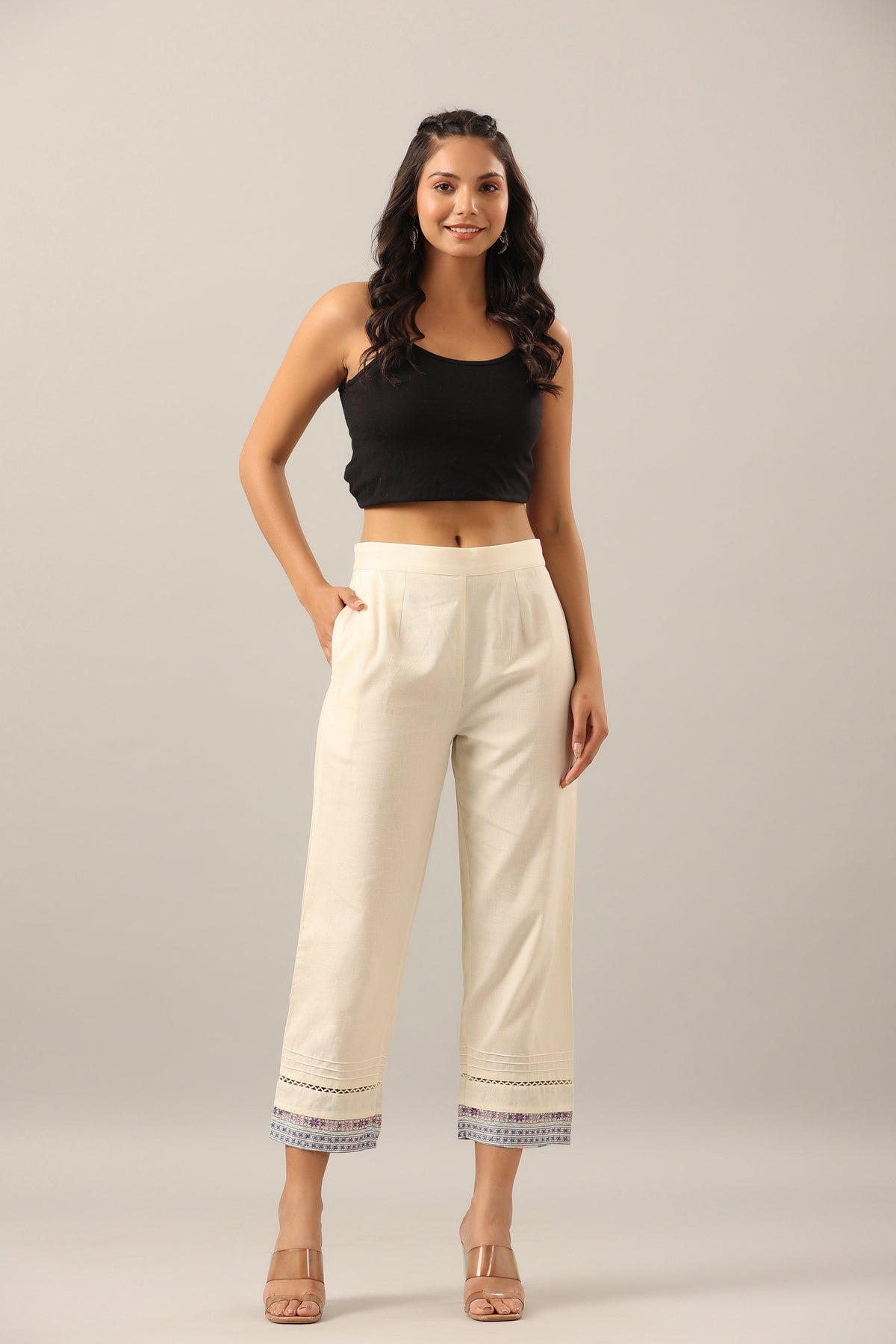 Off-White Cotton Flex Solid with Print Detailing Straight Pants with Partially Elasticated Waistband, Pin tuck and Lace Detailing at Hemline and has a Side Pocket.