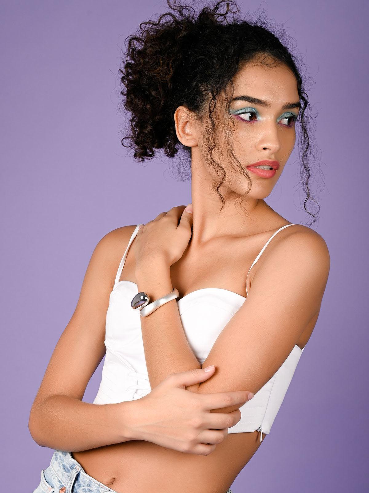 Odette presents this stunning bracelet in silver tone the bracelet has a slip in closure. The design is simple yet classic formal, casual, fusion and party.