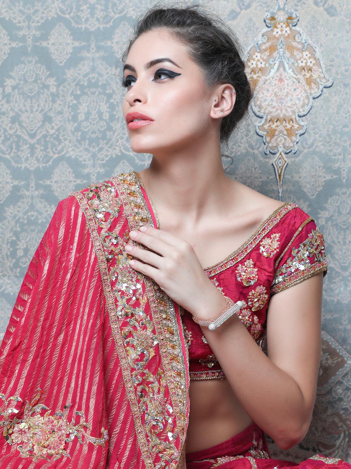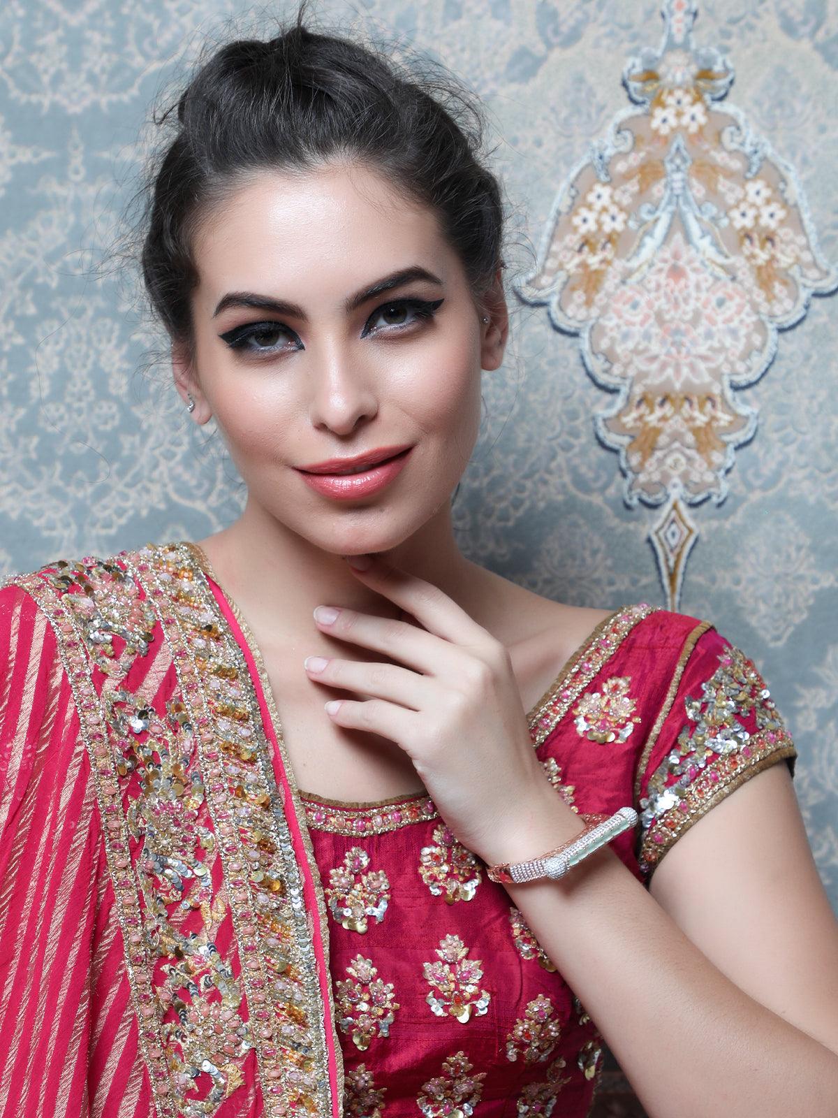 The rose gold plated bracelet is embellished with white Austrian Diamonds and is very stylish. It easily blends with Indian or western dresses. Add to your the glam factor with this one. 1. Unique design 2. White and Green stones