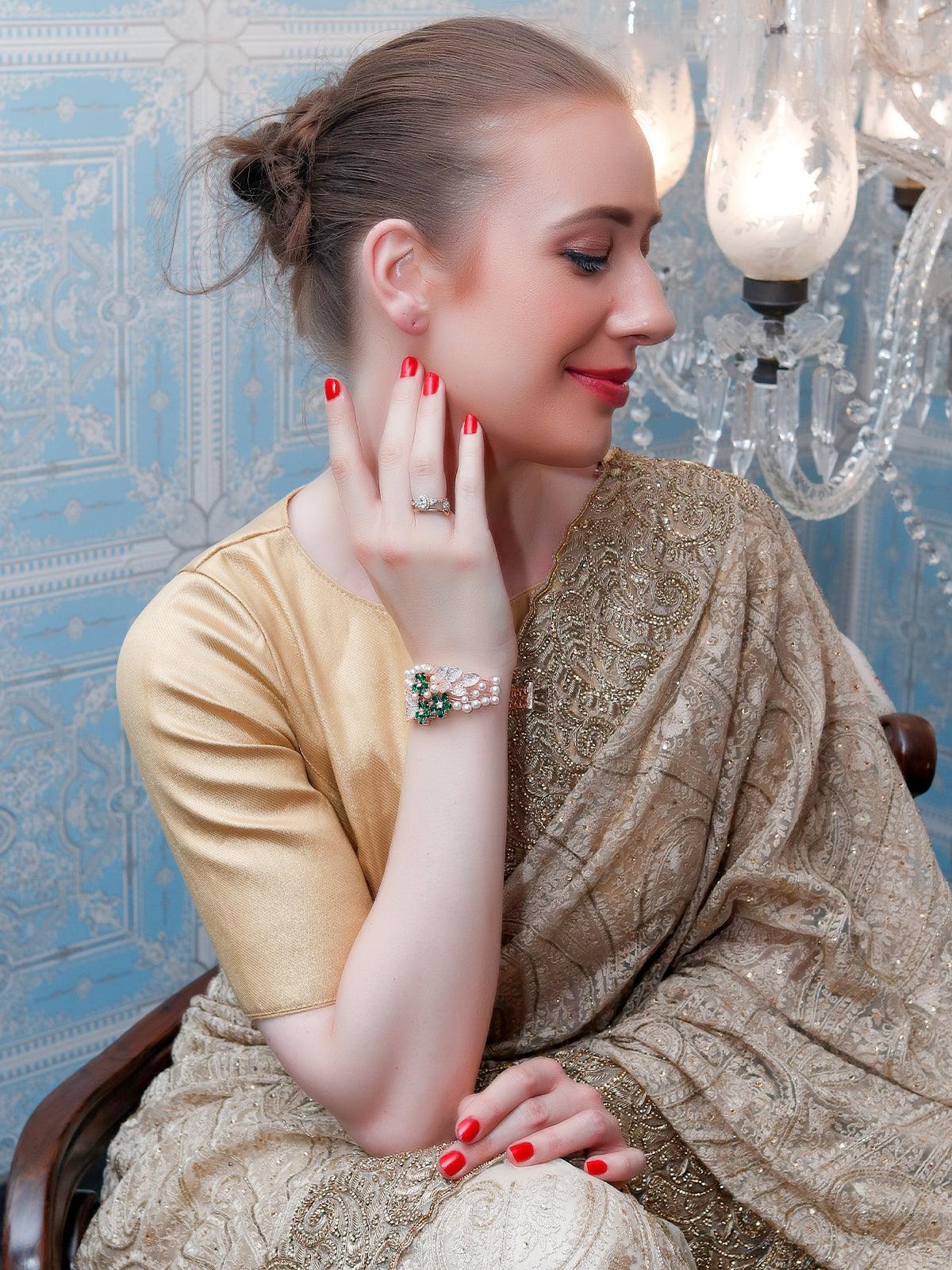 The rose gold plated bracelet is embellished with emerald green and white stones and lovely pearls. It easily blends with Indian or western dresses. Add to your the glam factor with this one. 1. Studded with pearls 2. White and Emerald Green stones