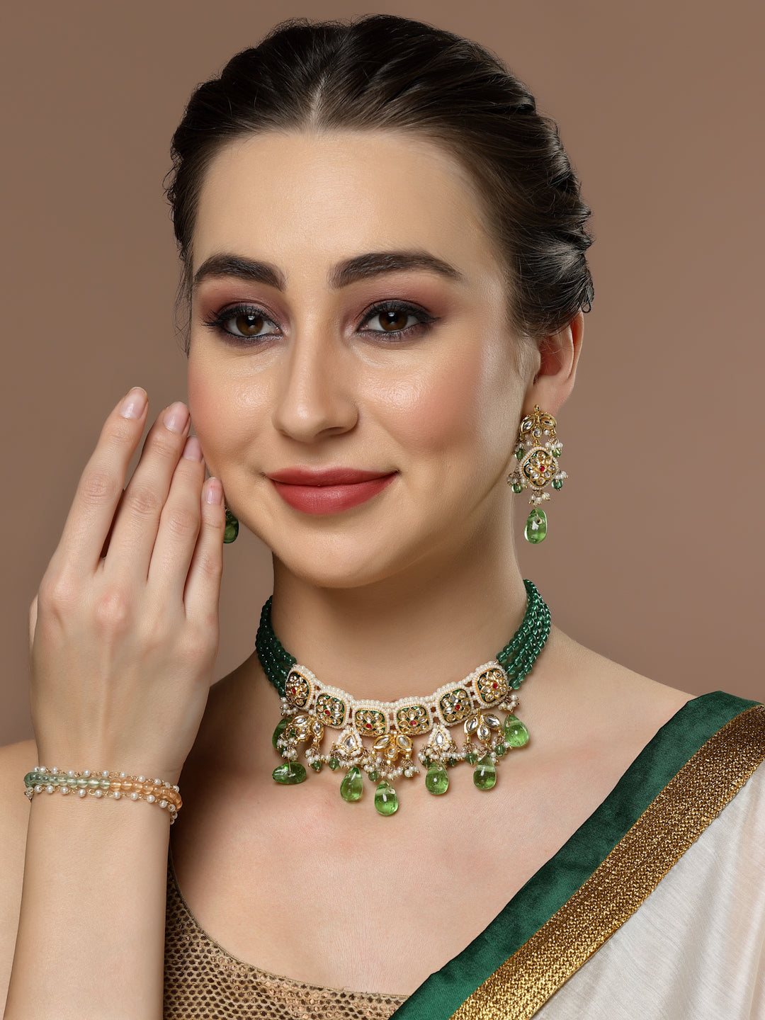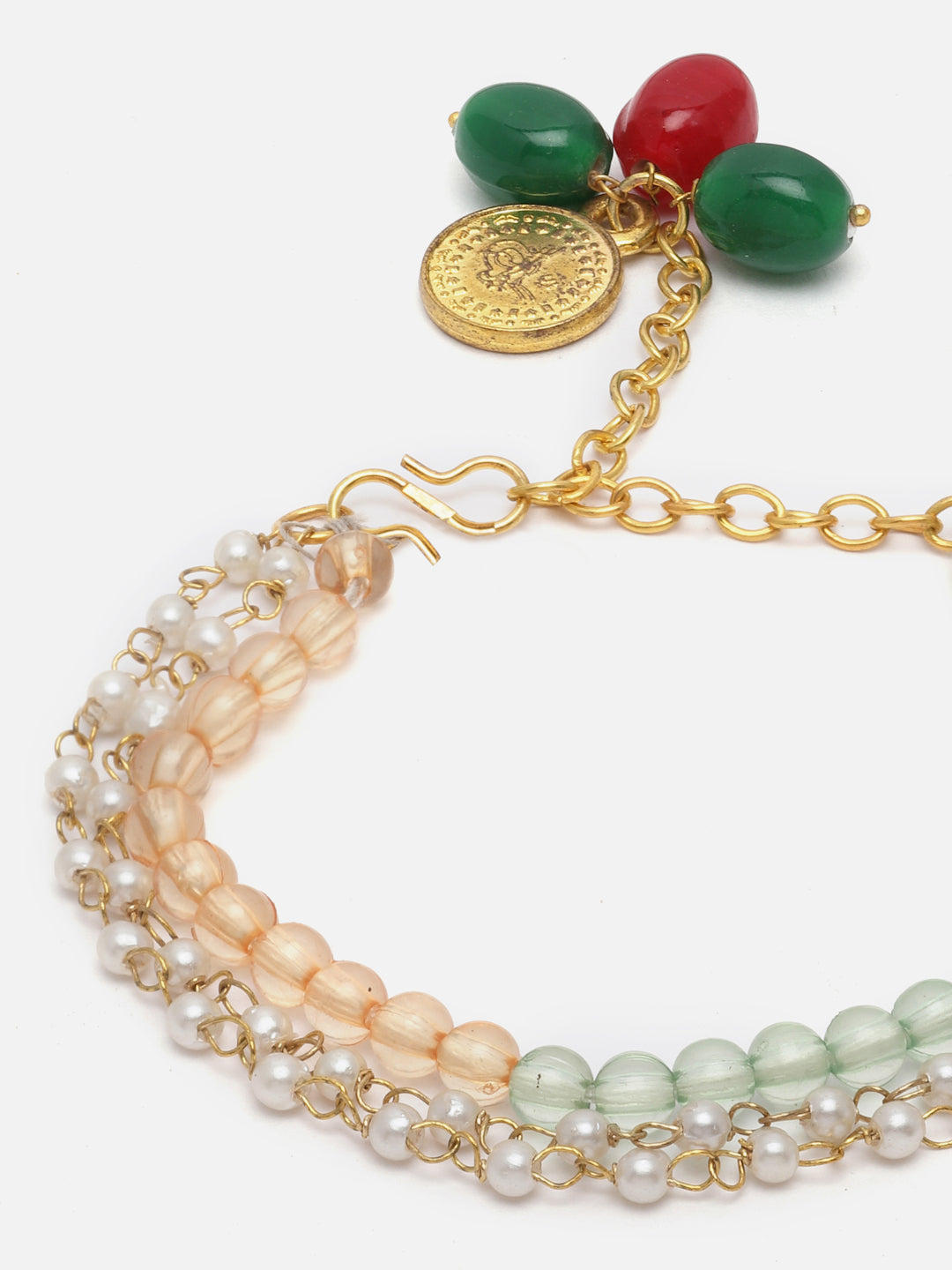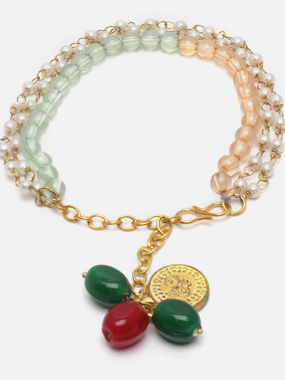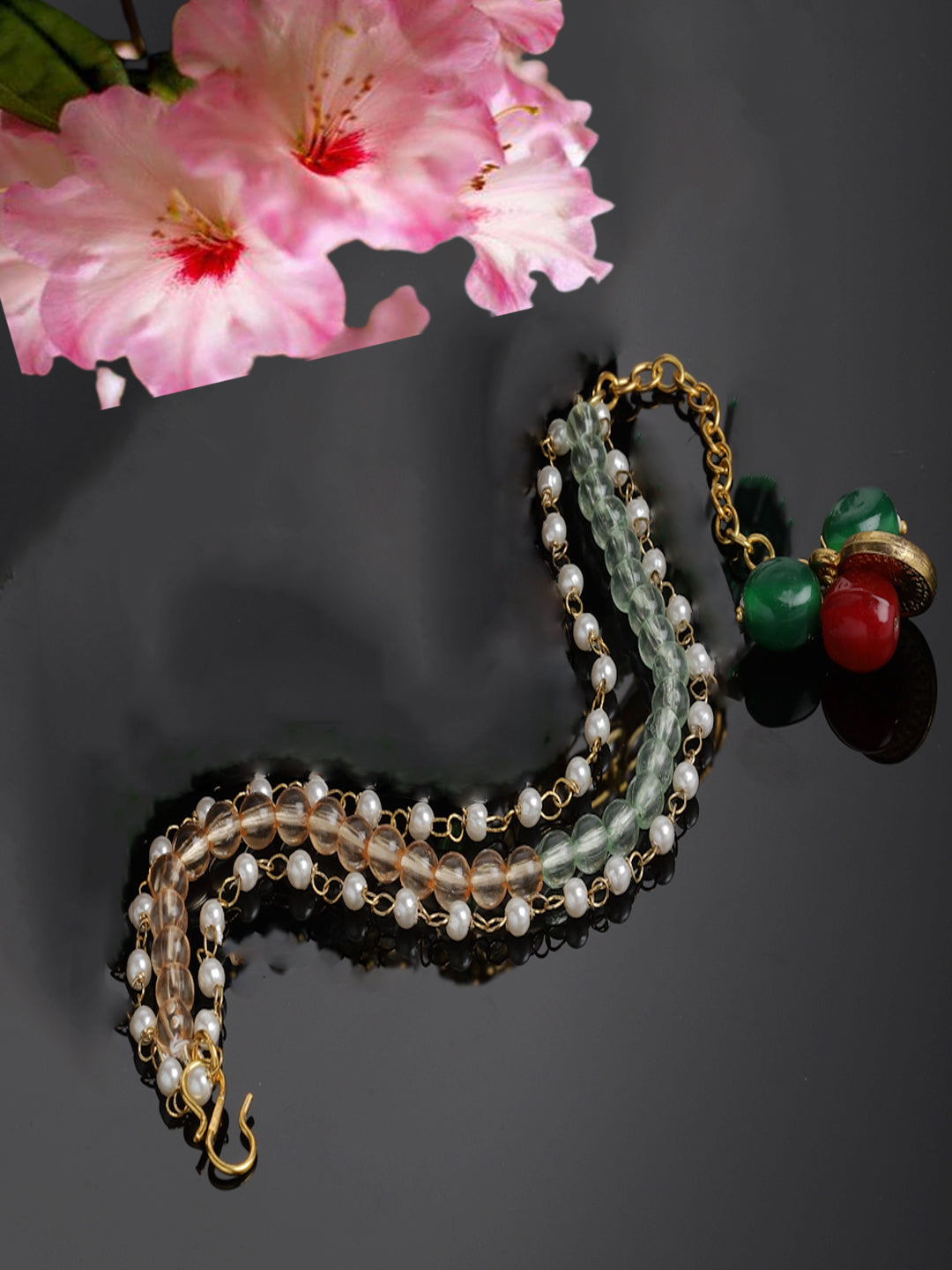Green Andyellow Bracelet; Category Of Jewellery Is Hand Jewellery; Sub Category Is Bracelets; Ideal For Women; Color Is Green, Peach, Pink, Gold, White; Gemstones Used - Pearls, Natural Stones; Plating Is Gold-Plated; Base Metal Is Alloy; Other Material Used - Adjustable Chain; Size Is Freesize; Adjustable - Yes; Weight Is 7 Gms; Mesaurements - Width Of Bracelet = 1.4 Cm; Diameter Of Bracelet =6.03 Cm; Circumference Of Bracelet = 18.95 Cm; Adjustable - Yes; Content 1 Bracelet