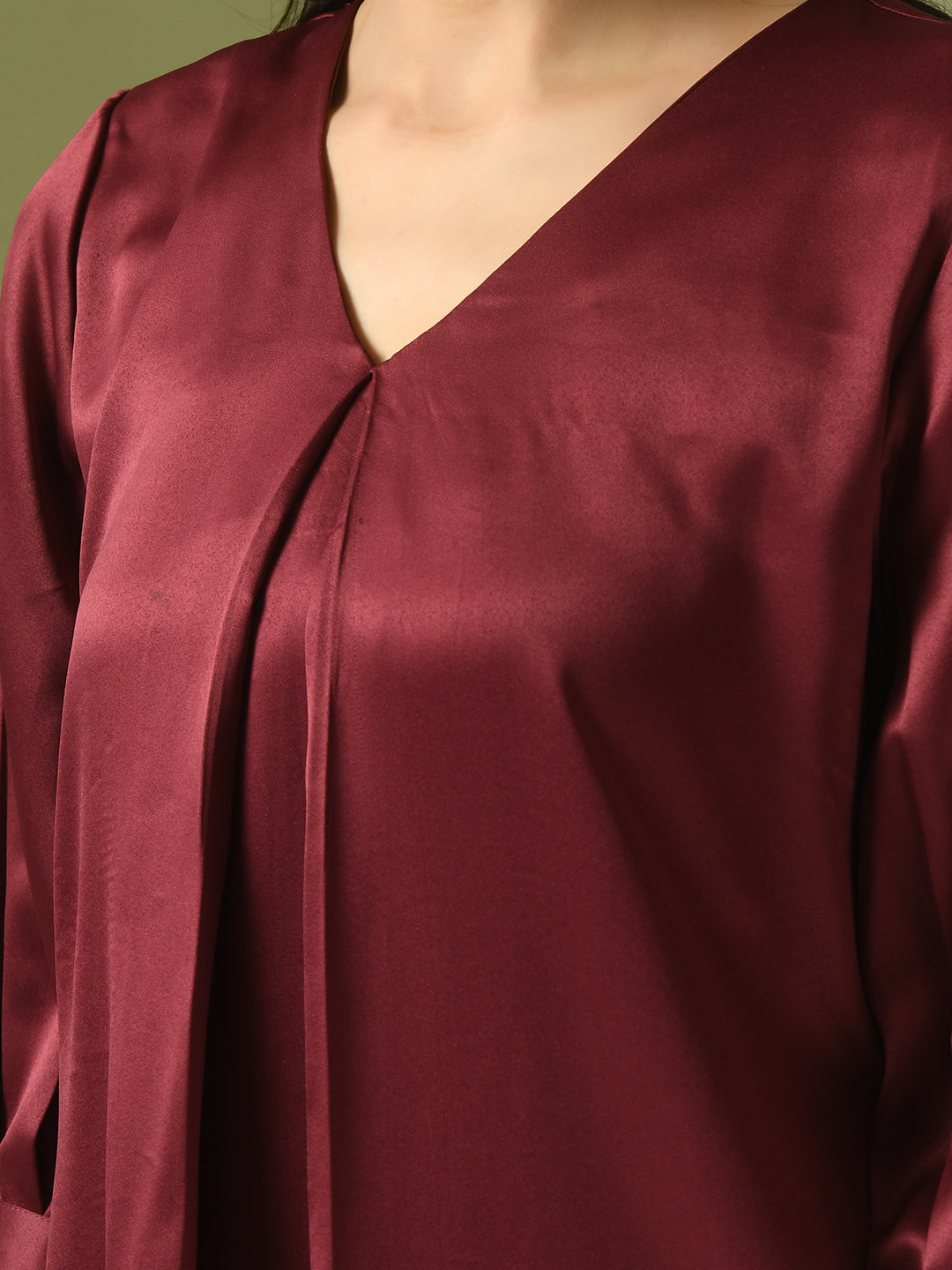 Women Maroon Solid Satin V-Neck Party Tunic With Trousers Co-Ord Set