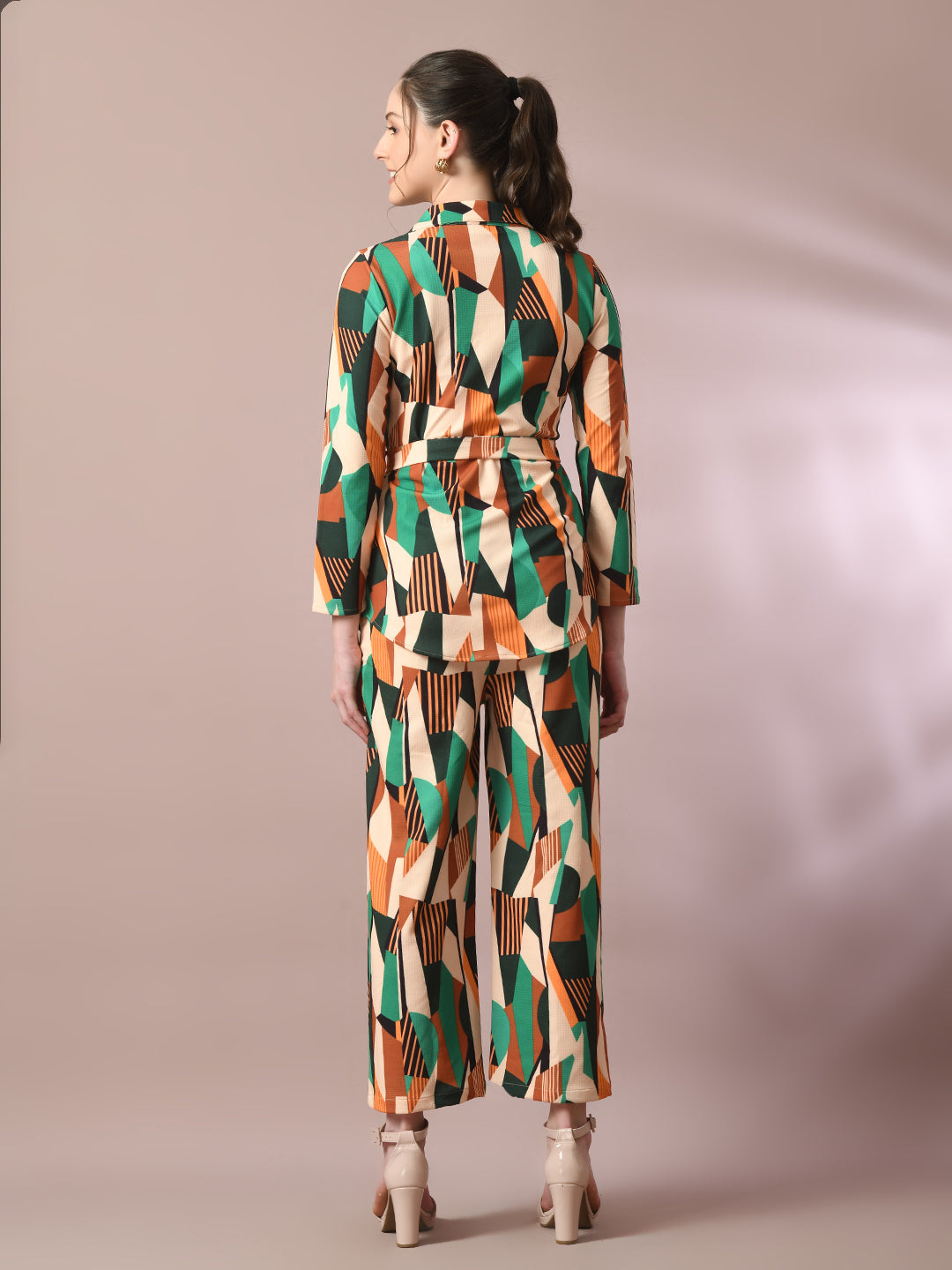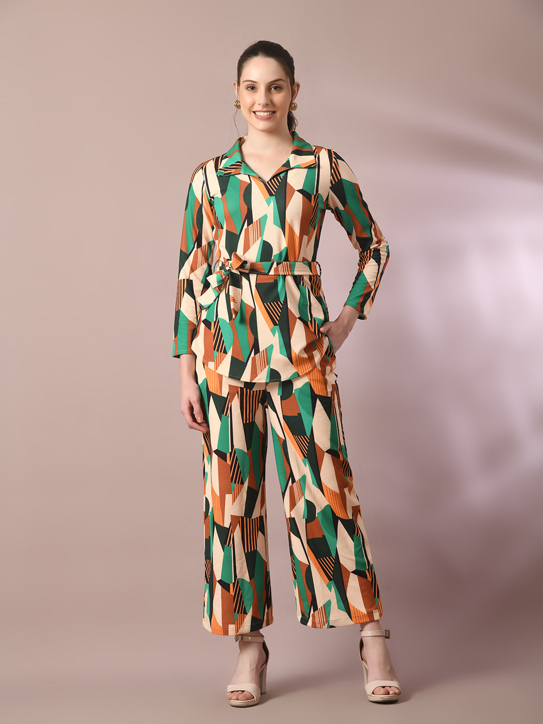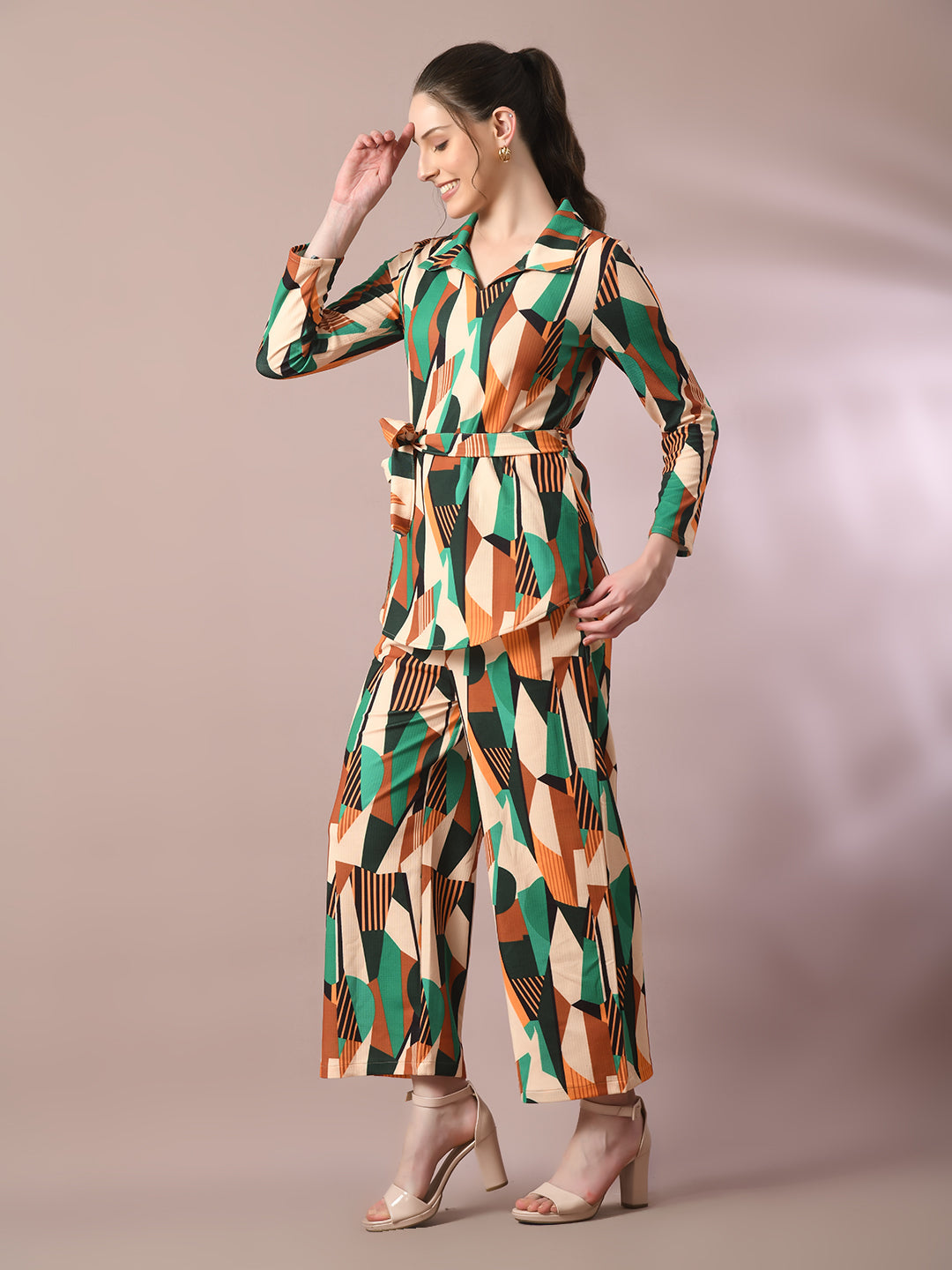 Women Multi Printed Polo Collar Party Top With Trousers Co-Ord Set