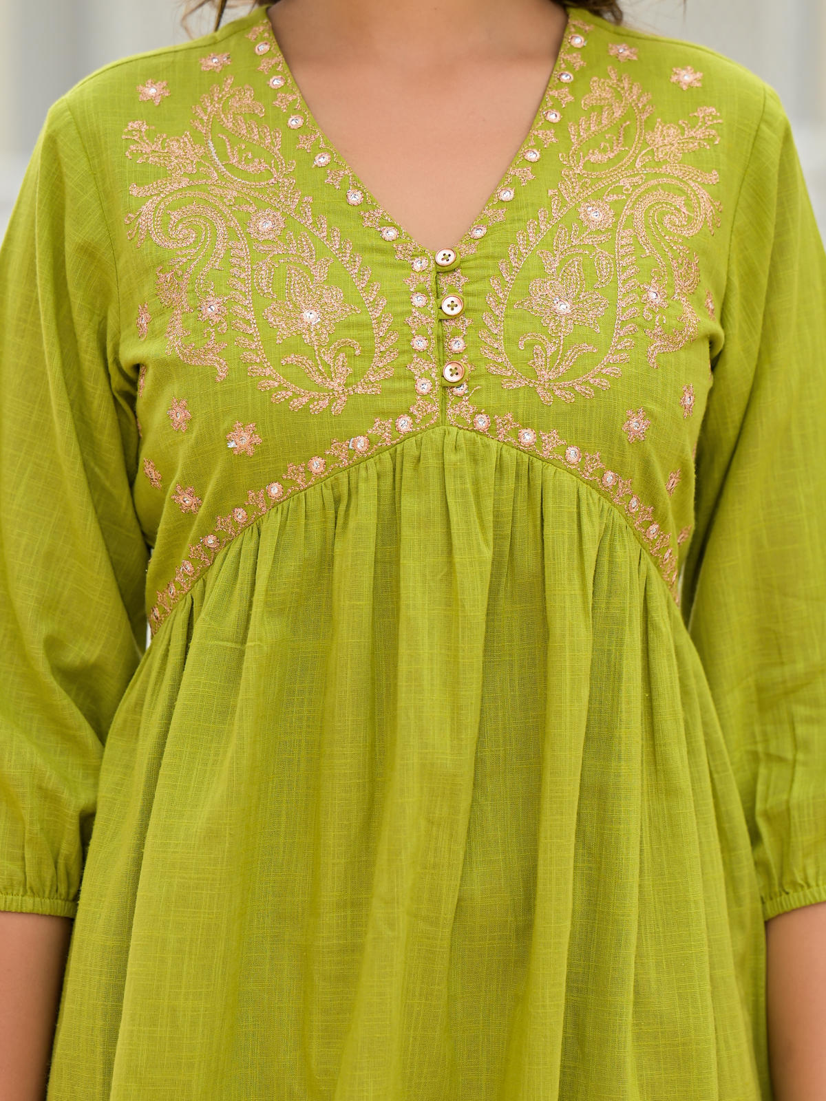 Women's Olive Green Cotton Slub Embroidered Co-Ord Set - Juniper