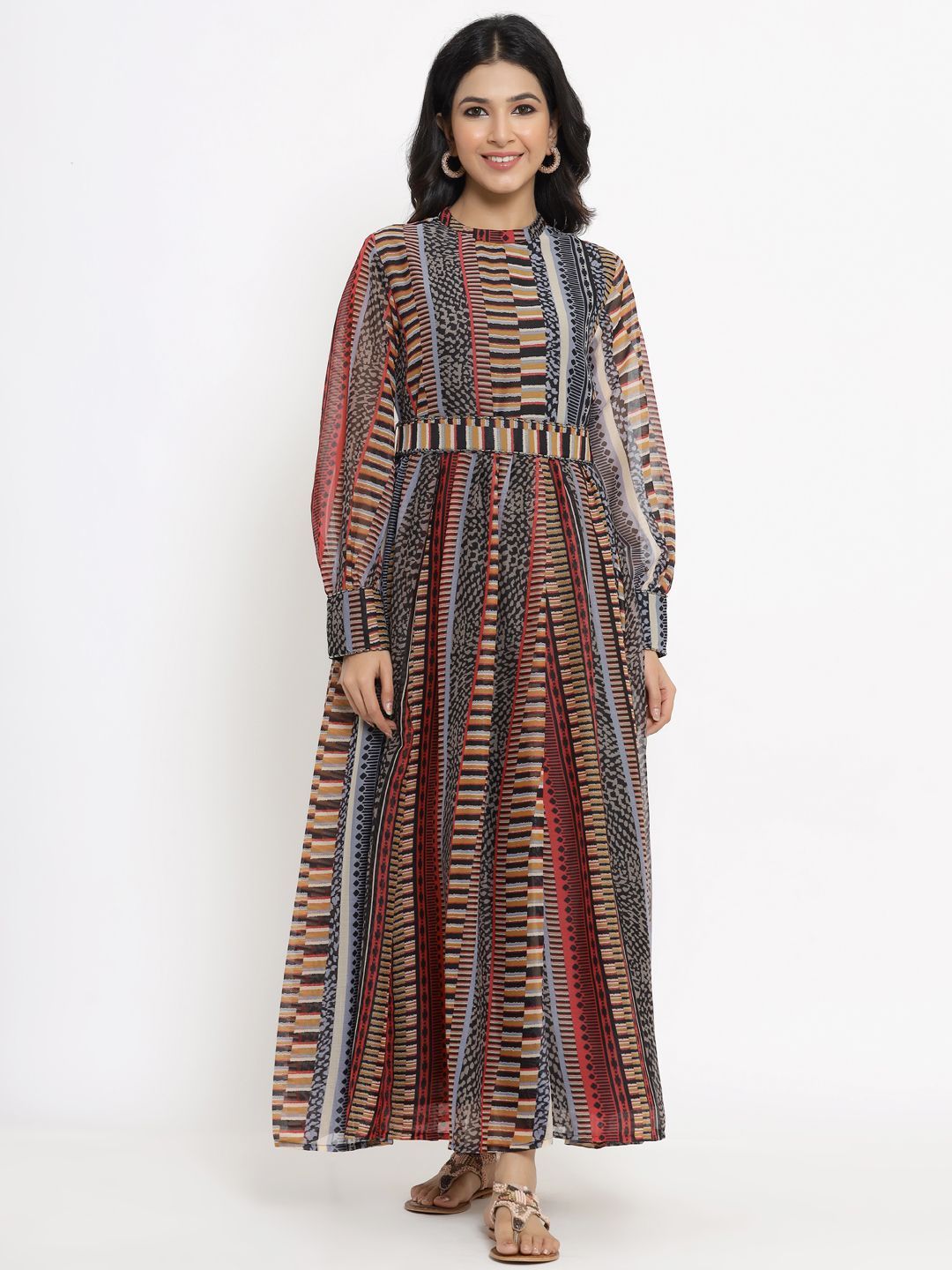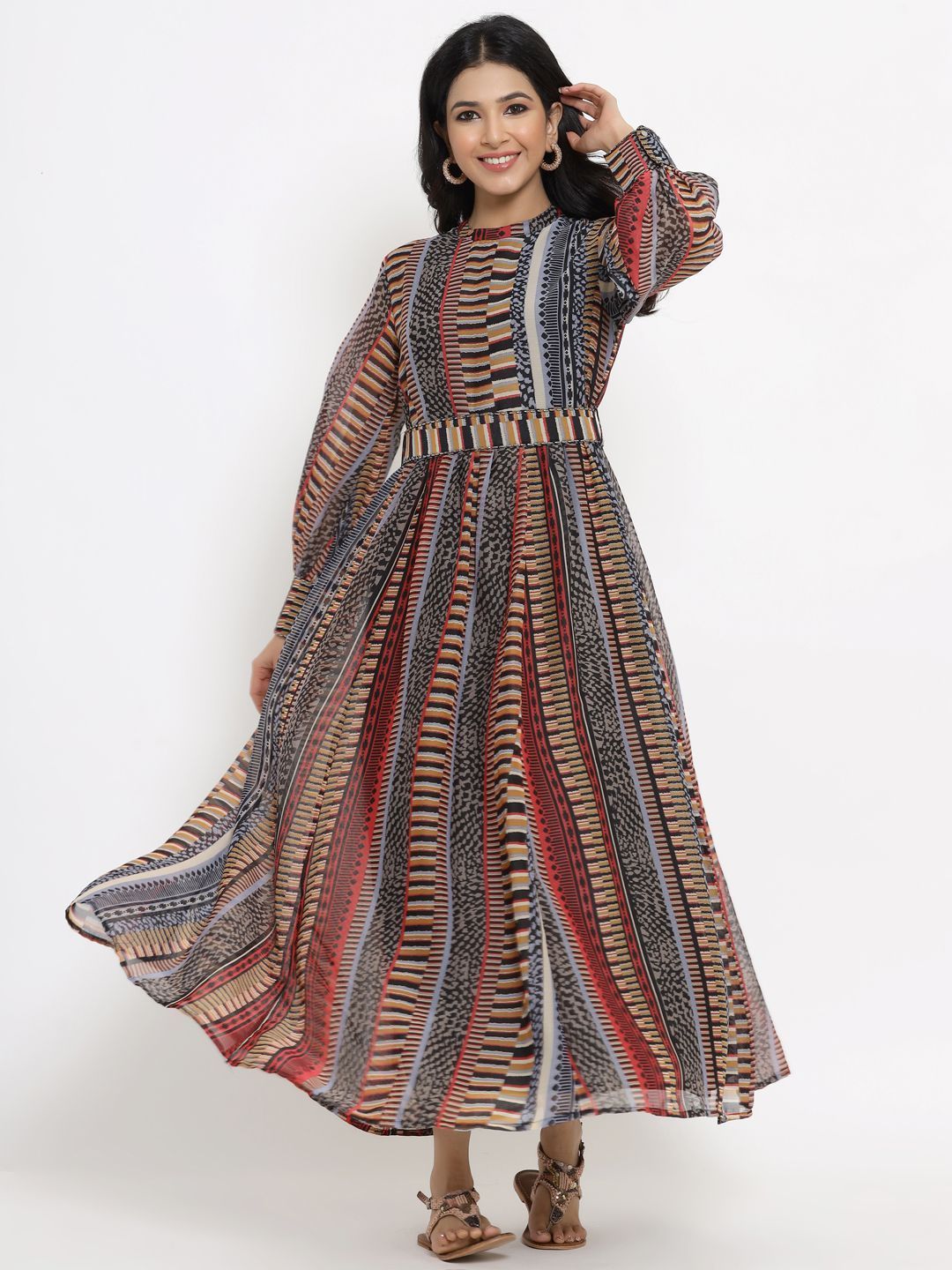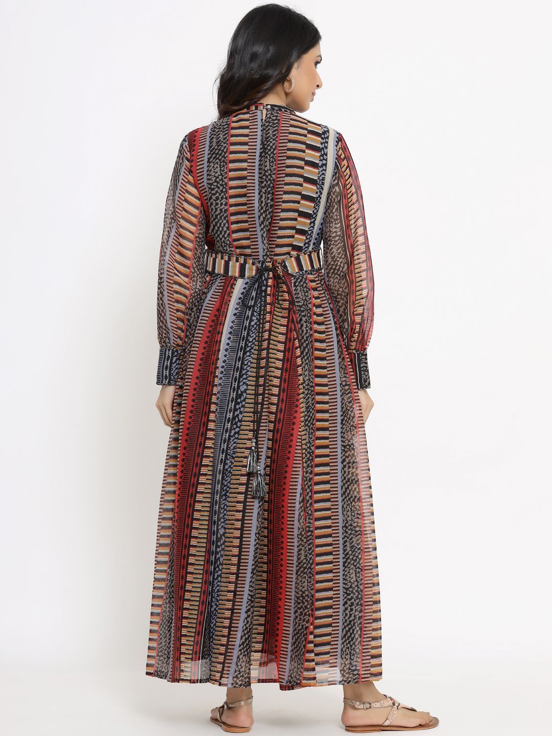 meta_tag_description :Juniper Black Alphin Chiffon Printed Flared Dress with Waist Tie-up