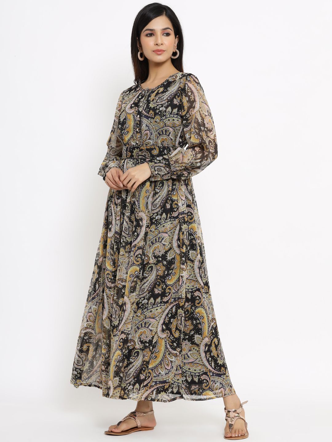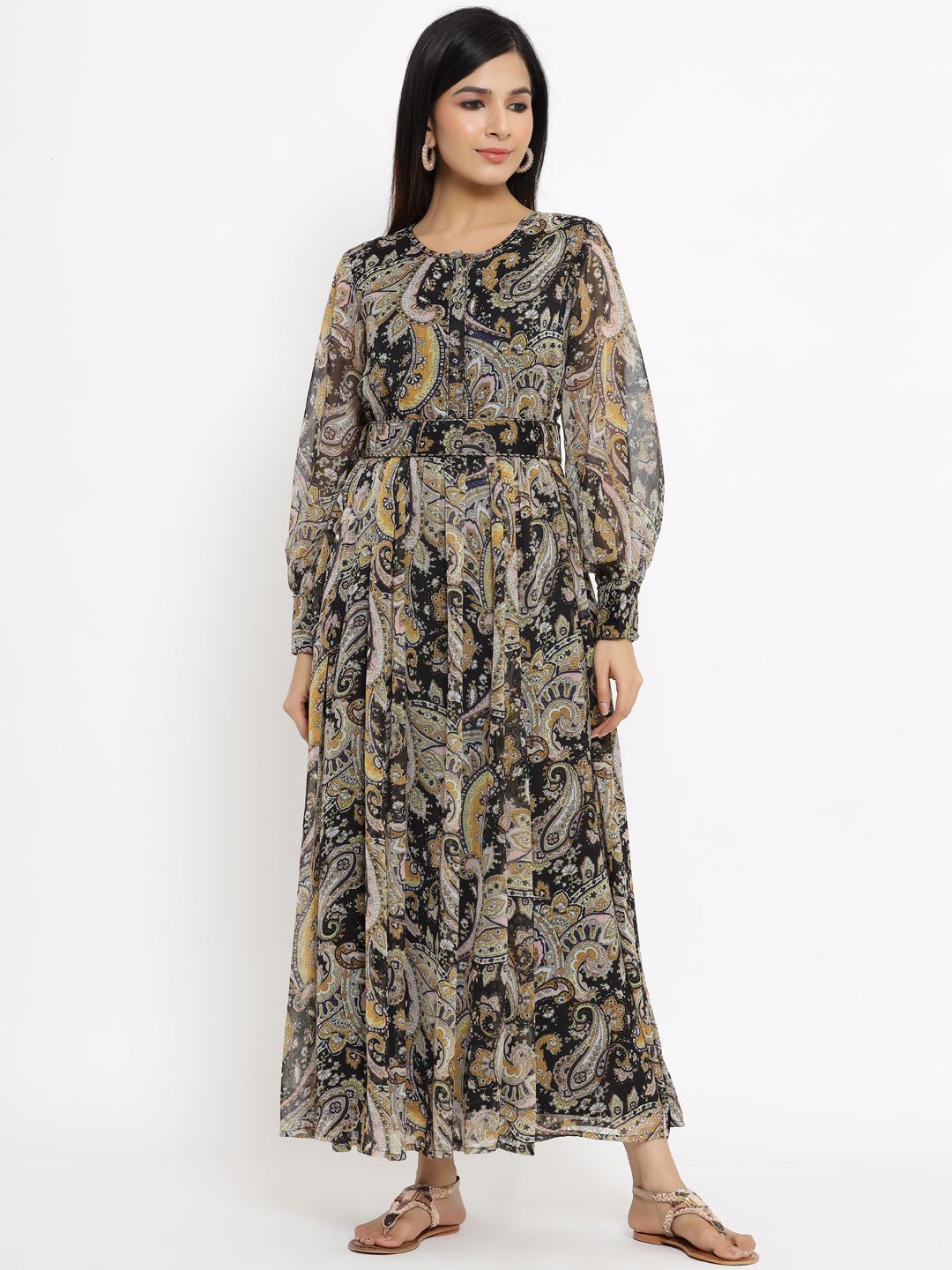 meta_tag_description :Juniper Black Alphin Chiffon Flared Printed Dress With Tie-up Blet