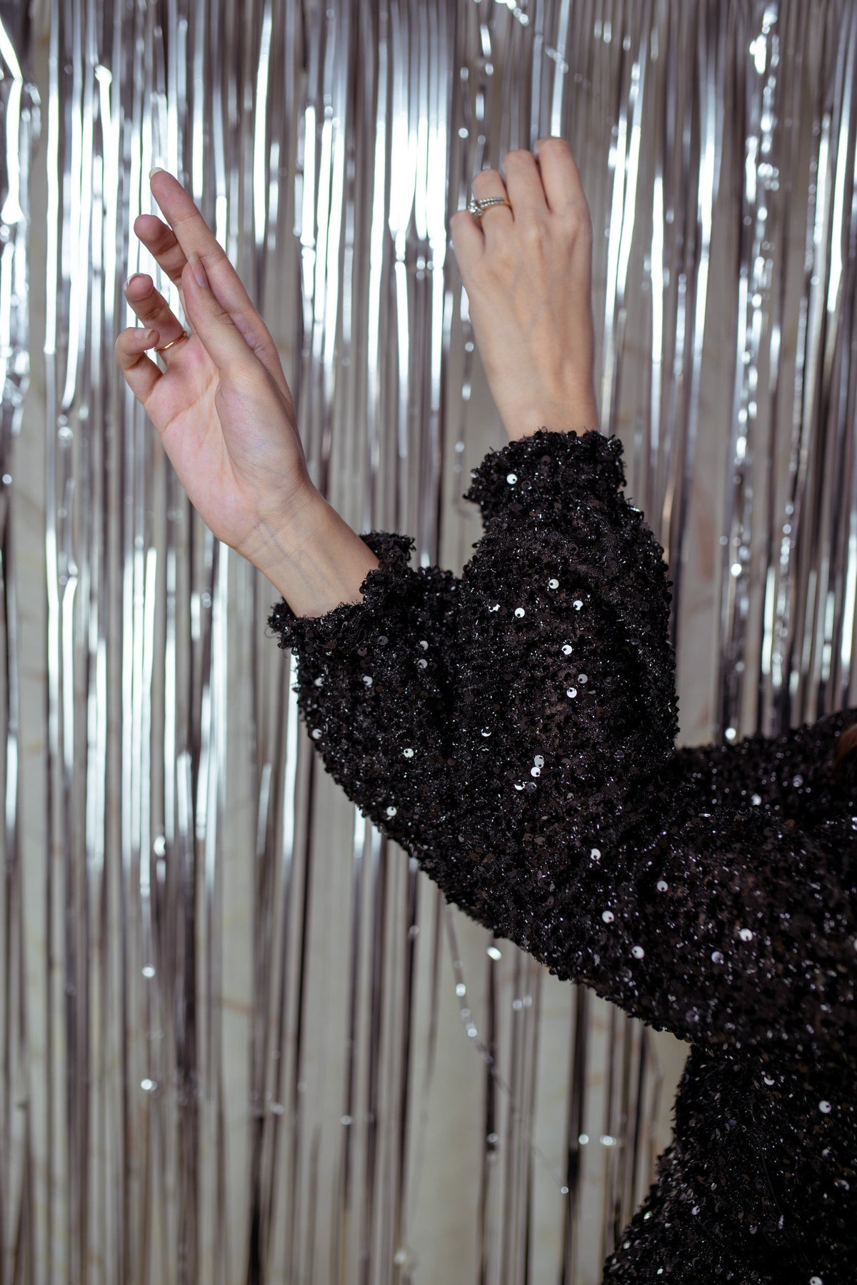 Trendia brings you this Black Sequin Short Dress for women by the brand Label Shaurya Sanadhya. The short dress has a nice pattern. It features a V-neck with full puff sleeves and mid-thigh length. The sequin dress is made of Lycra Fur with black sequin work on it. Check out the photos of the sequin dress for more details.
