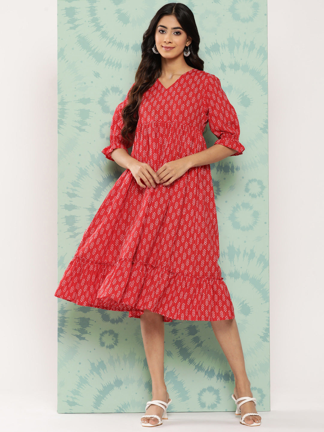 Ethnic Motifs Printed Red Cotton Dress Pattern :Ethnic Motifs Printed Occasion :Casual Style :Flared Length Type :Below Knee Fabric :Cotton Color :Red Wash Care :Hand wash