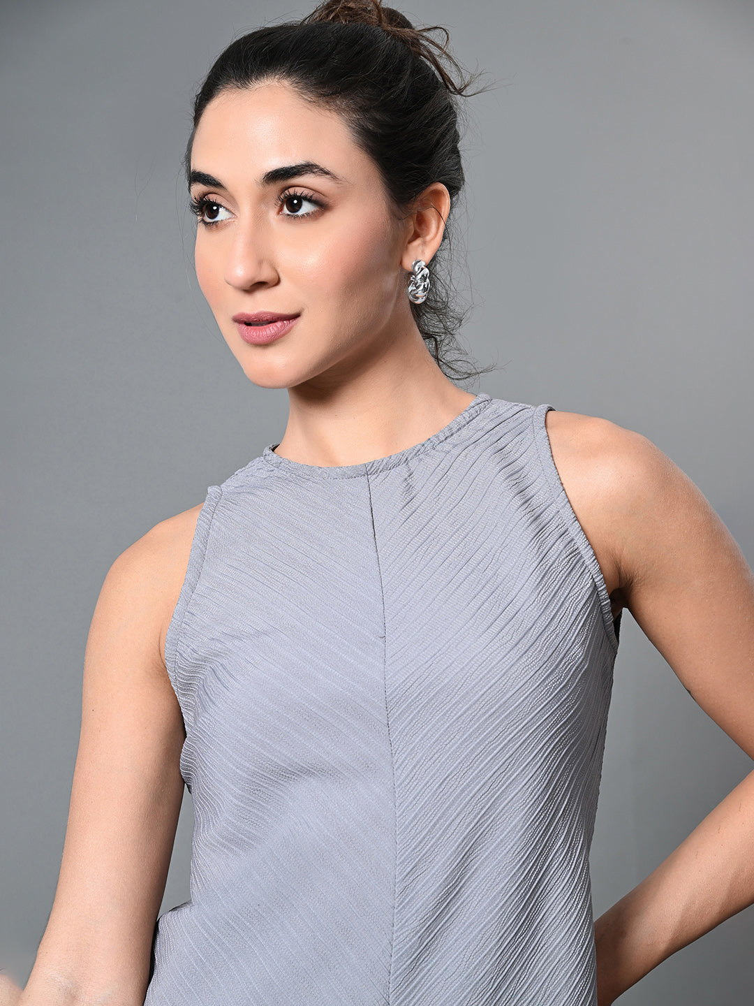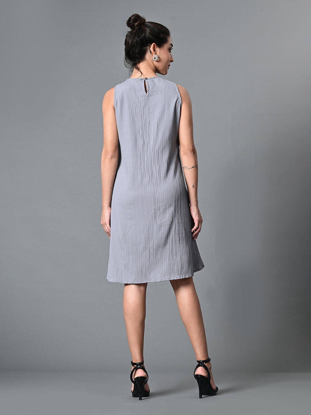 Women Self Design Round Neck Sleeveless Embellished A-Line Dress In Grey Color