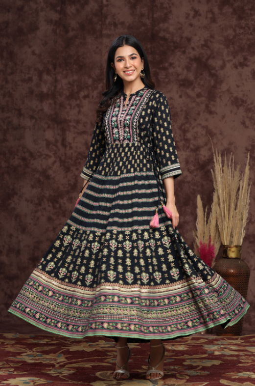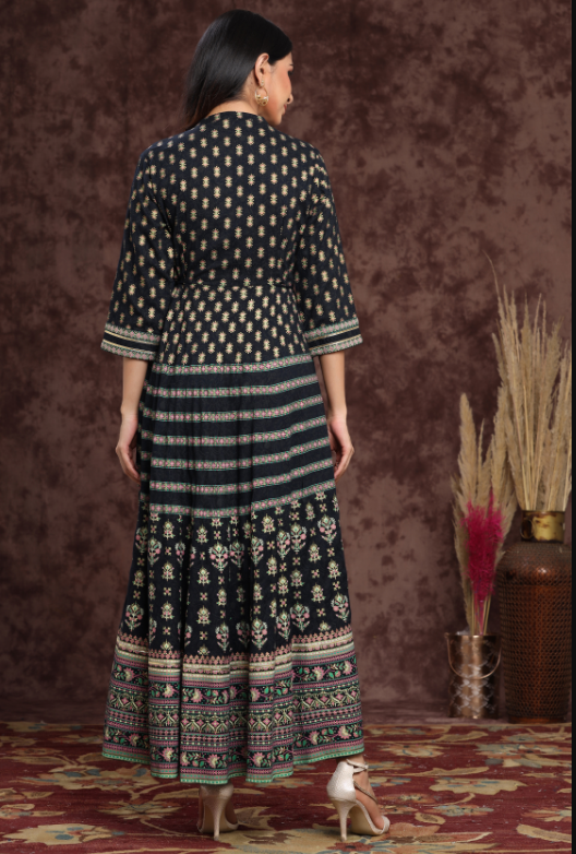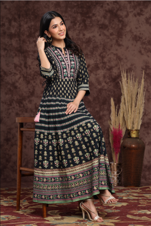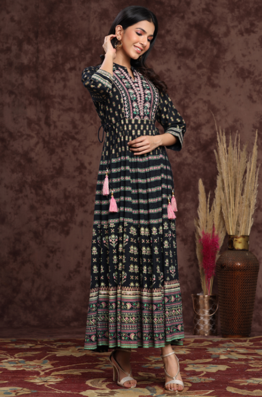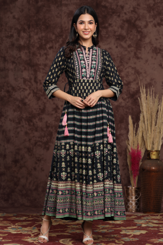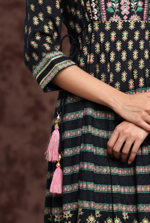 PRODUCT DESCRIPTION :Juniper Darkblue Rayon Embroidered Flared Dress with Side Tie-up