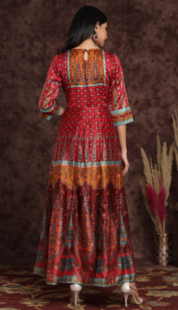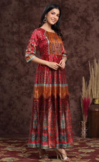 PRODUCT DESCRIPTION :Juniper Maroon Dull Satin Placement Foil Print Anarkali Dress