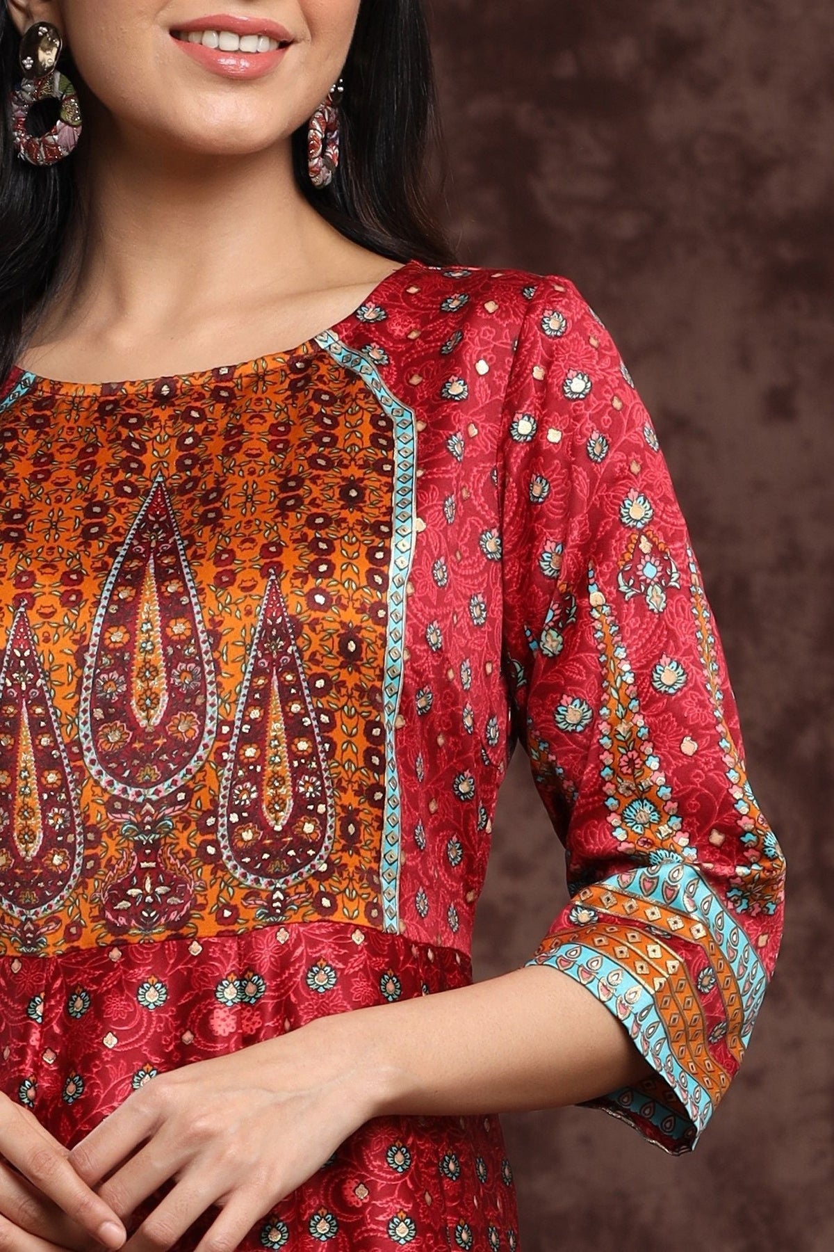 Women's Maroon Dull Satin Printed Anarkali Dress