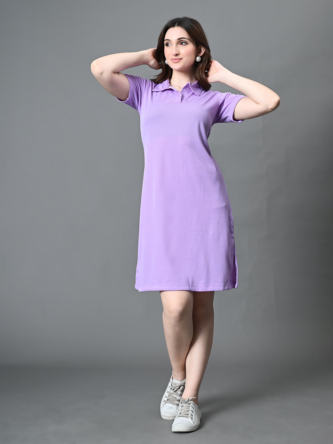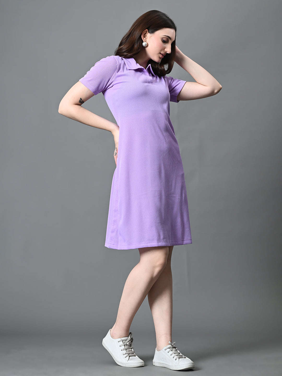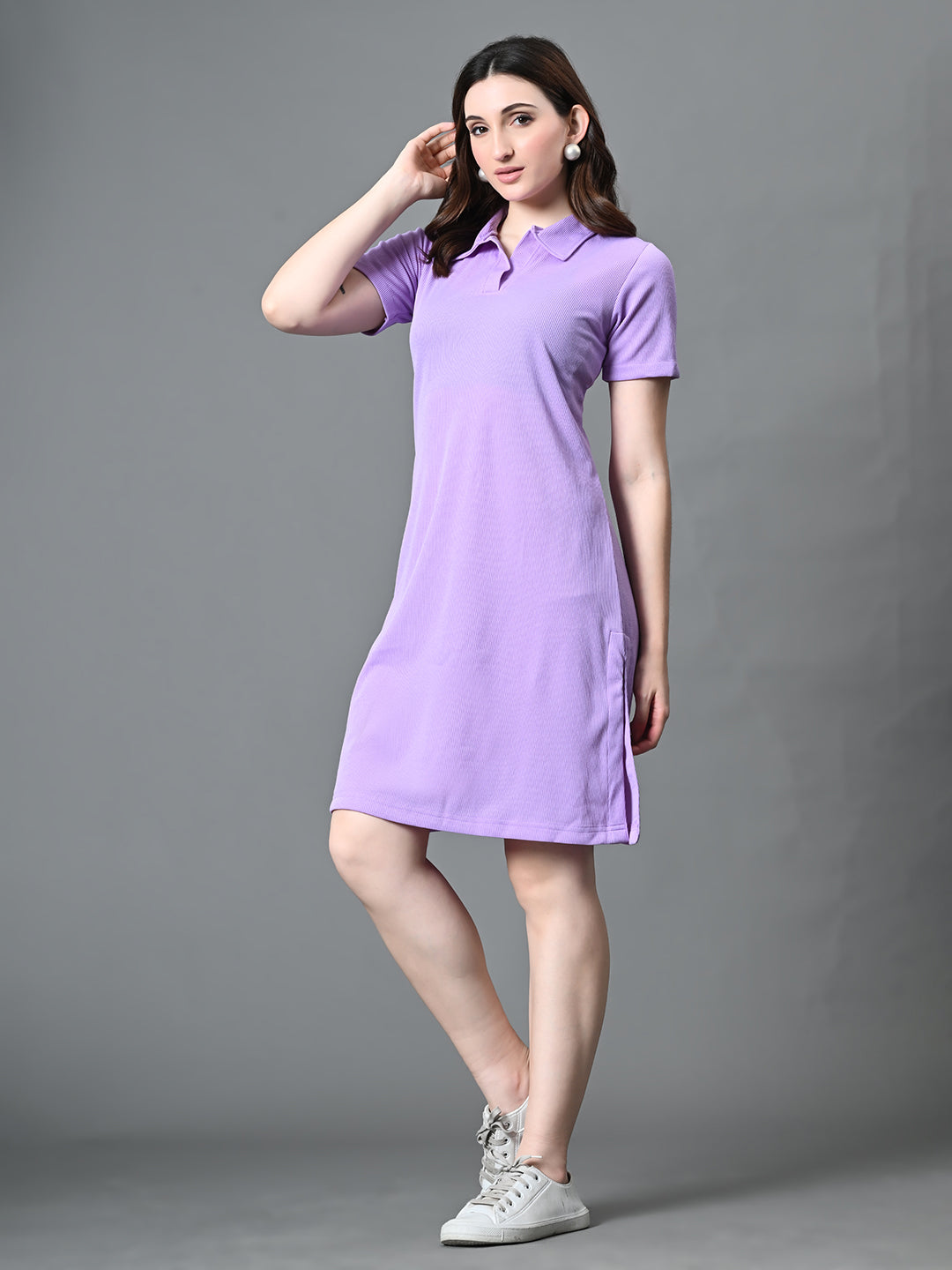Women Solid Collared Neck Short Sleeves Ribbed A-Line Dress In Lavender Color