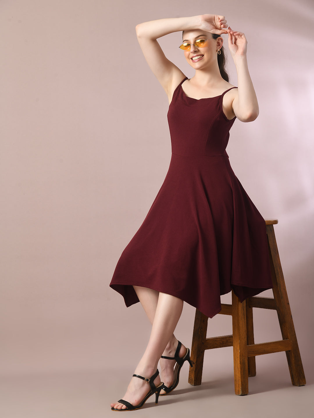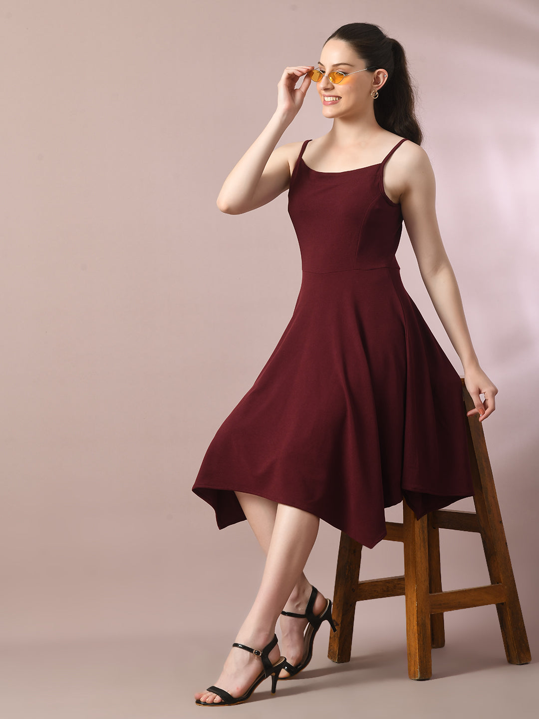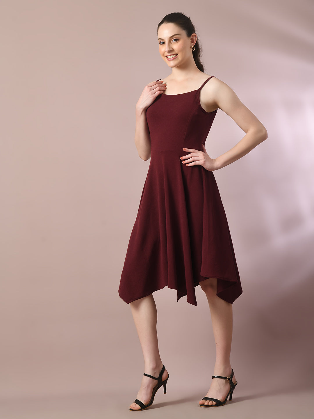 Women Maroon Solid Shoulder Straps Fit And Flare Party Dress