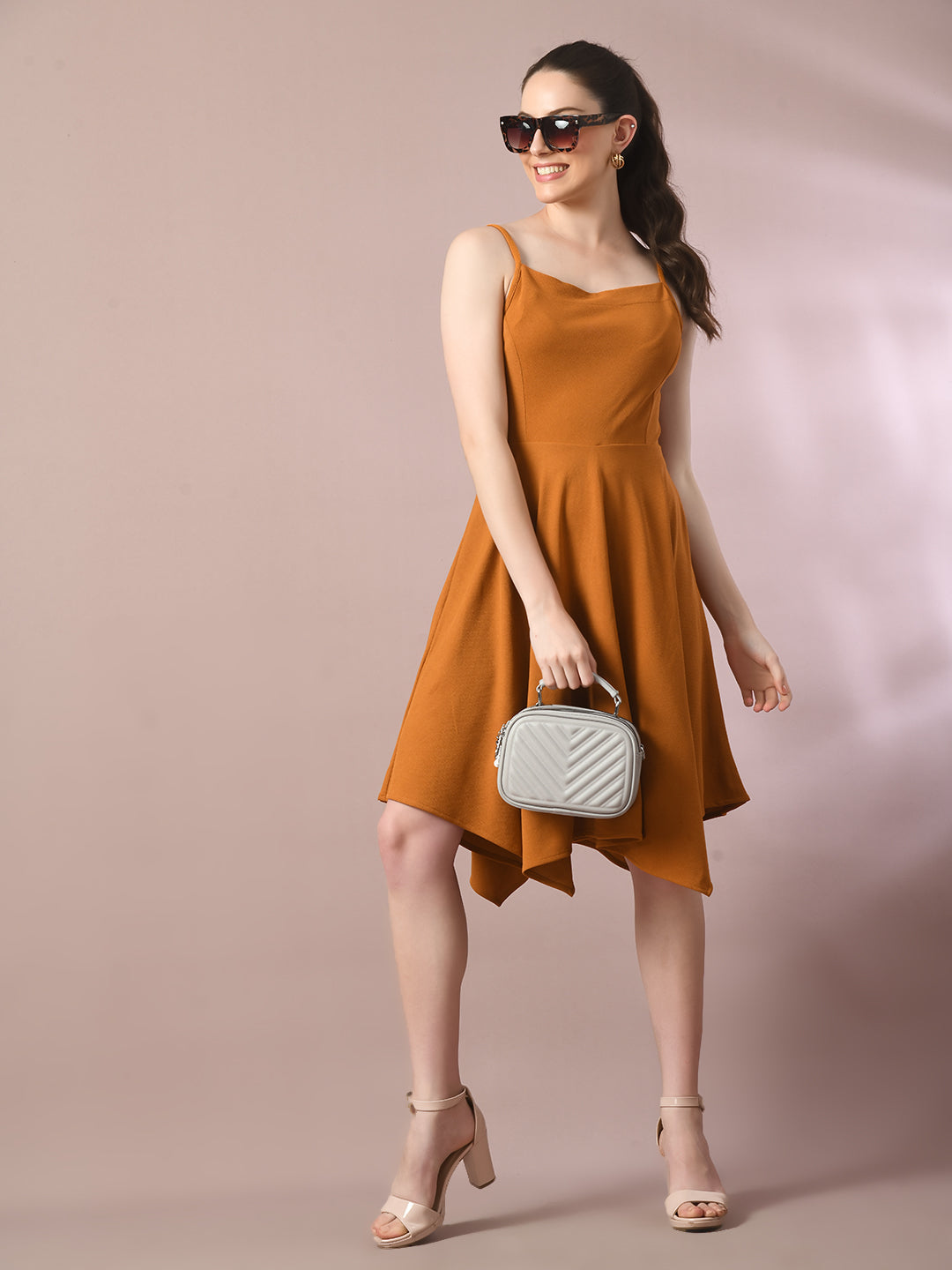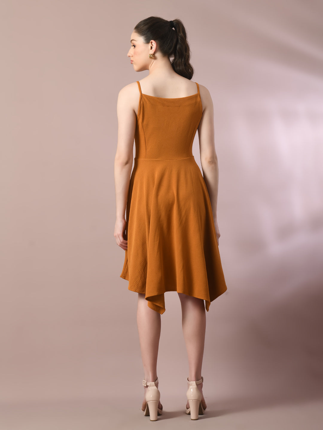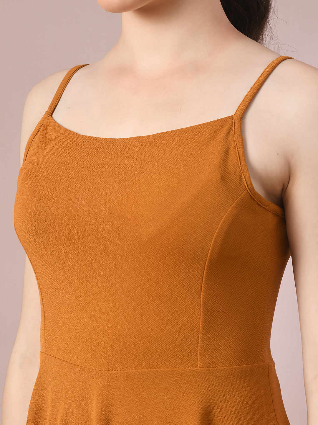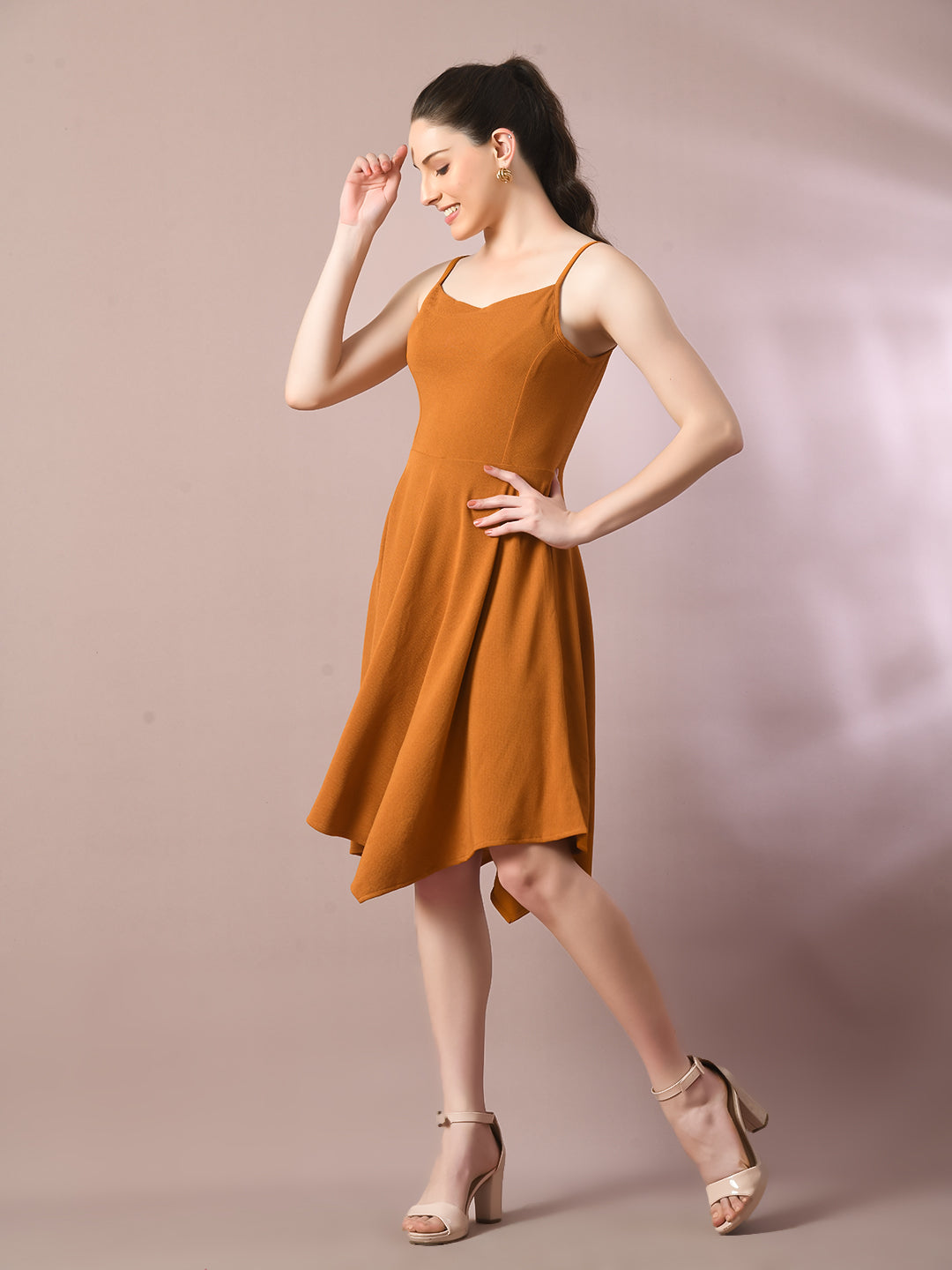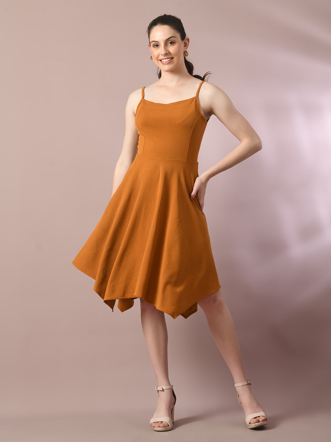 Women Mustard Solid Shoulder Straps Fit And Flare Party Dress