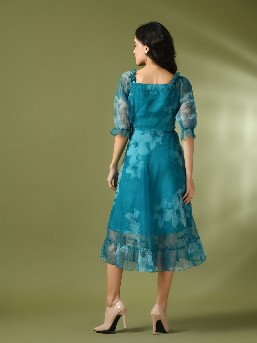 Women Teal Printed Square Neck Fit And Flare Party Dress