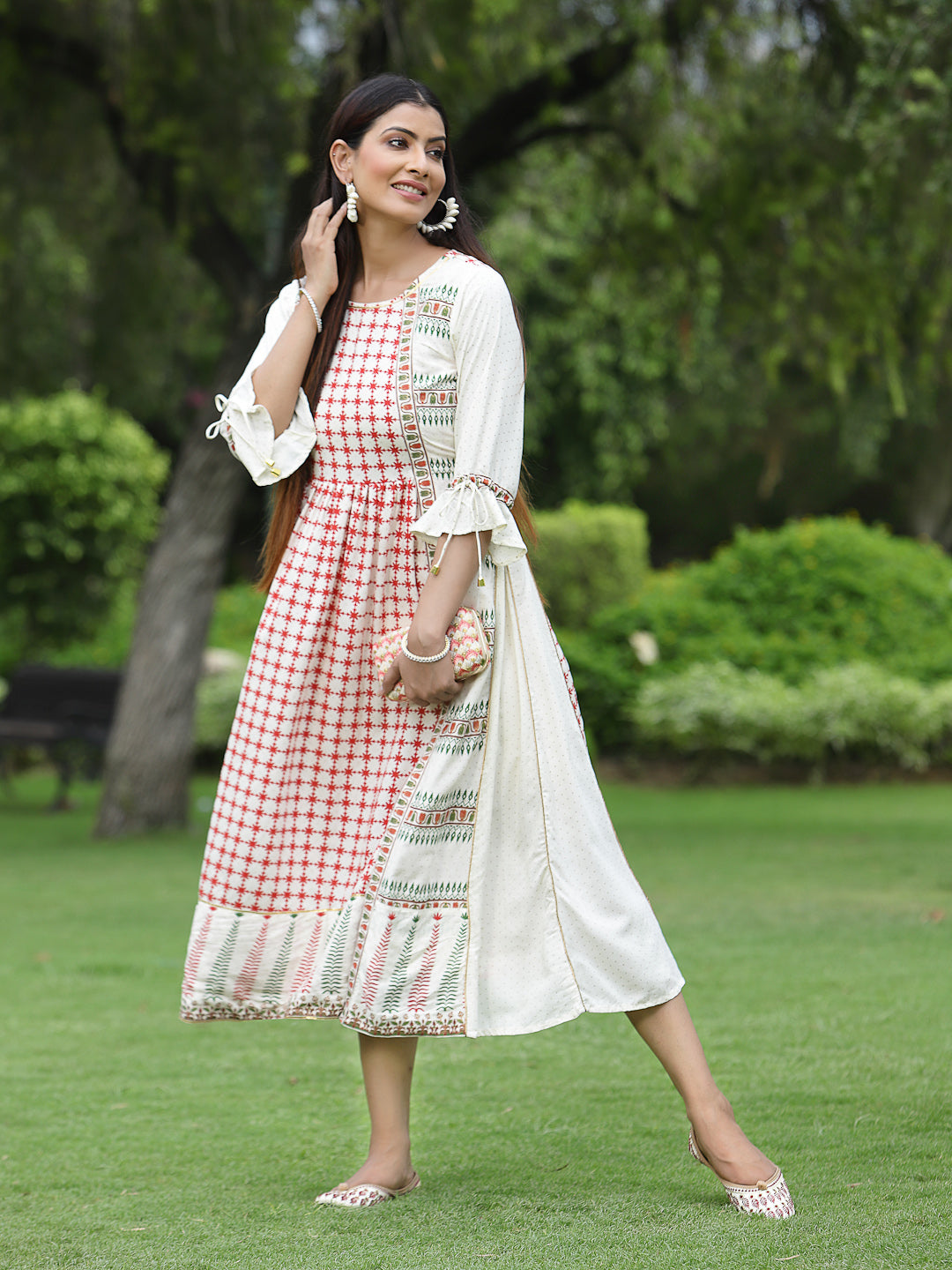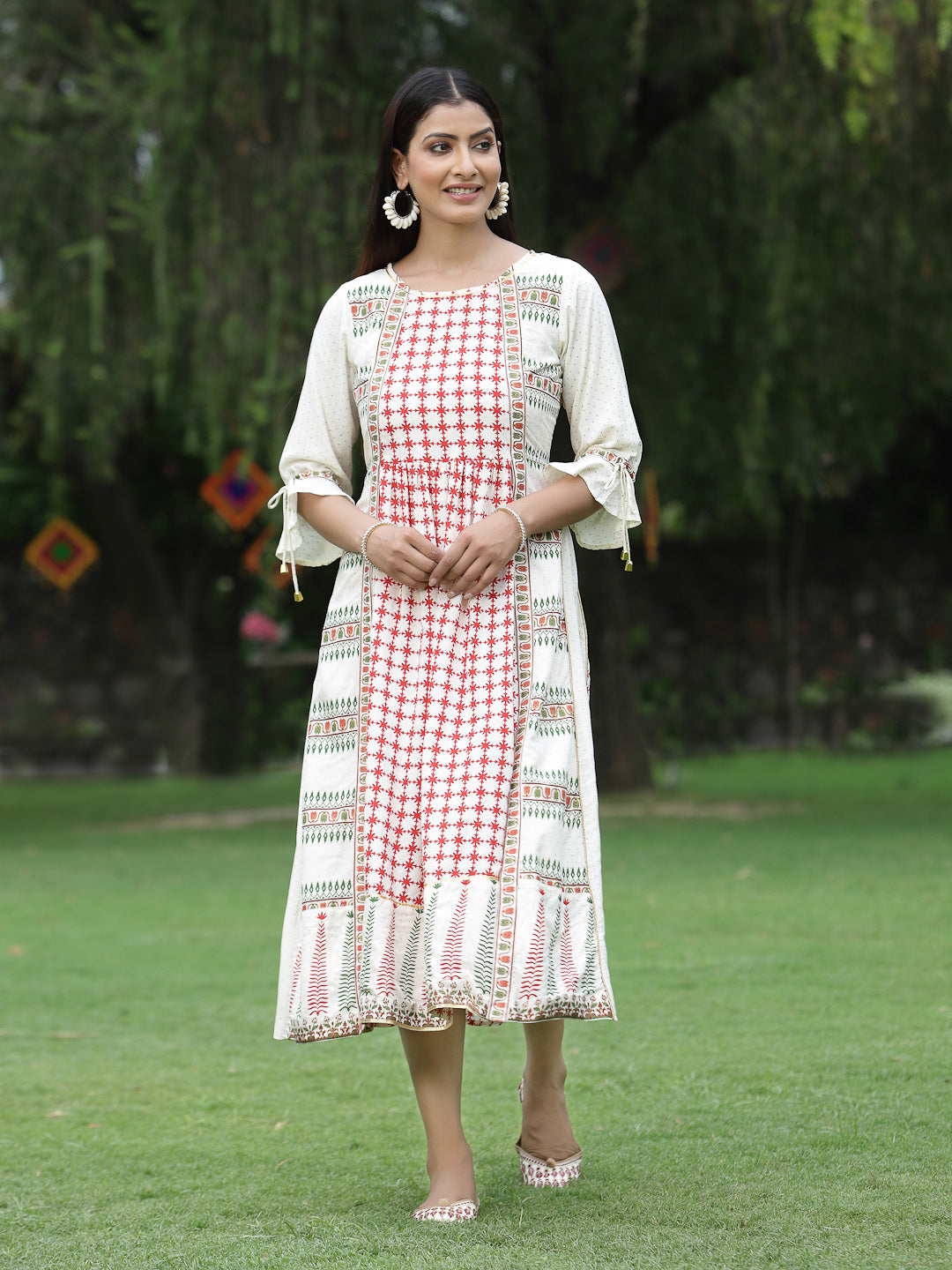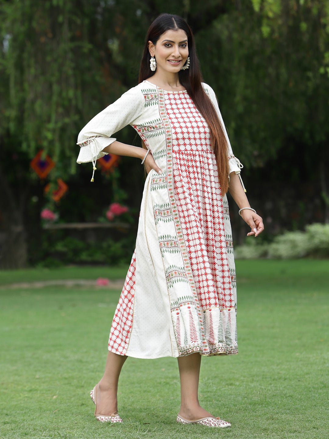 Juniper Women'S Ivory Rayon Printed A-Line Dress Perfect For Fusion Clothing With A Traditional Twist, Trendy Silhouette And Latest Styles