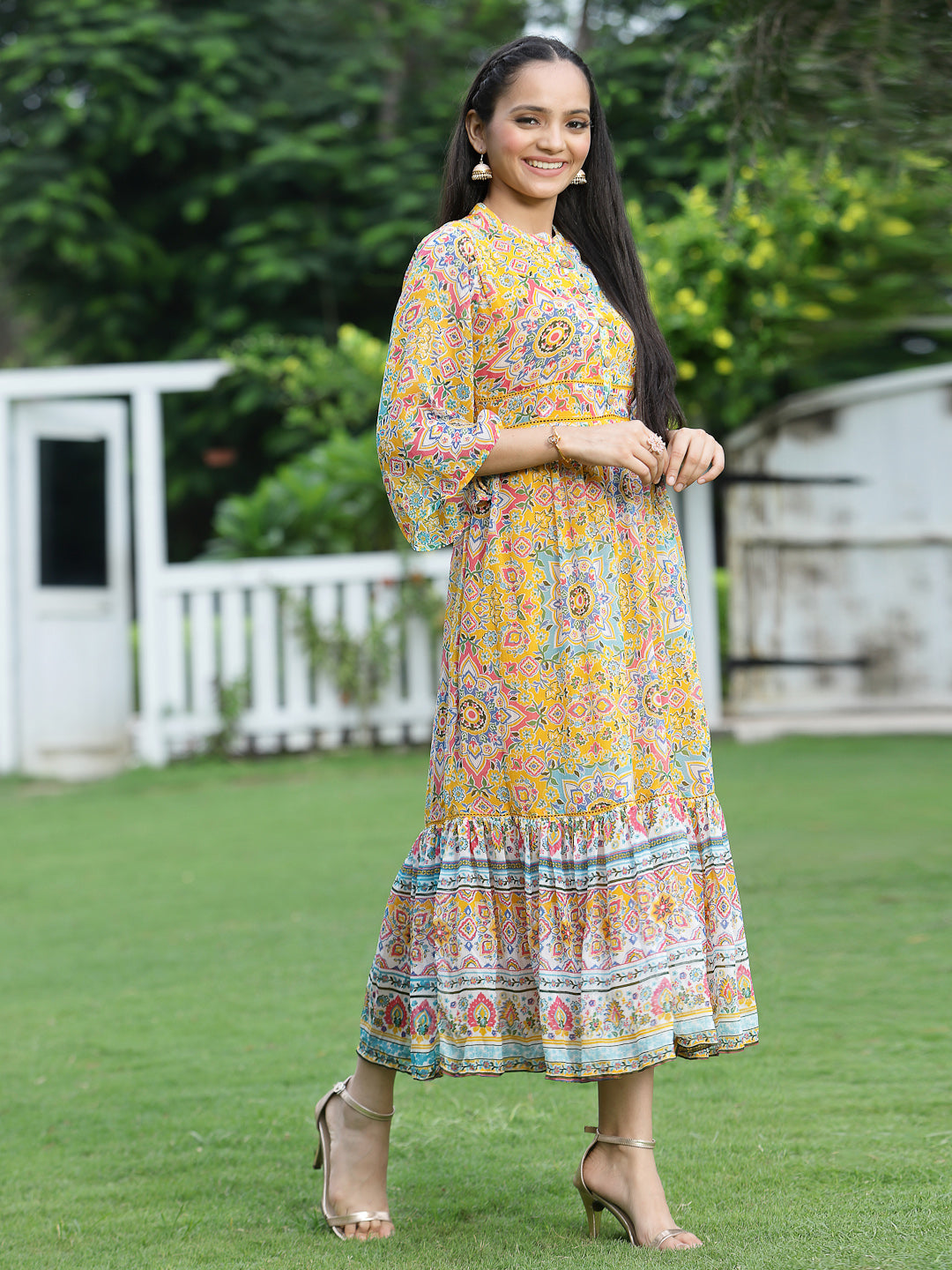 Juniper Women'S Mustard Chiffon Printed Tiered Dress Perfect For Fusion Clothing With A Traditional Twist, Trendy Silhouette And Latest Styles
