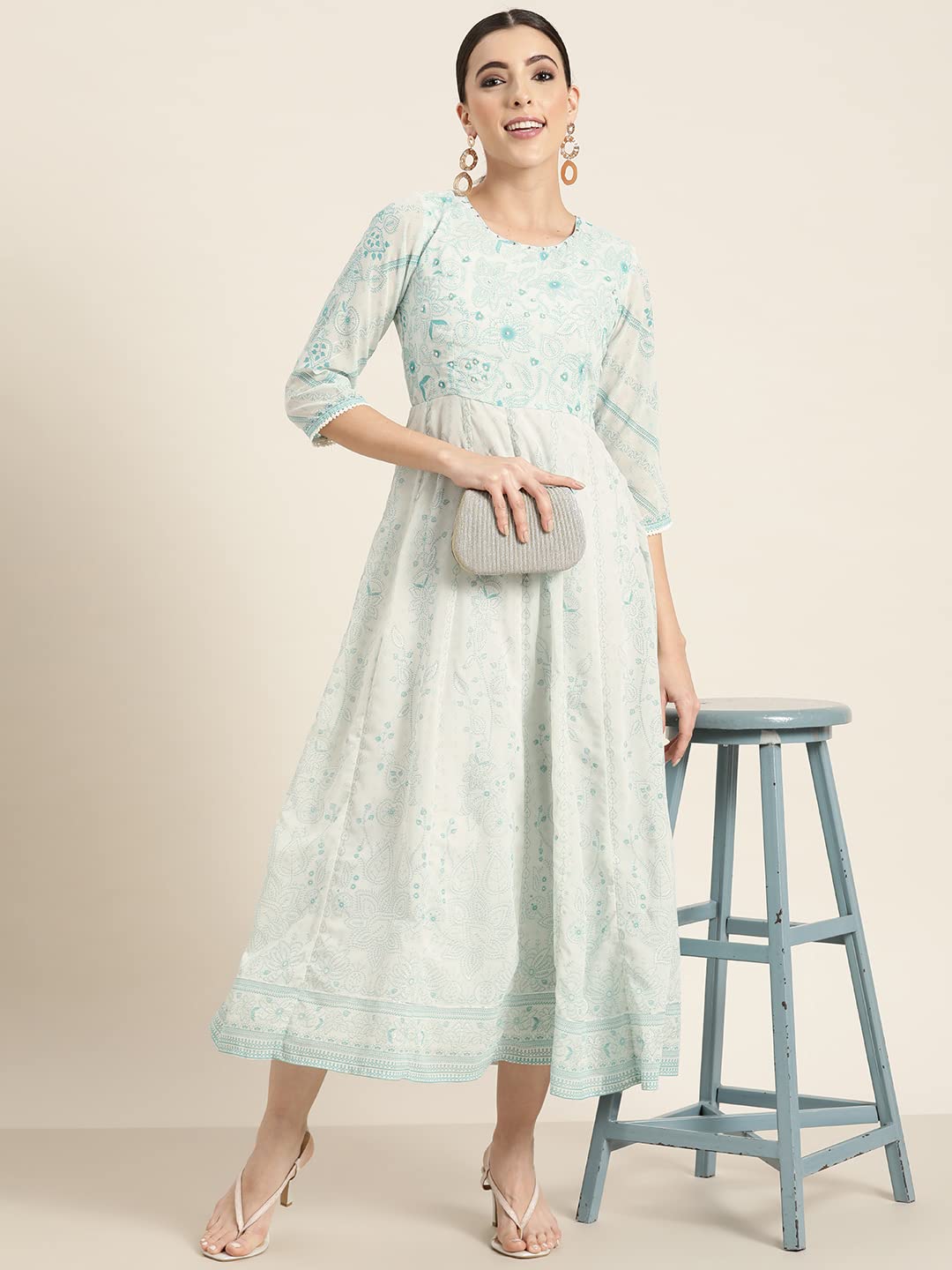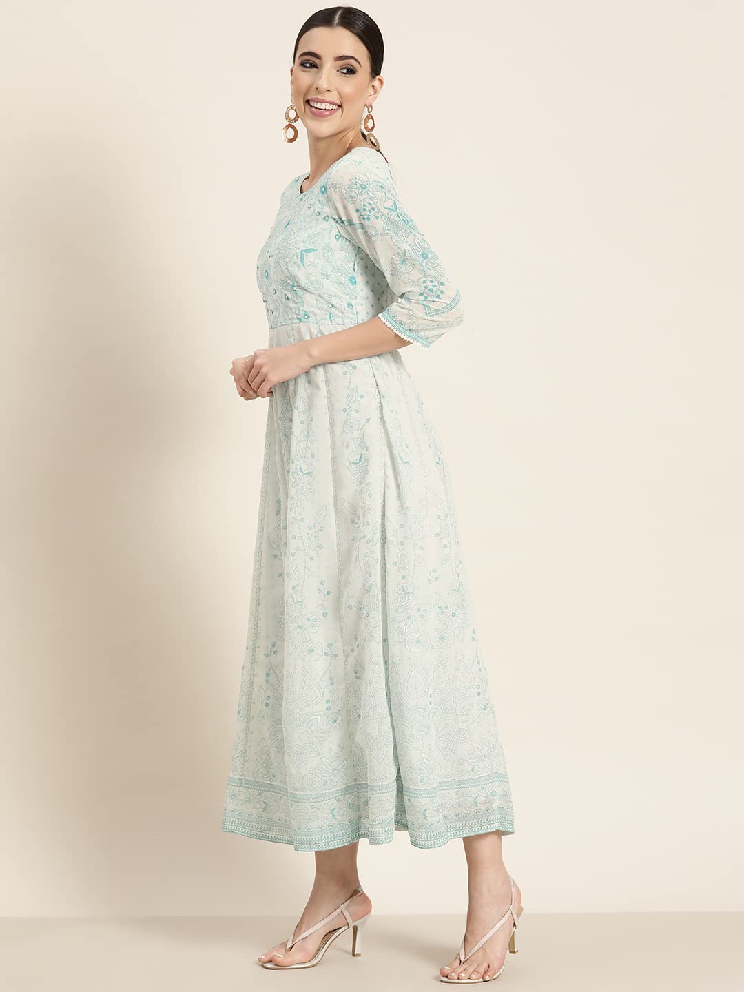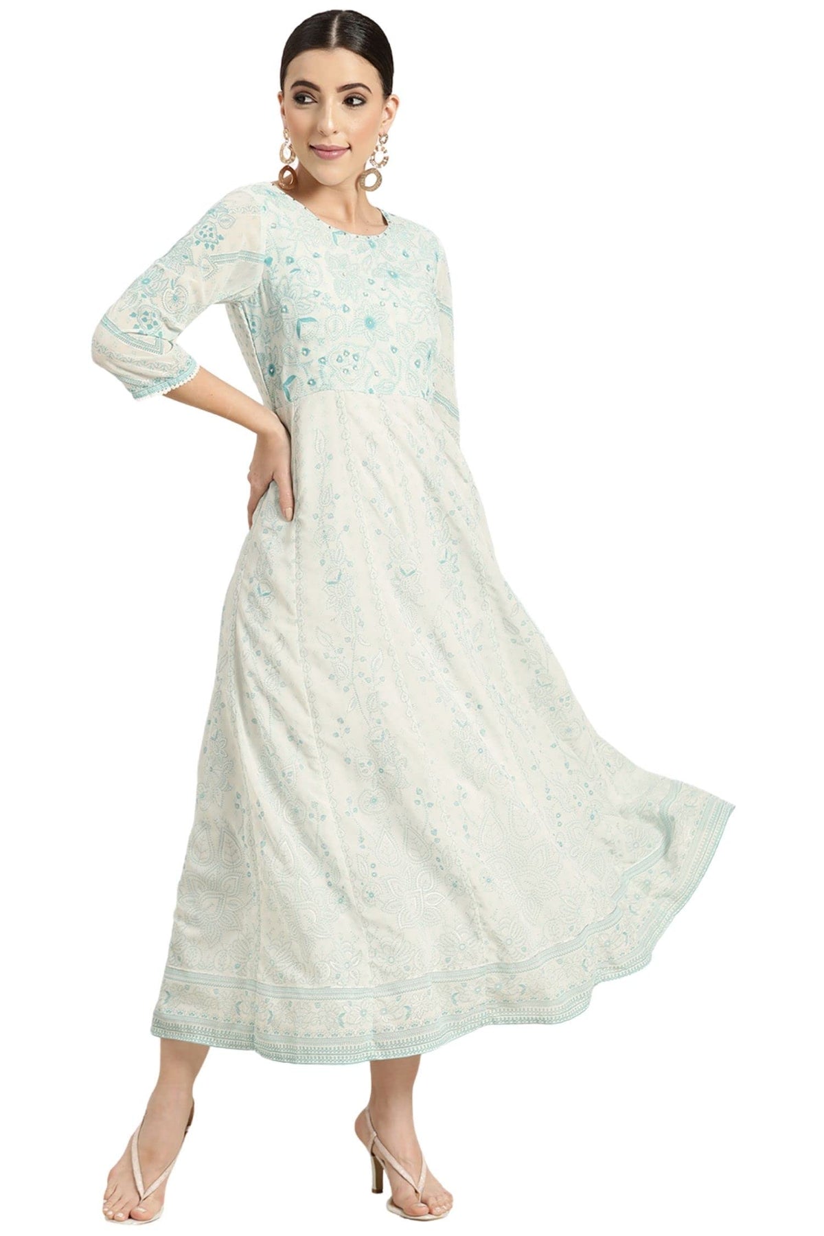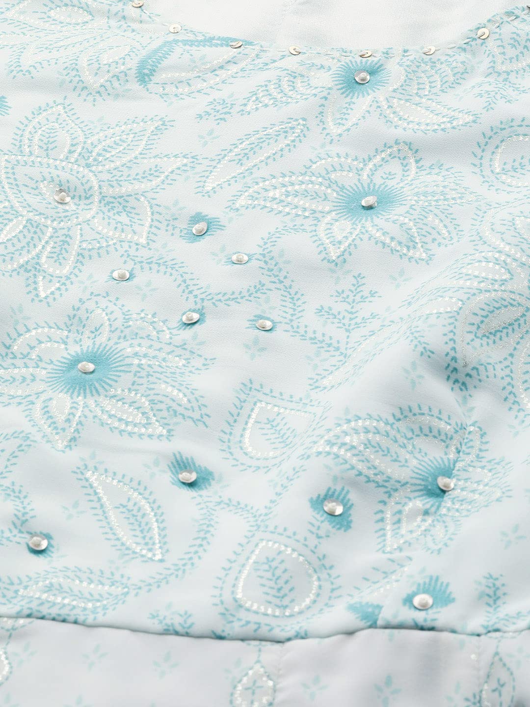 Blue Floral Printed Georgette Anarkali Maxi Dress With Kantha Work Adorned With Sequins At The Neckline. It Features A Round Neckline, And Three-Quarter Regular Sleeves. Perfect For Festive Wear, Showcasing Intricate Sequins And Bead Detailing.