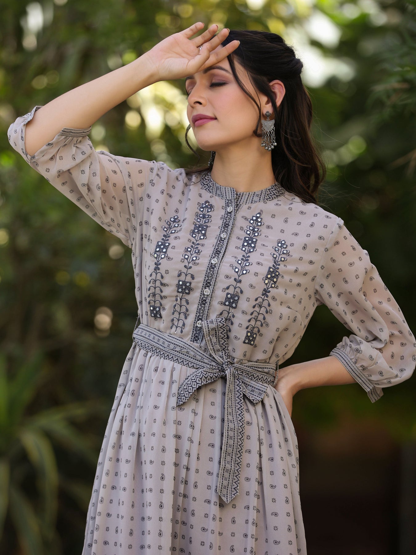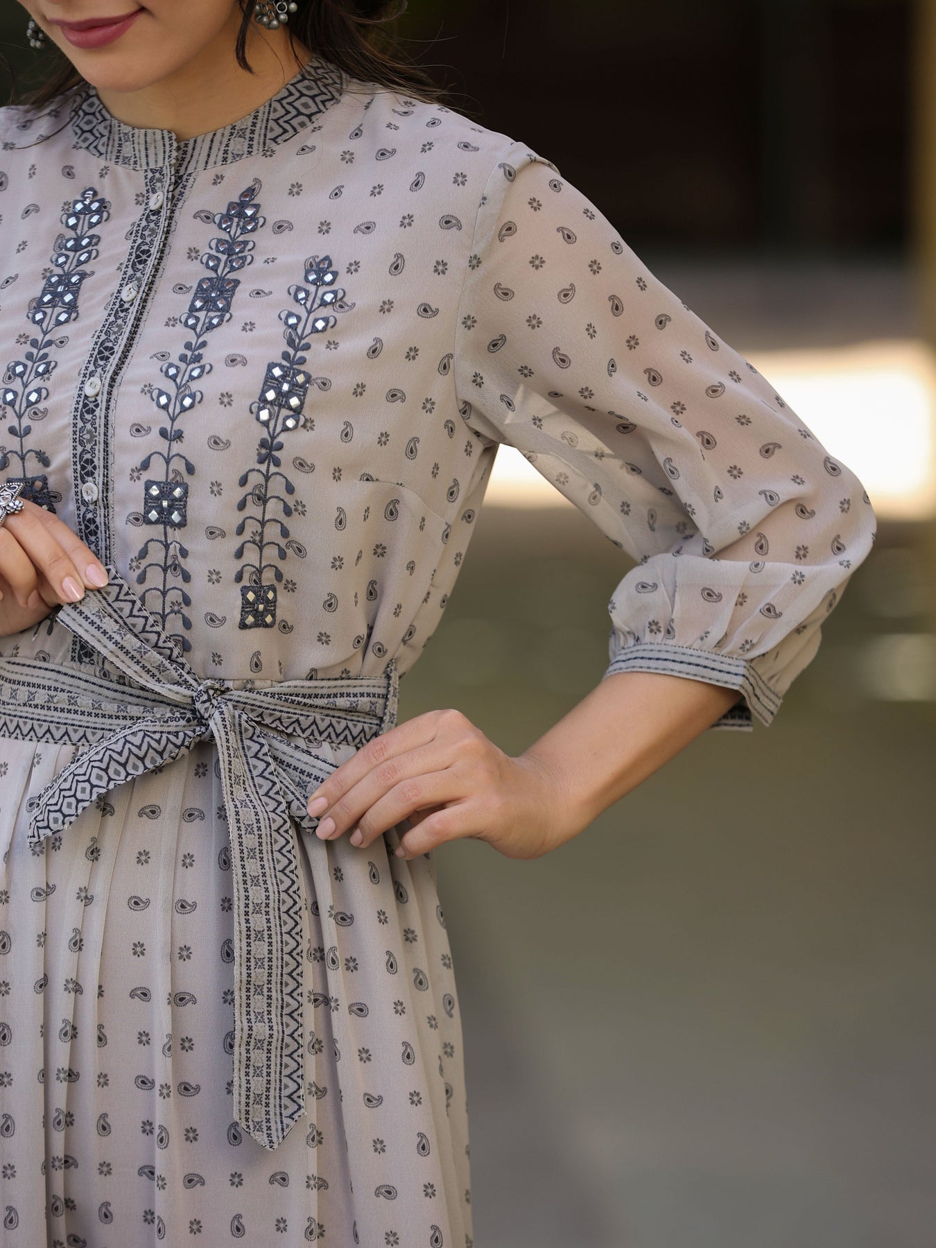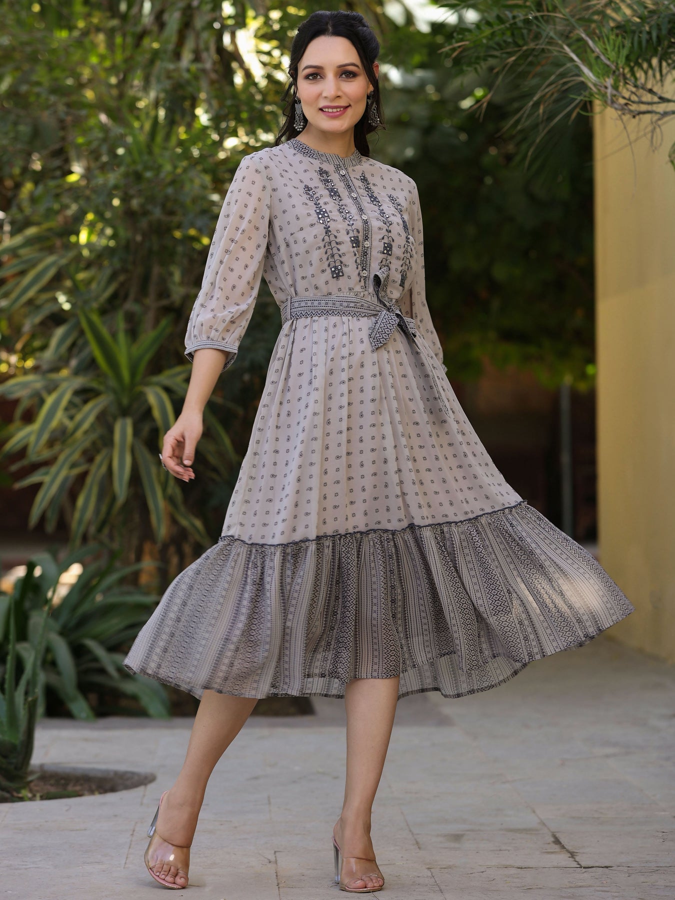 Juniper Women's Beige Printed Flared Dress Length :Calf Length Shape :Flared Fabric :Top:-Georgette,Lining:-Shantoon Color :Beige Pattern :Printed Neck Line :Mandarin Collar Wash Care :Hand Wash Weight(G) :300