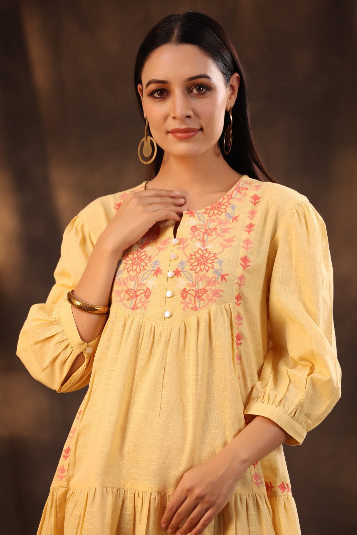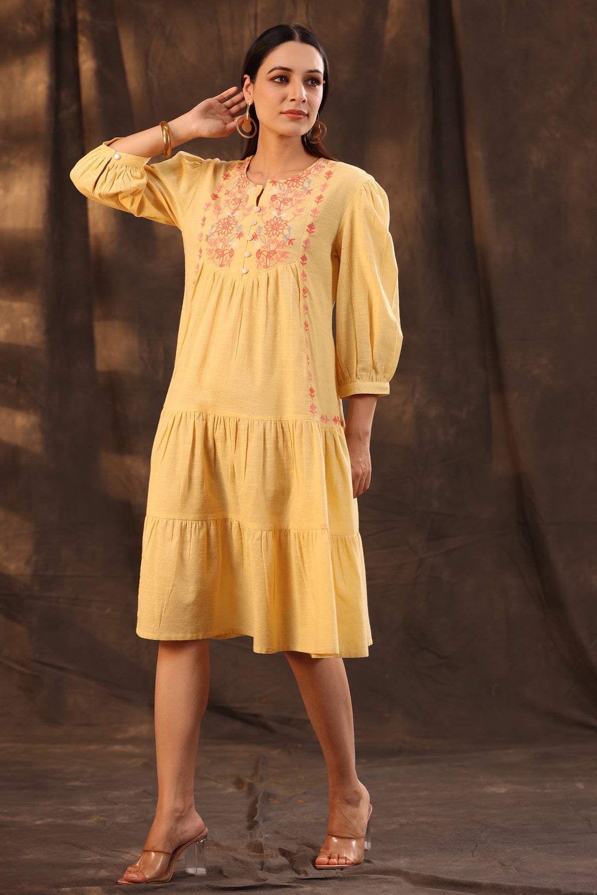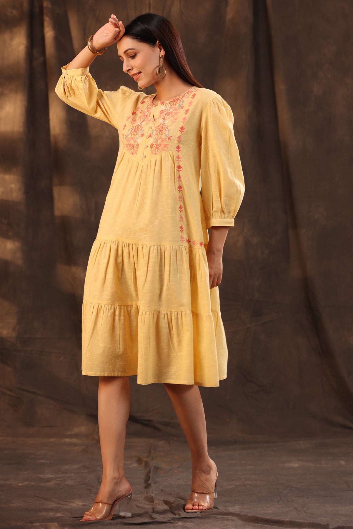 Juniper Women's Yellow Cotton Slub Solid Embroidered Tiered Dress Length :Knee Length Shape :Regular fit Fabric :Cambric Color :Yellow Pattern :Print Neck Line :Round neck Wash Care :Hand Wash Weight(G) :300