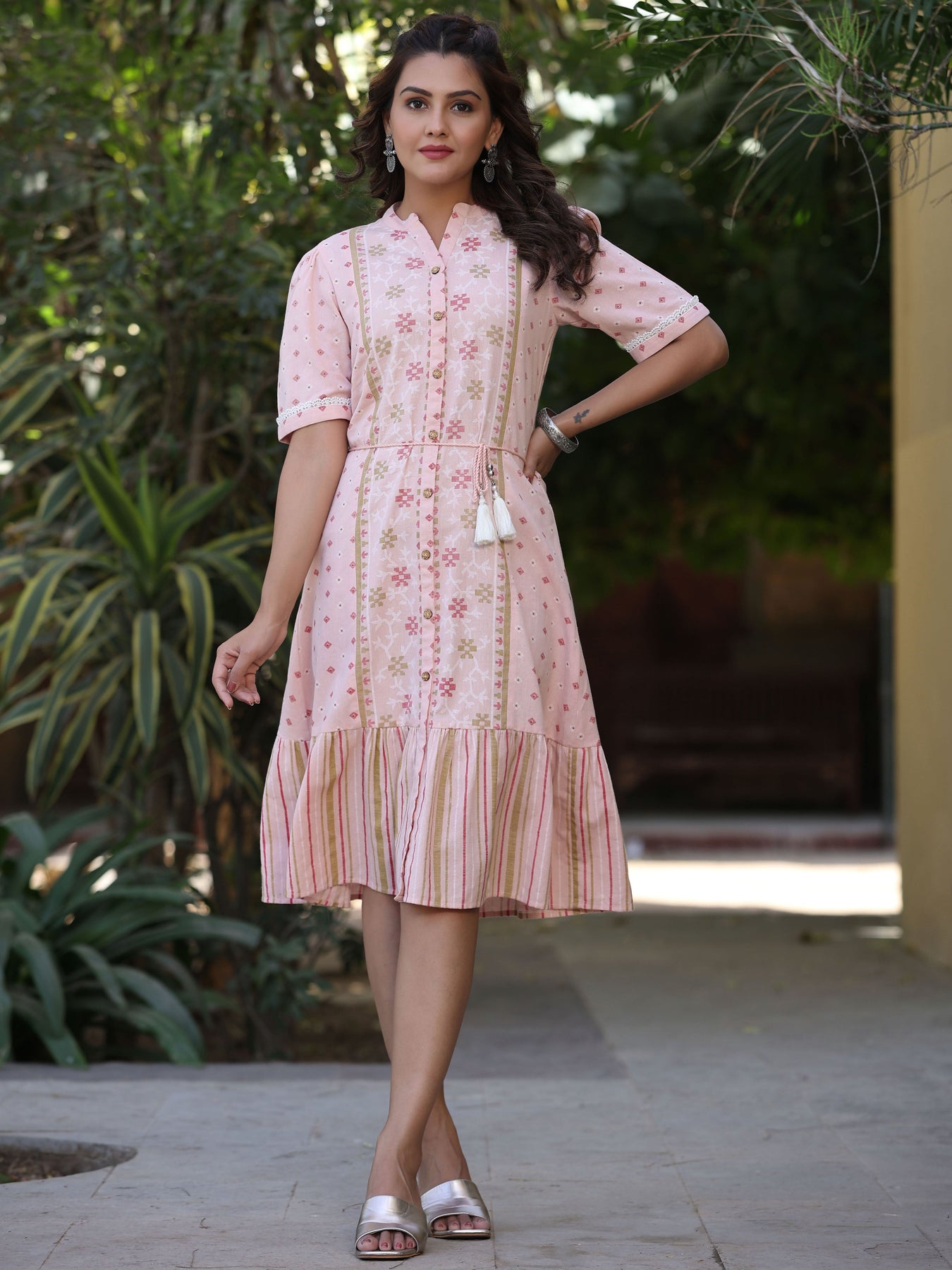 Juniper Women'S Pink Cotton Printed Embroidered Flared Dress Length :Calf Length Shape :Flare fit Fabric :Cotton Flex Color :Pink Pattern :Print Neck Line :Mandarin Wash Care :Hand Wash Weight(G) :300
