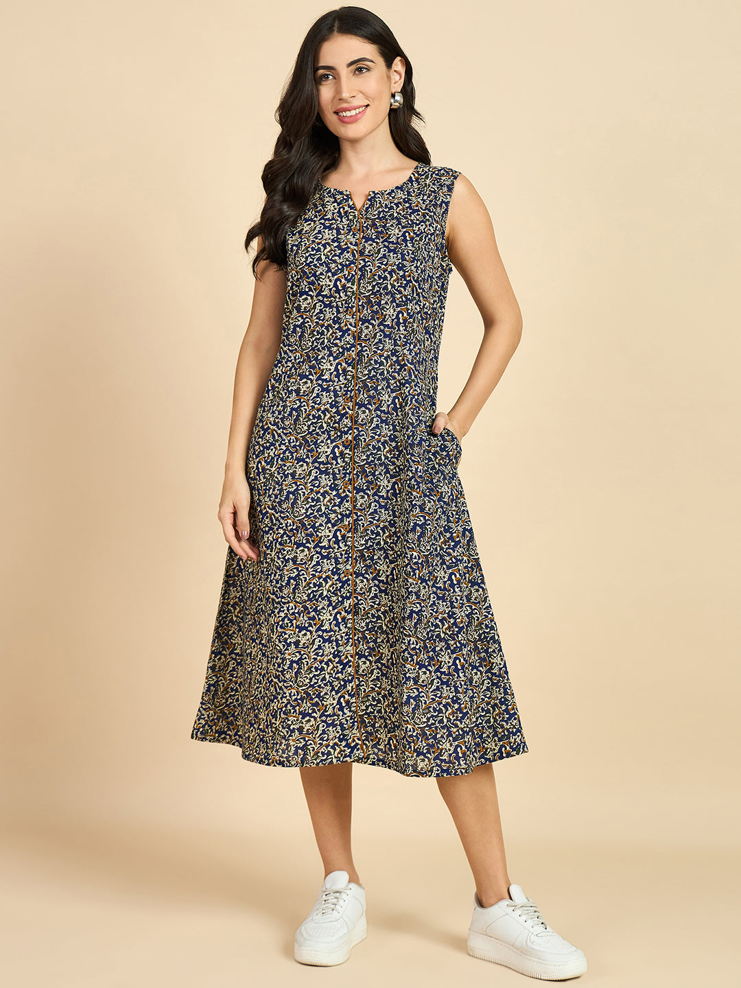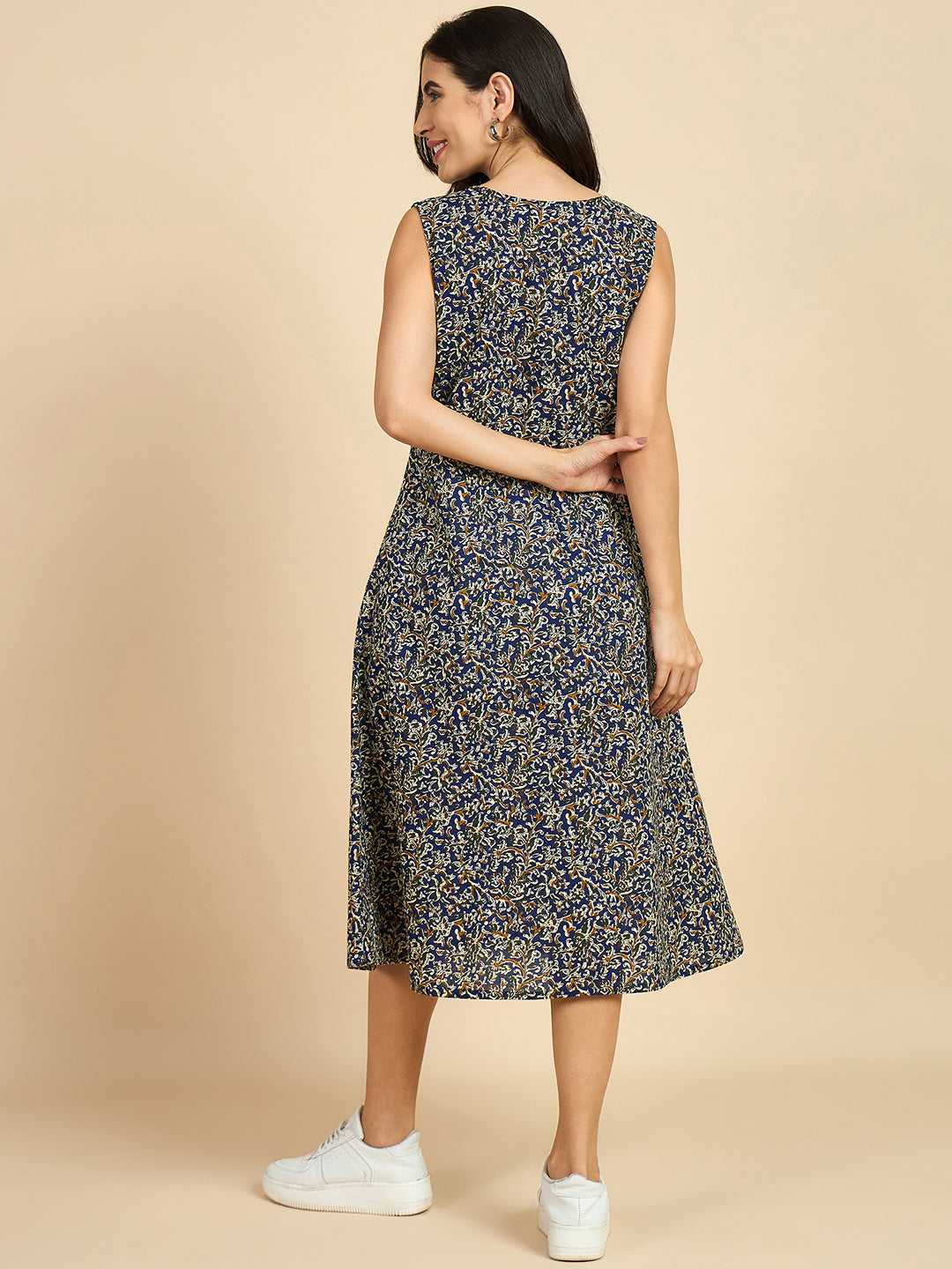 Women's Blue Cotton Floral Printed A Line Dress - Azira