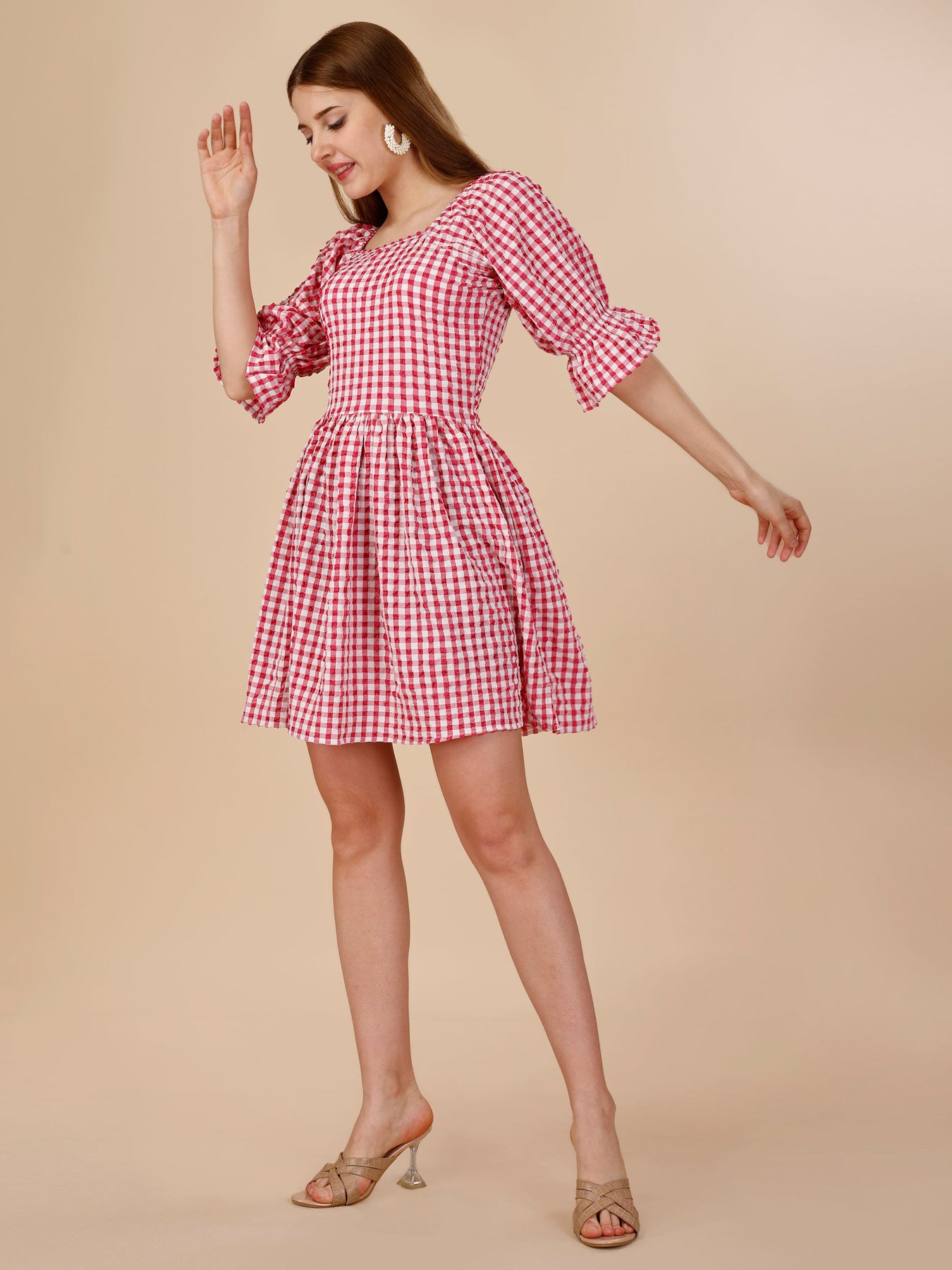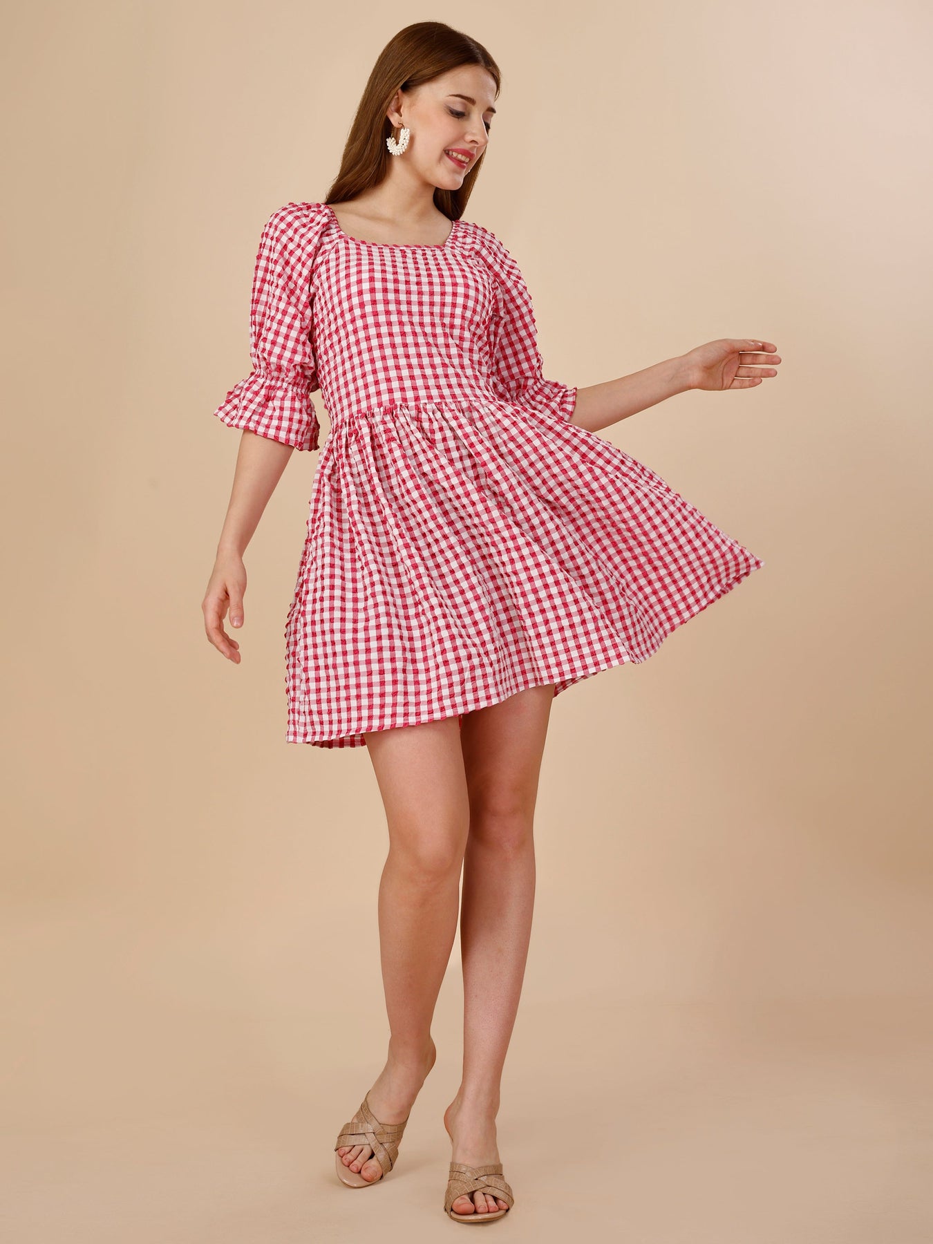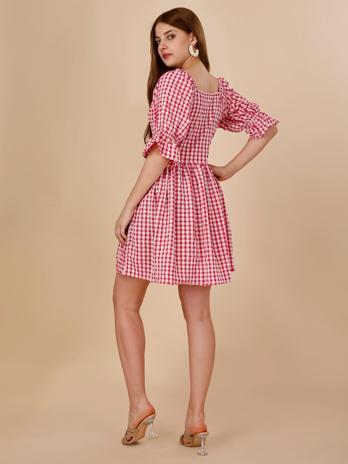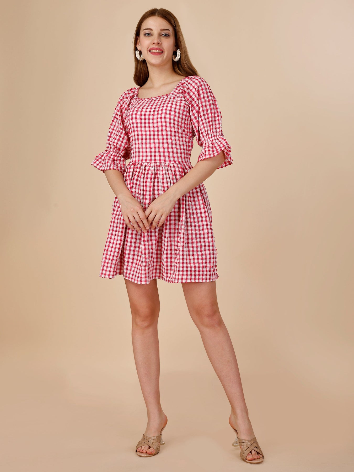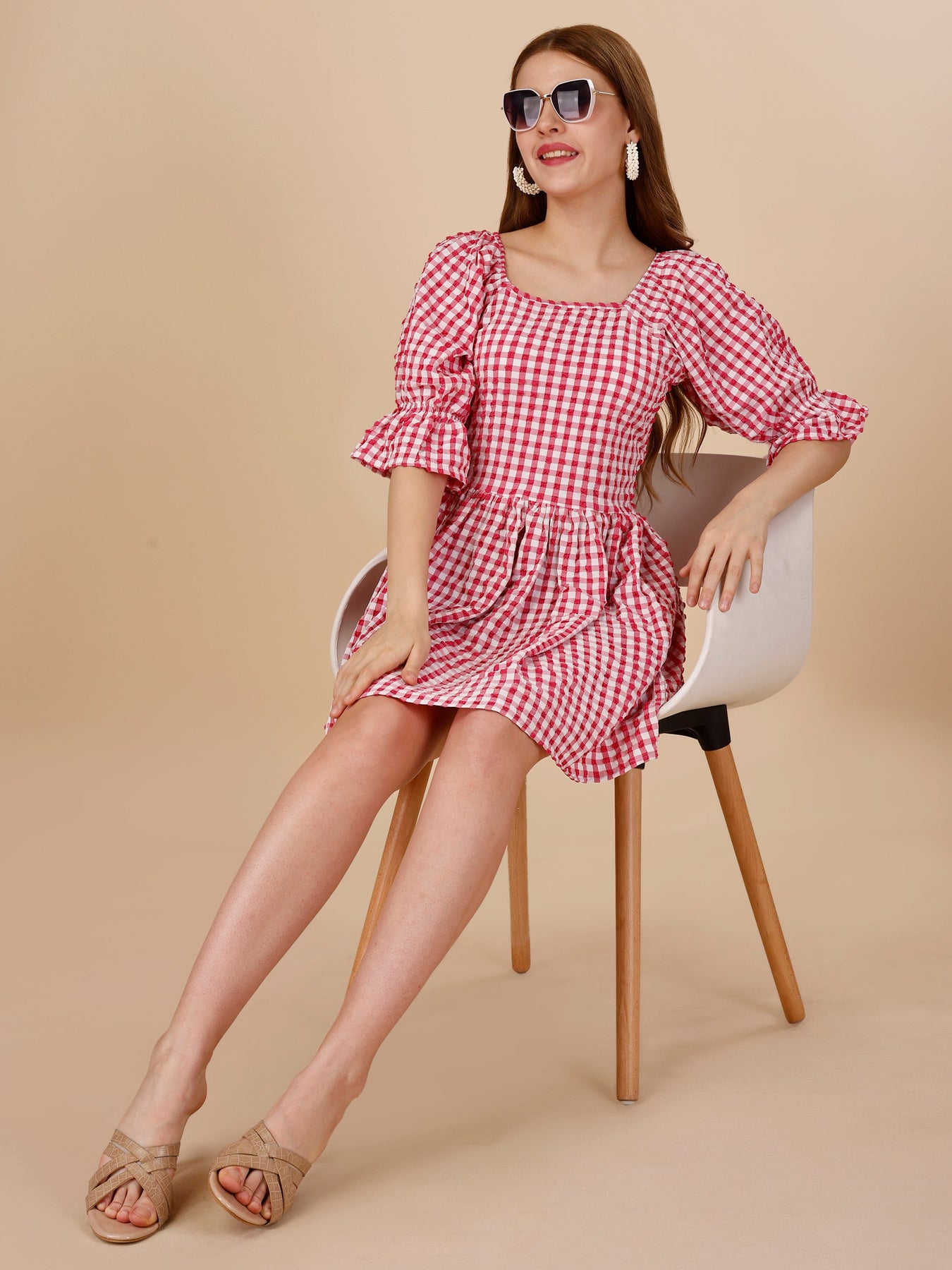 Women's Checked Printed Knee Length Square Neck Silk Blend Dress (Red)