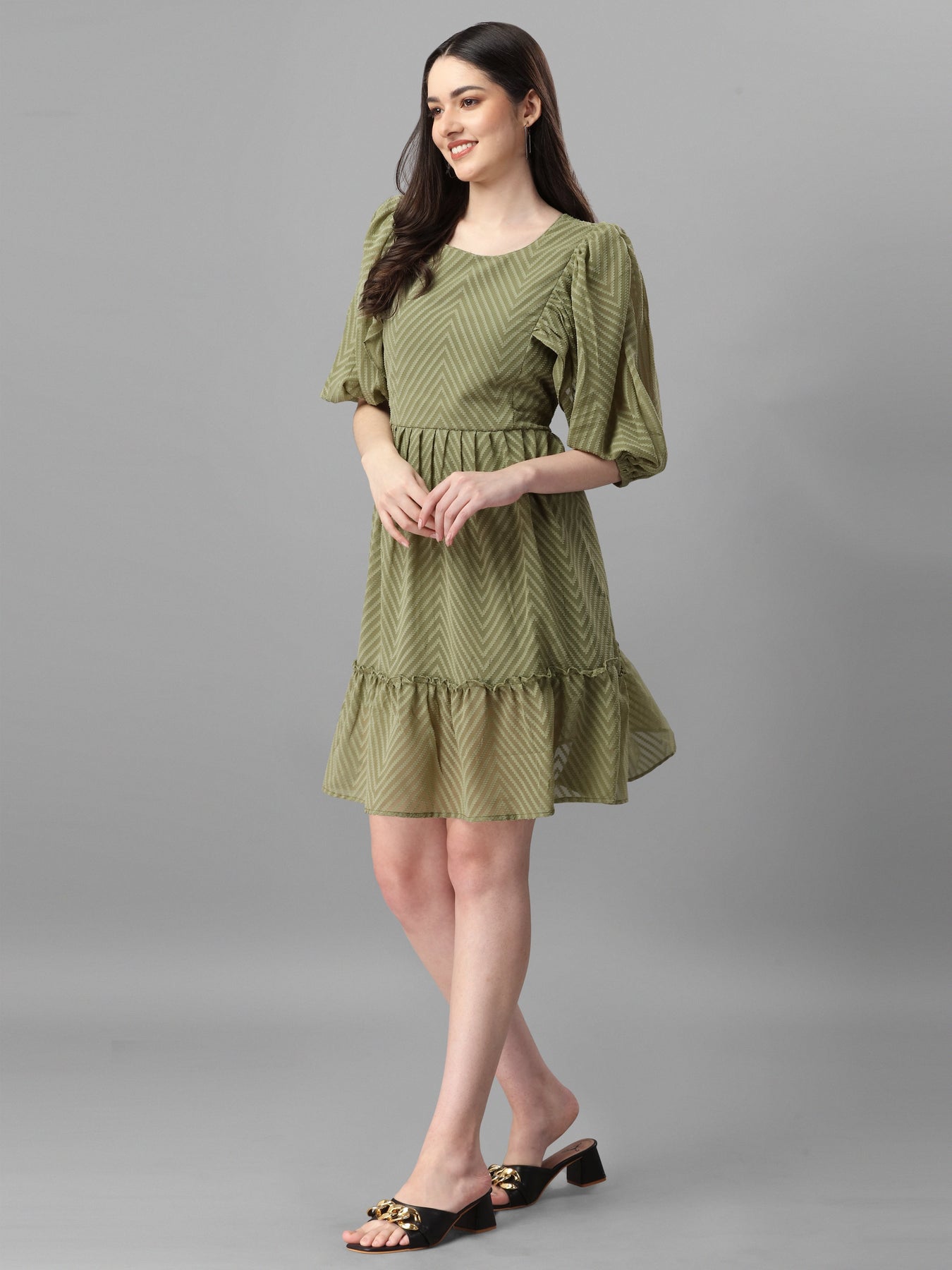 Women's Dobby Pattern Georgette Puffed Sleeves Flared Knee Length Dress (Olive)
